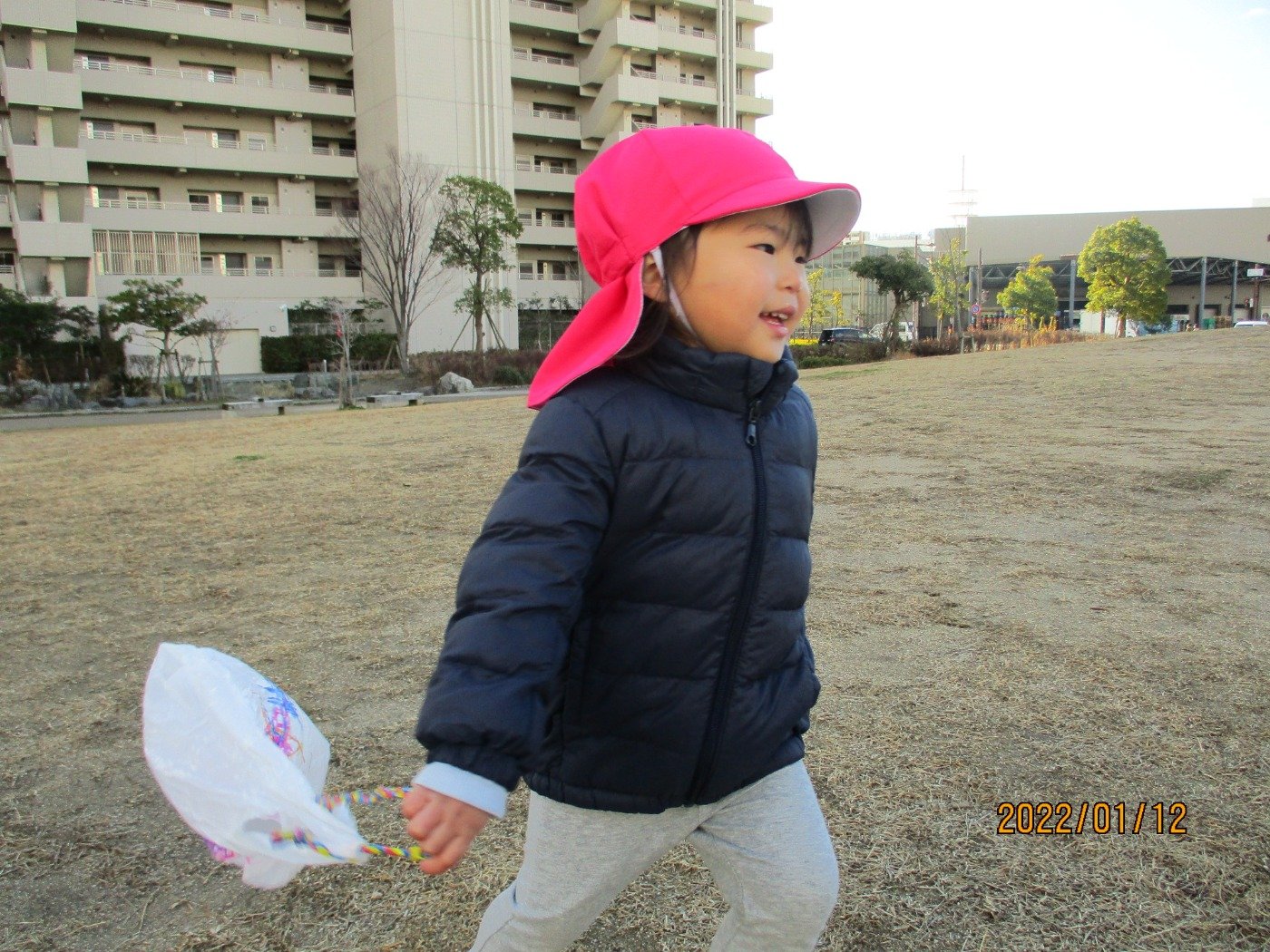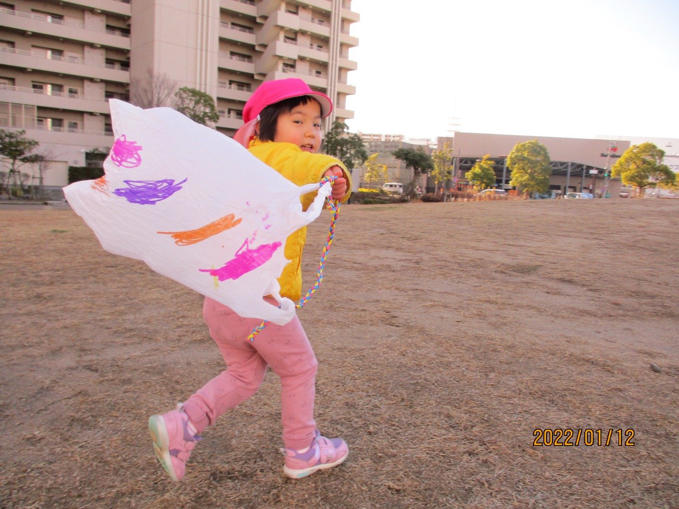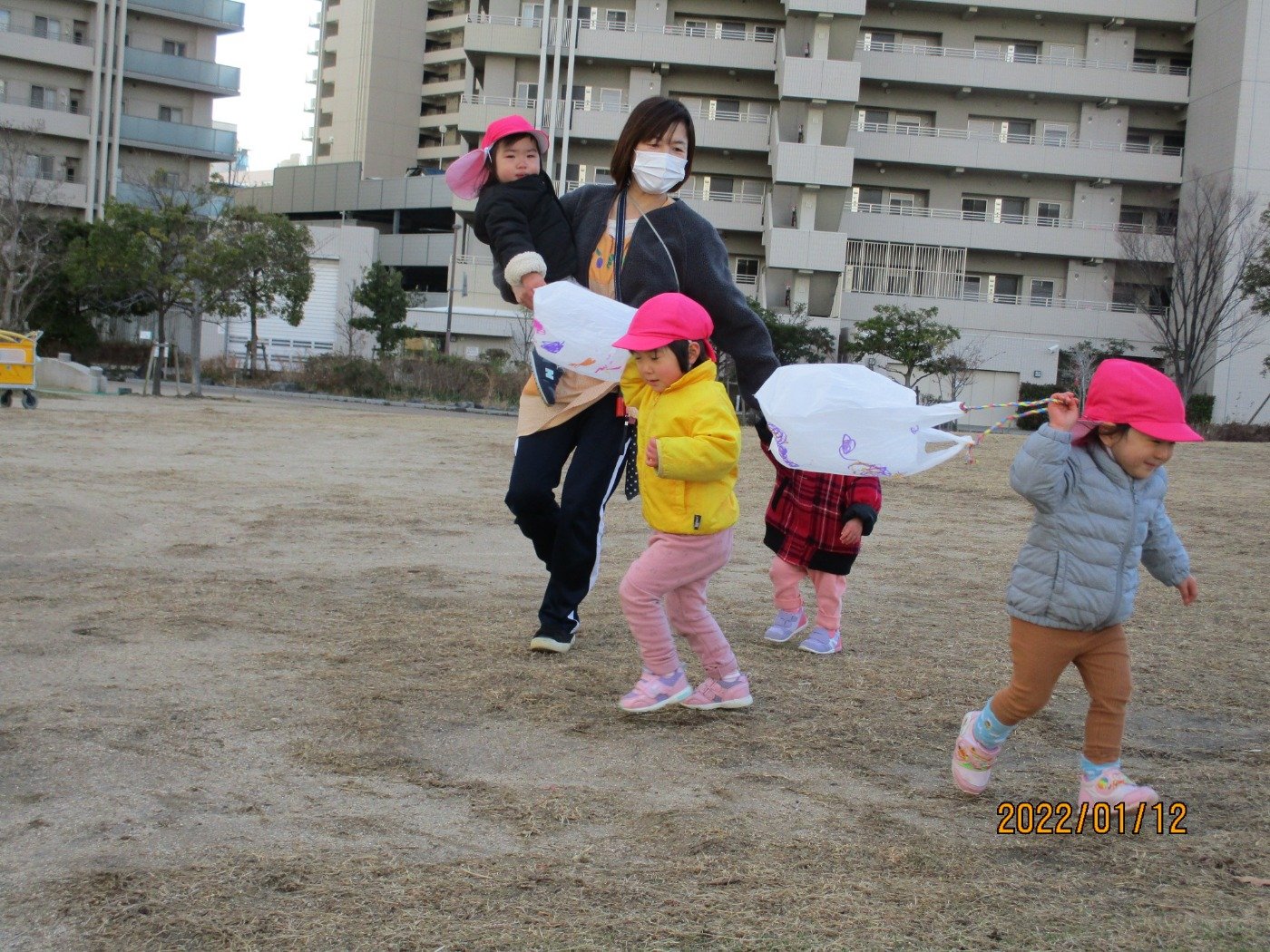 お正月あそび♪ ホームブログ 2022.01.12 うさぎぐみさんとにじぐみさんと一緒にお正月遊びを楽しみました♪ 先生のお話を聞く顔も真剣!! 子ども達も何をするのかな・・・・と興味津々とわくわくと とってもいいお顔😊 ビニール袋で作った凧を・・・せーの!! で走って凧あげを楽しみました♪ なかなか経験することが少なくなってきたお正月遊びを 子ども達と一緒に経験できるような機会を沢山作りたいと思います。