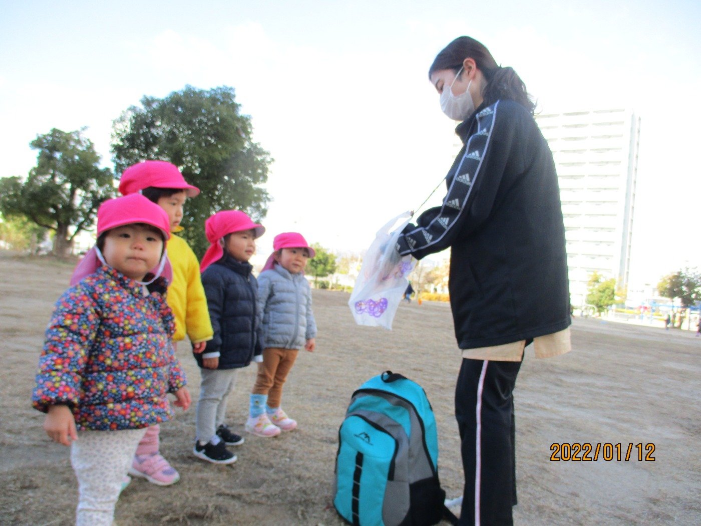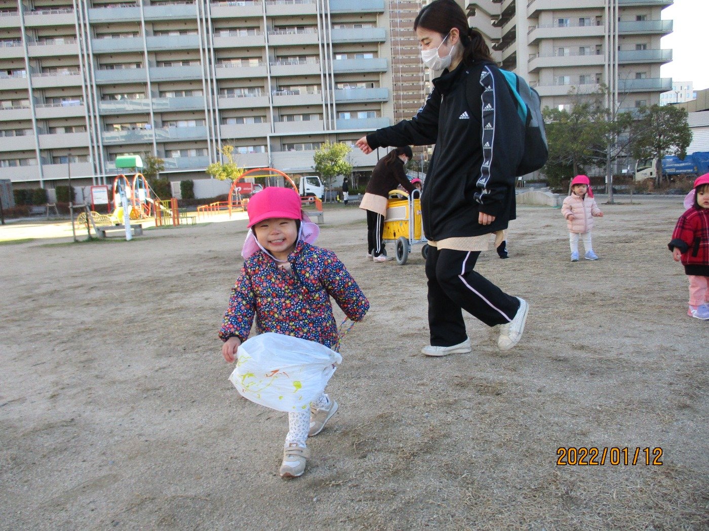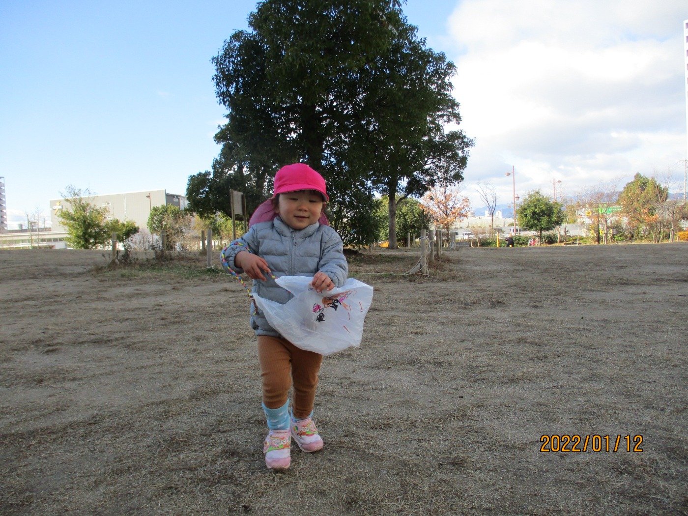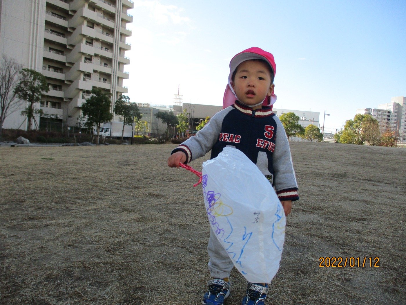 お正月あそび♪ ホームブログ 2022.01.12 うさぎぐみさんとにじぐみさんと一緒にお正月遊びを楽しみました♪ 先生のお話を聞く顔も真剣!! 子ども達も何をするのかな・・・・と興味津々とわくわくと とってもいいお顔😊 ビニール袋で作った凧を・・・せーの!! で走って凧あげを楽しみました♪ なかなか経験することが少なくなってきたお正月遊びを 子ども達と一緒に経験できるような機会を沢山作りたいと思います。