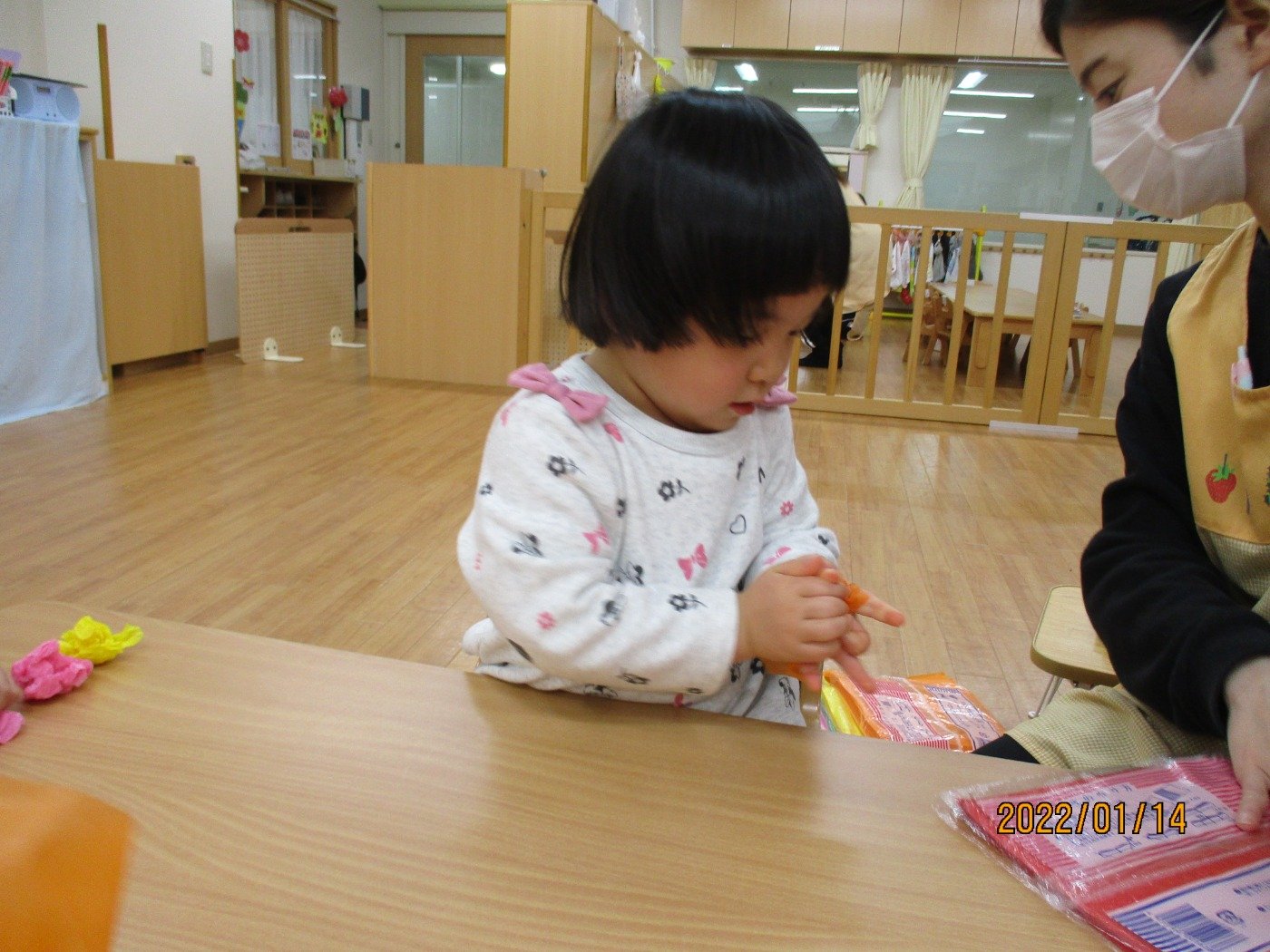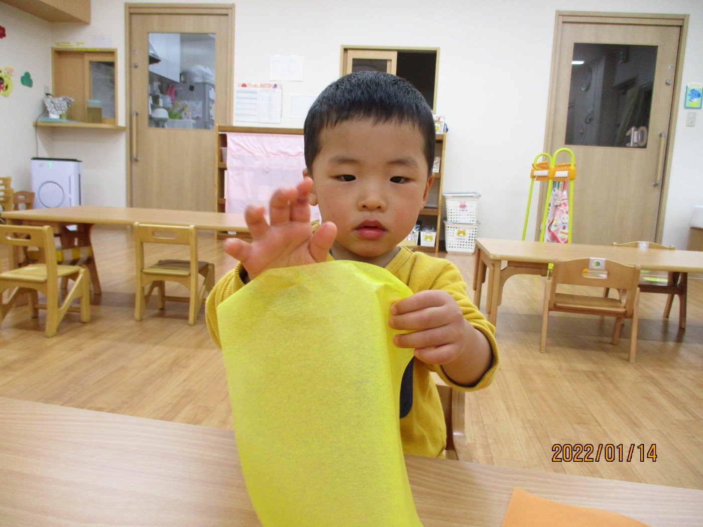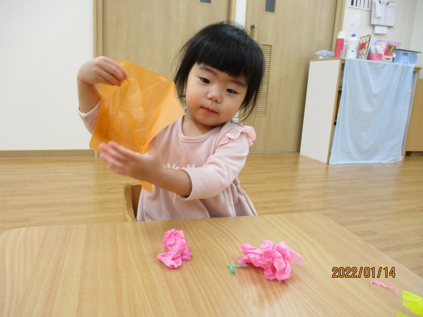 うさぎぐみさん ホームブログ 2022.01.14 うさぎぐみさん 今日は、はながみを。。。丸めて、まるめて 何を作ってるのかな? 1月の制作もとっても楽しいことをお友だちと一緒に参加しています。 今日の丸めては、何に変身するのかな?