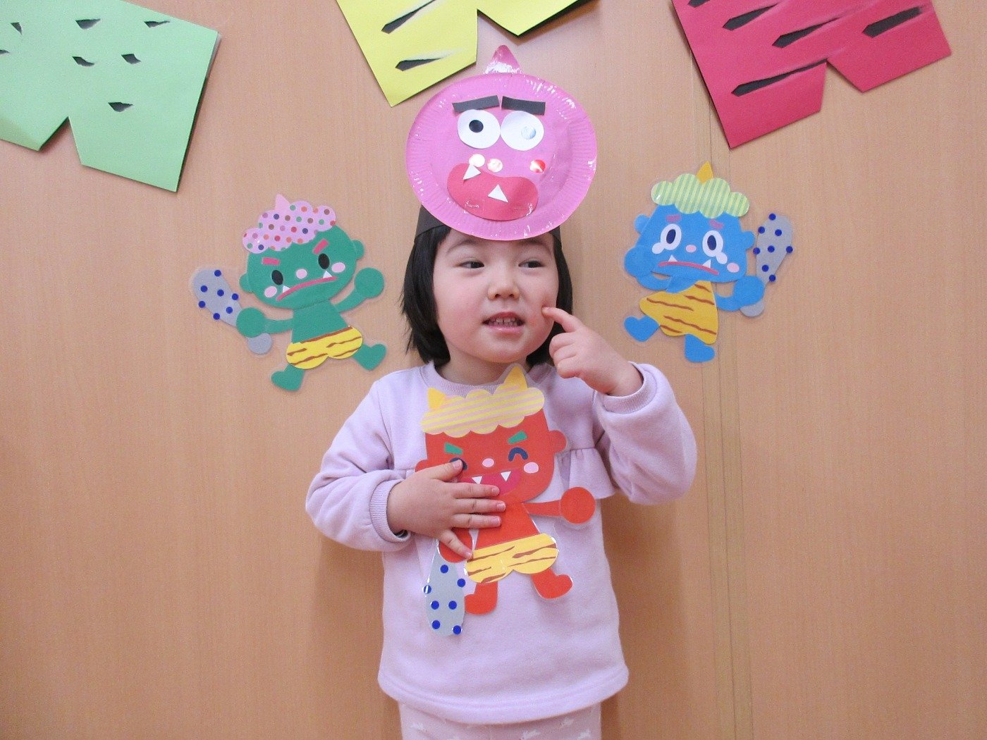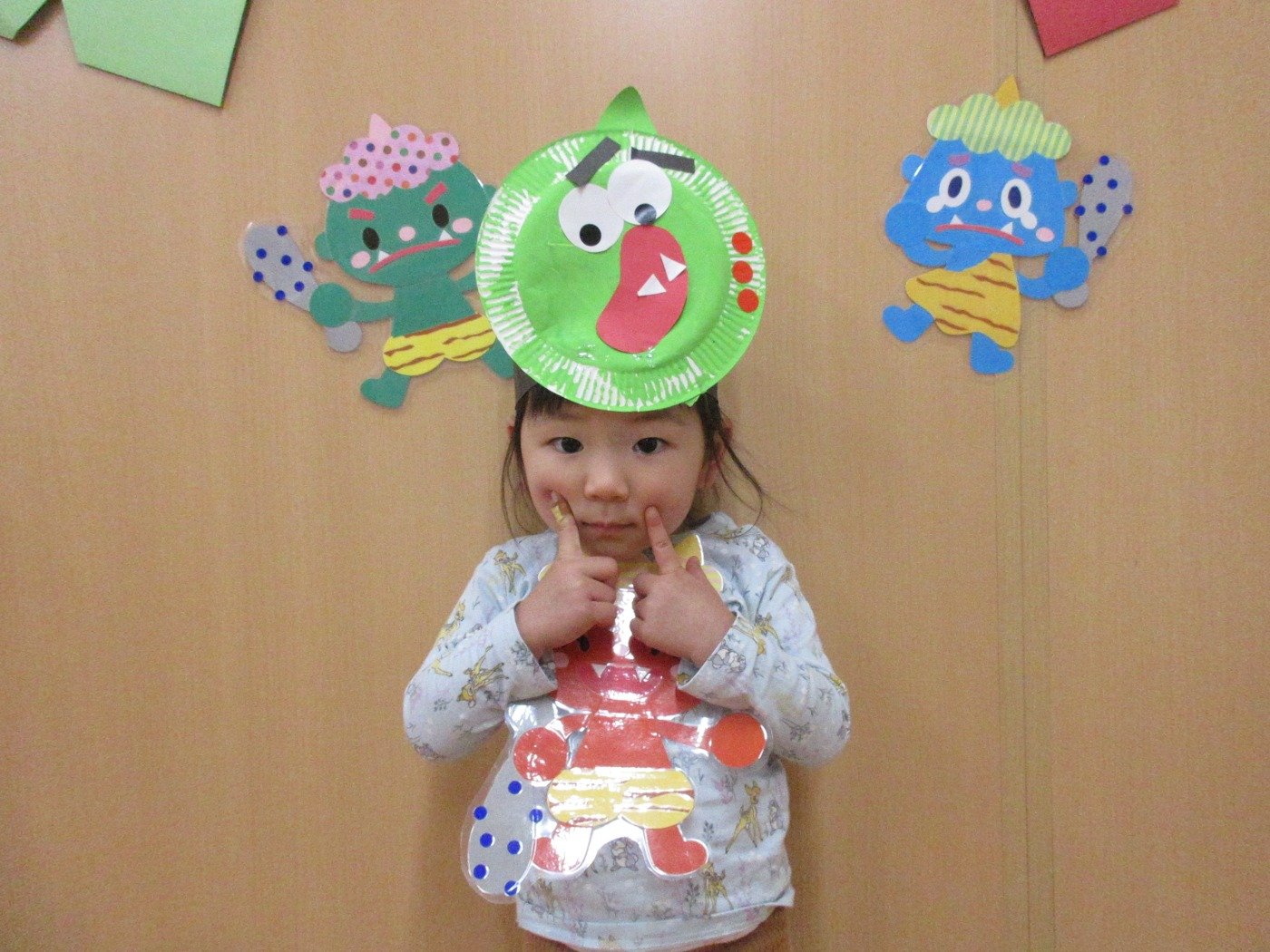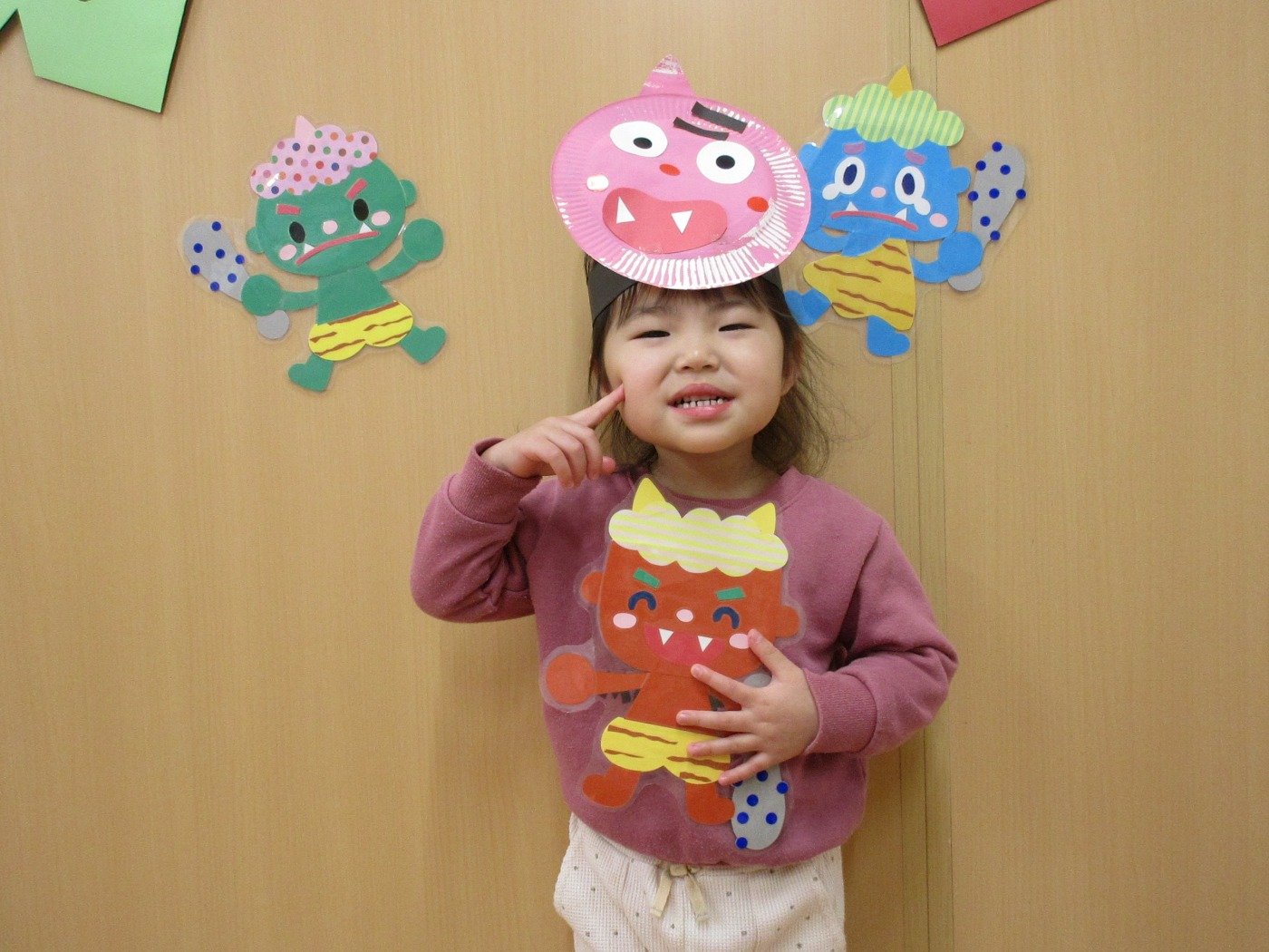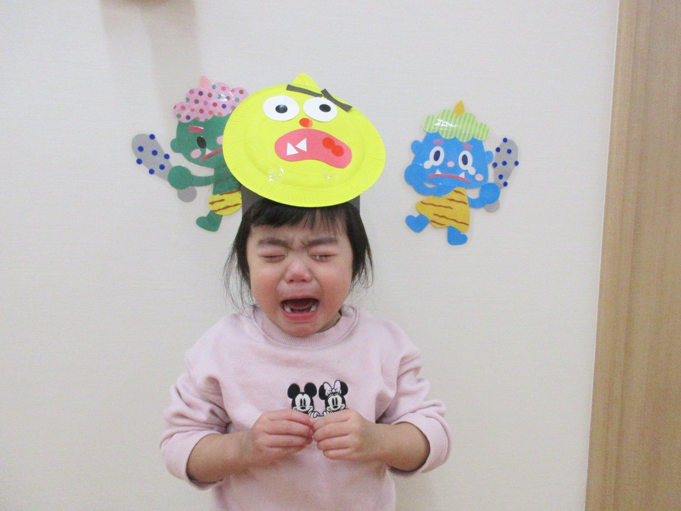 うさぎぐみさん ホームブログ 2022.02.02 今日は お部屋で、お絵描き の前に明日に備えて「おに」のお面をかぶり 準備!! 喜ぶお友だち びっくりして、泣いちゃうお友だち 明日は、どんな感じになるのかな?