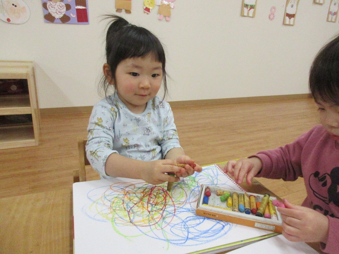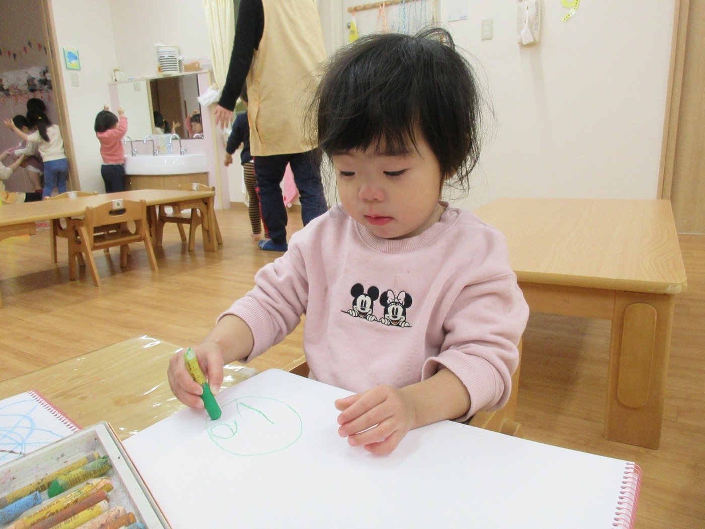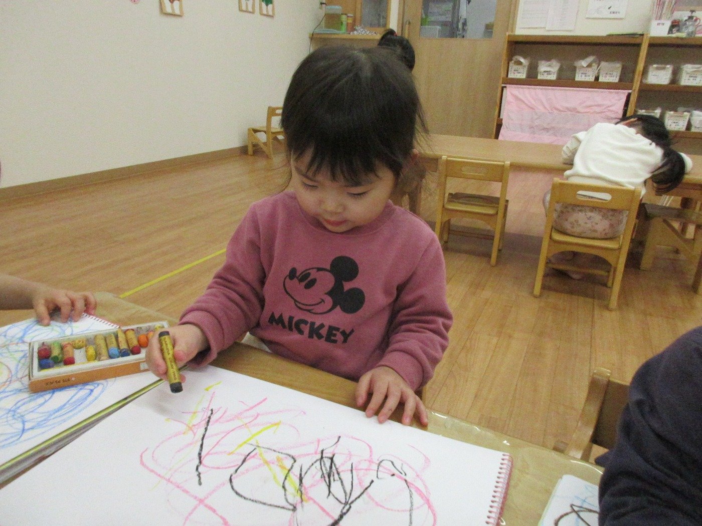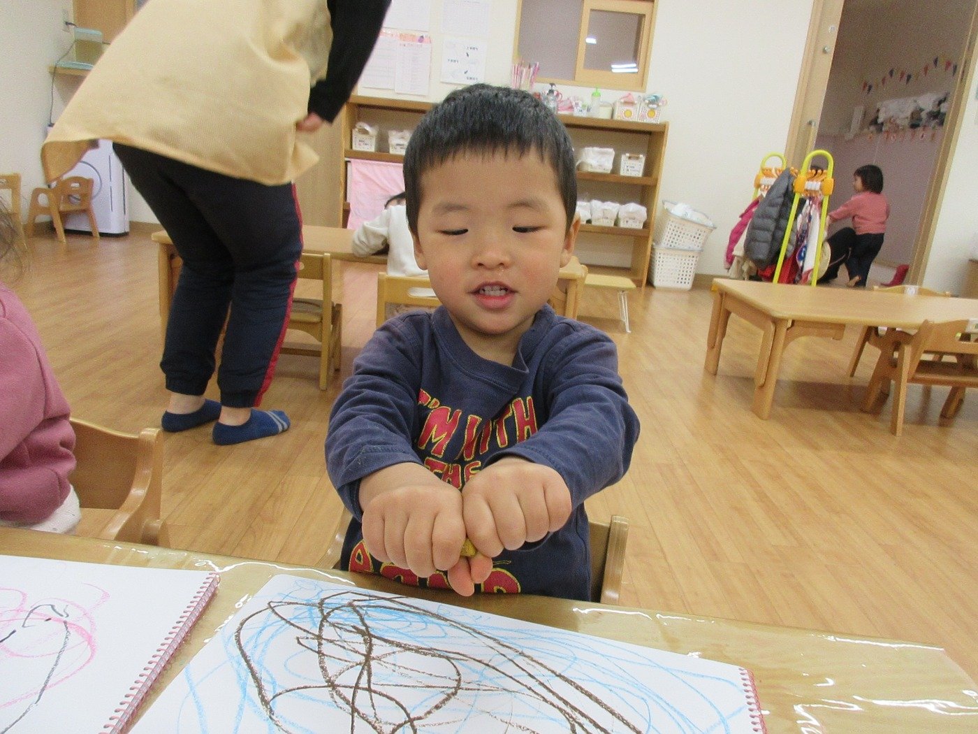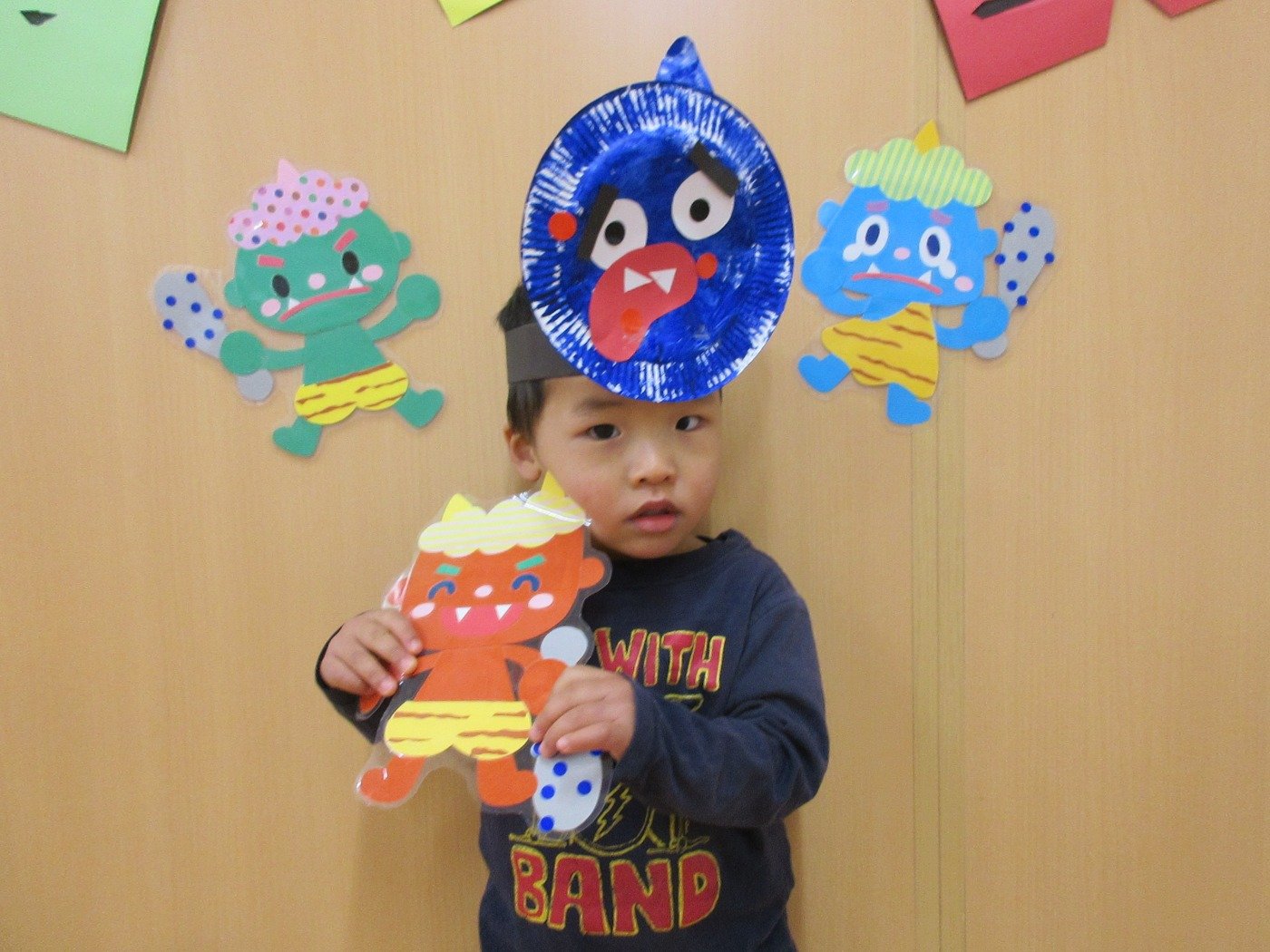 うさぎぐみさん ホームブログ 2022.02.02 今日は お部屋で、お絵描き の前に明日に備えて「おに」のお面をかぶり 準備!! 喜ぶお友だち びっくりして、泣いちゃうお友だち 明日は、どんな感じになるのかな?