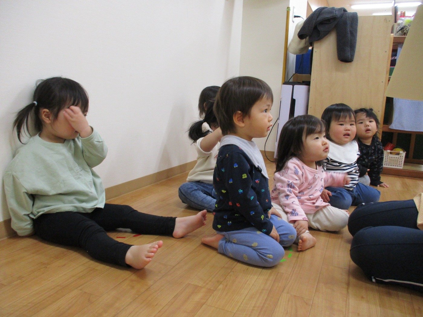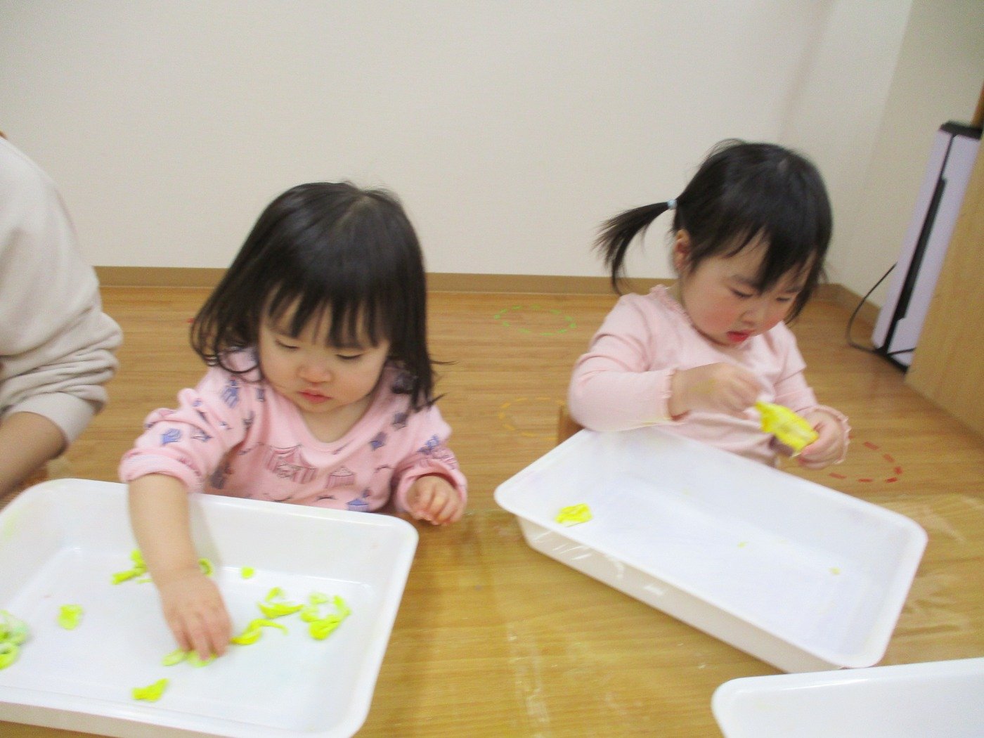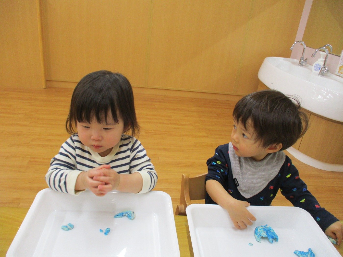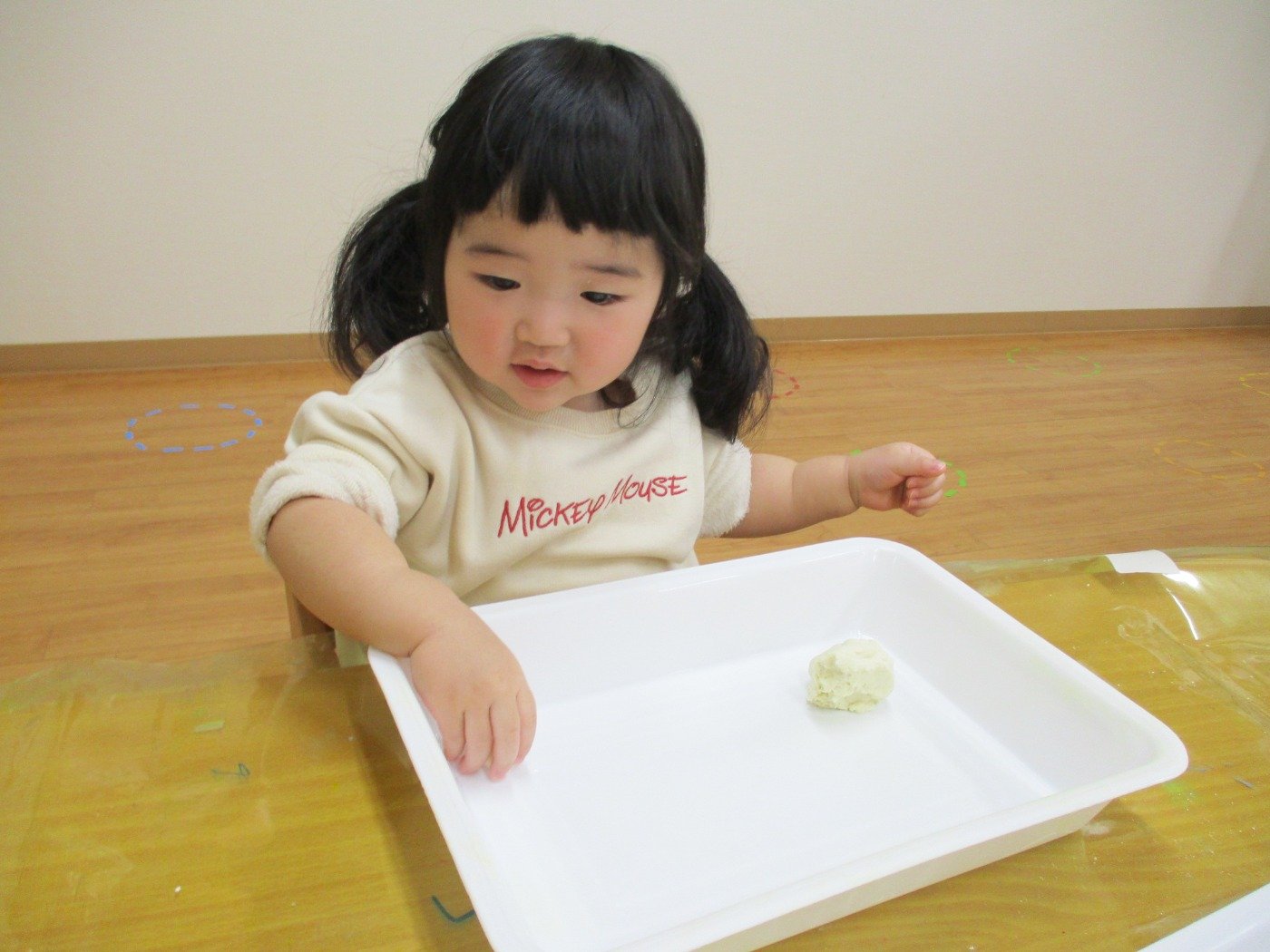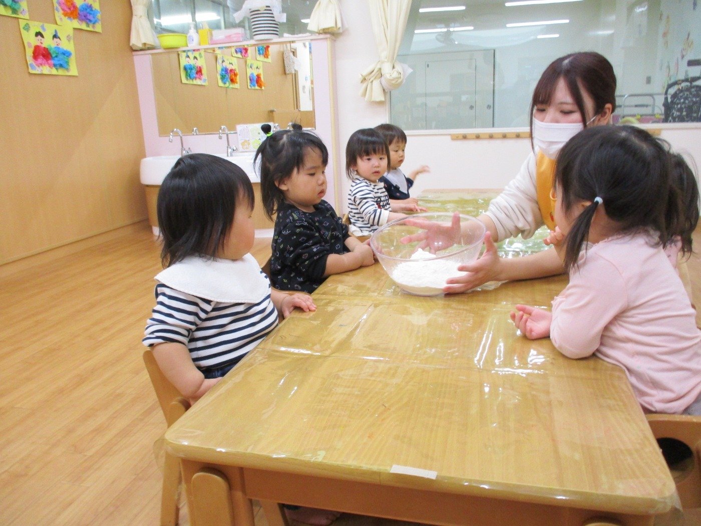 子ども達も興味津々で小麦粉粘土をみています・・・・