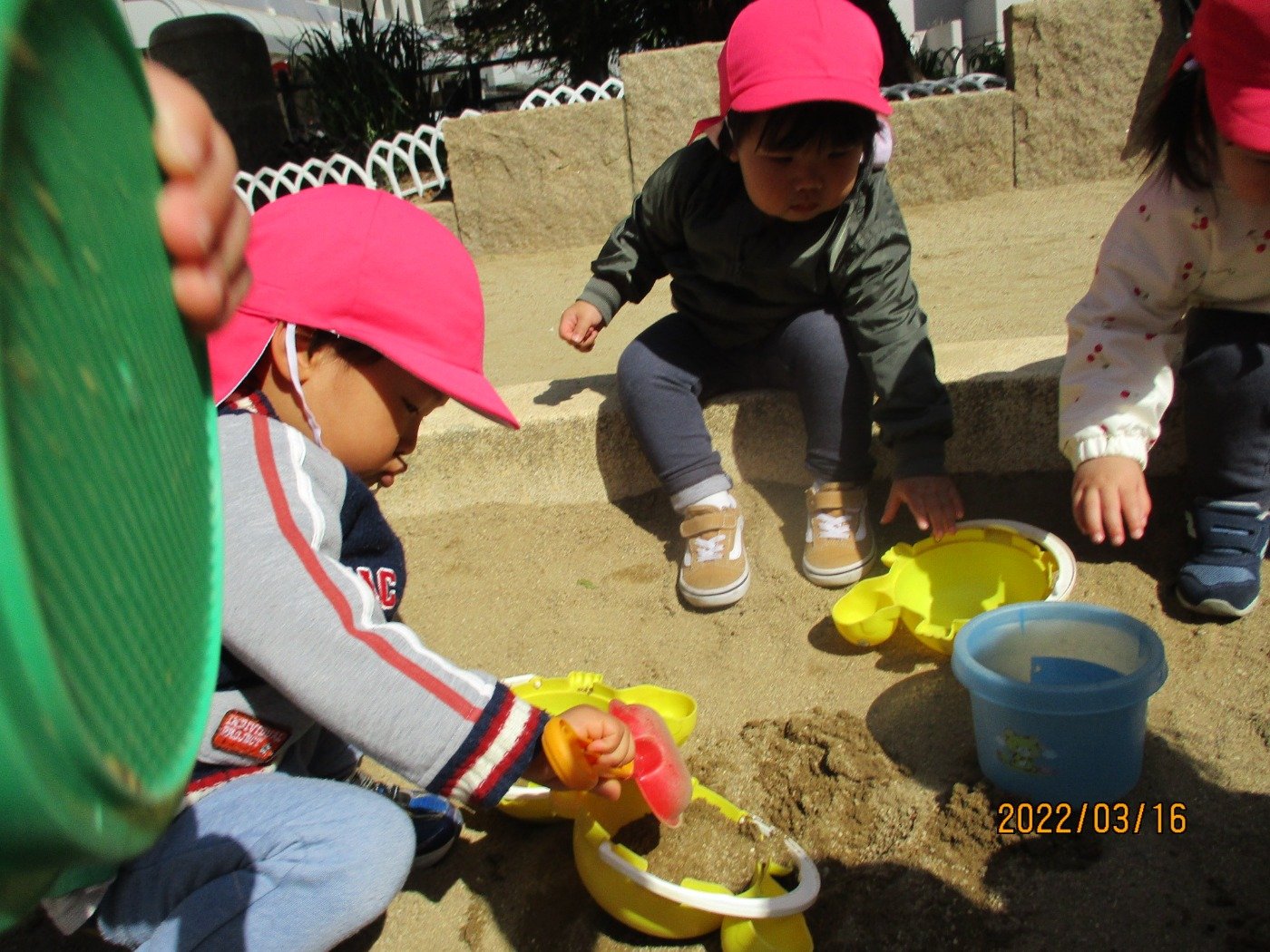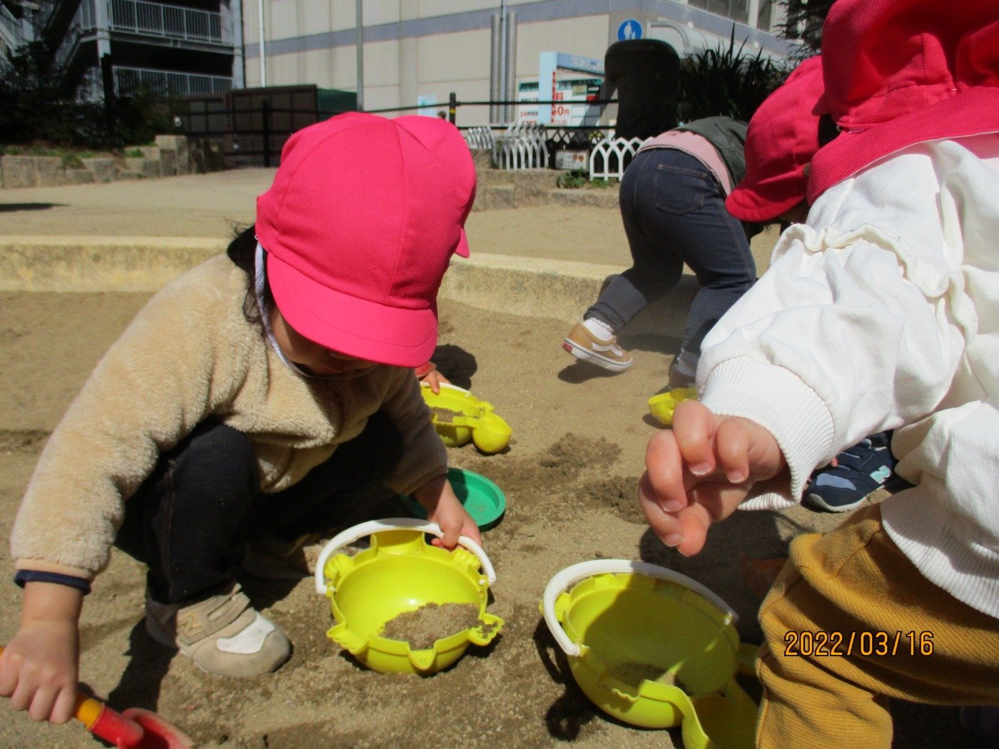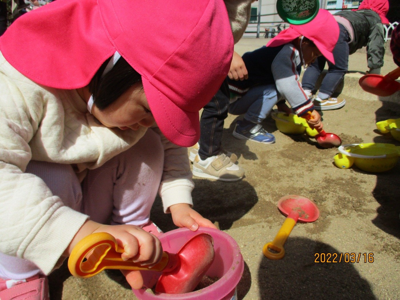 うさぎぐみさん ホームブログ 2022.03.16 川田公園でお砂場遊び!! 子ども達は、お友だちと手を繋いで出発😊 たくさん砂場で遊んで。。。しっかり歩いて たくさんの「すな」と一緒に帰ってきたうさぎぐみさん 楽しかった様子がわかります。 たくさん遊んで、美味しい給食ももりもり食べてくれていました。