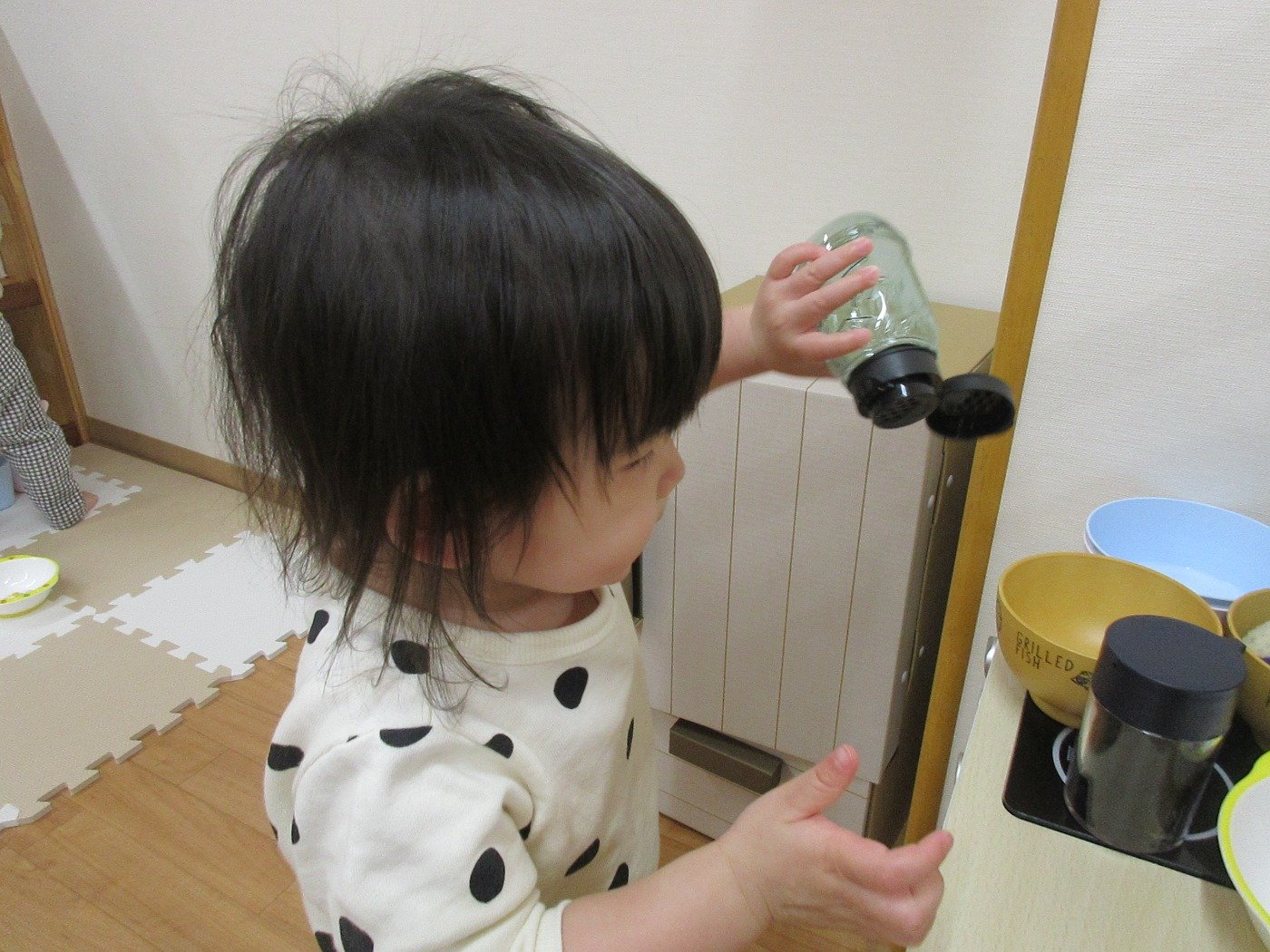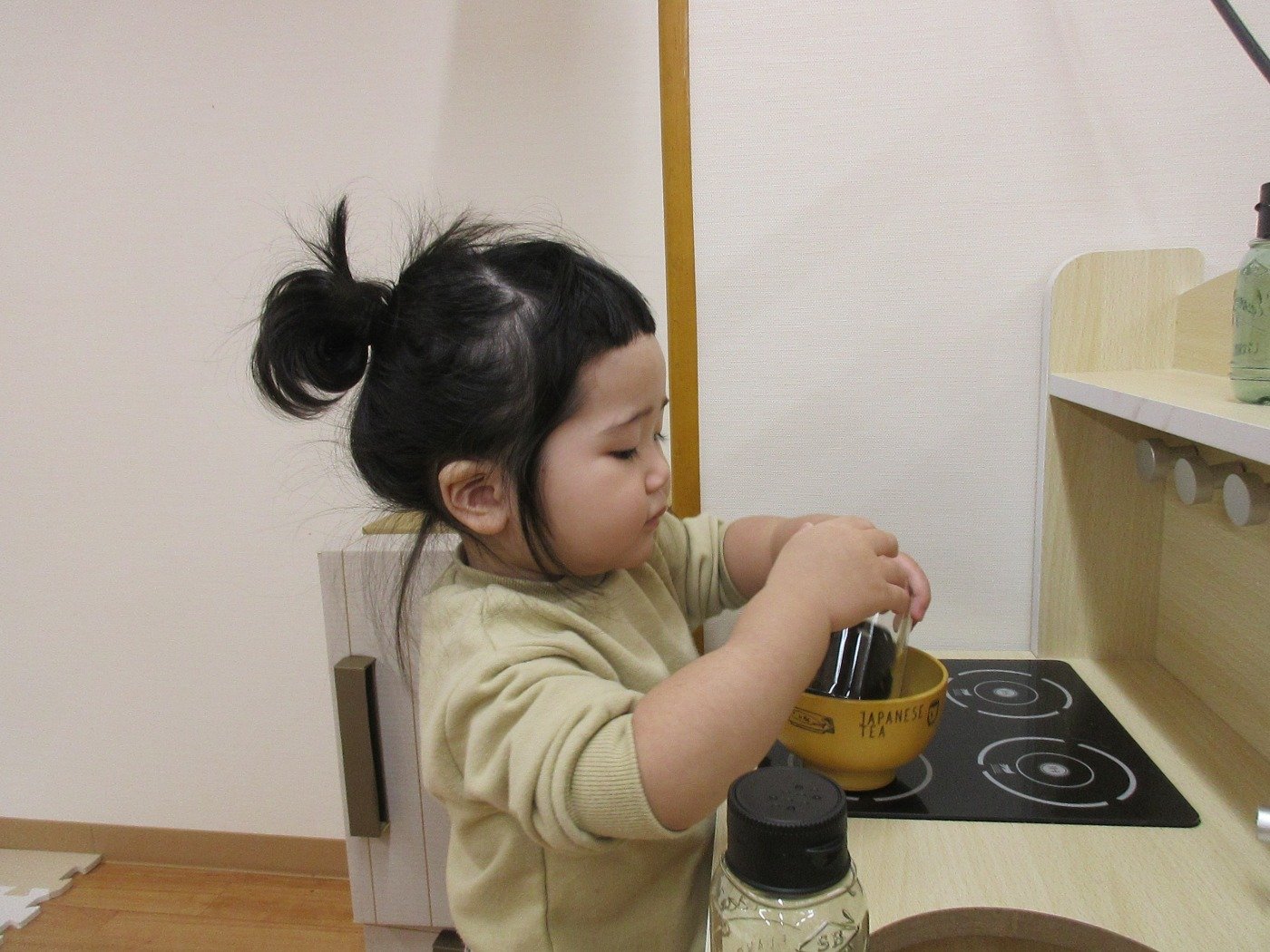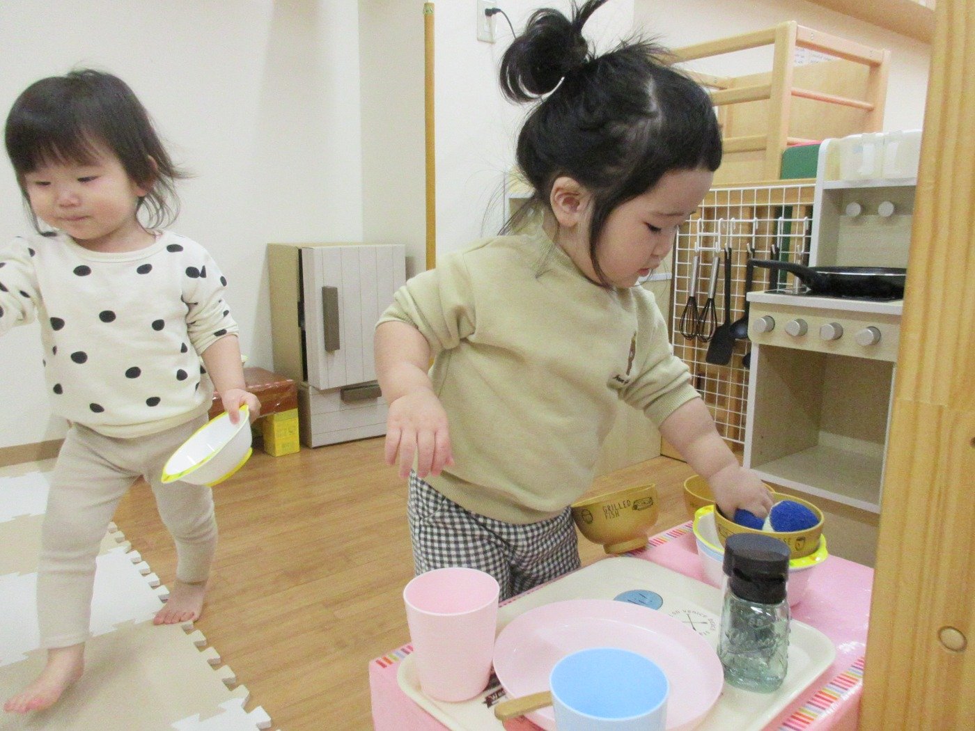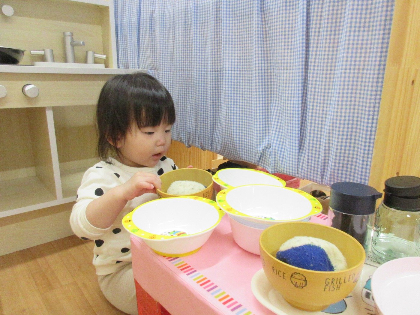 ひよこぐみさん ホームブログ 2022.03.17 お部屋の環境構成をかえてました😊 子ども達は、ままごと 机上遊びとそれぞれ好きな遊びを存分に楽しんでいます。 子ども達もお料理するのに 大忙し!! 味付けして、、、おさらにのせて とっても美味しそうなご飯が出来ました。