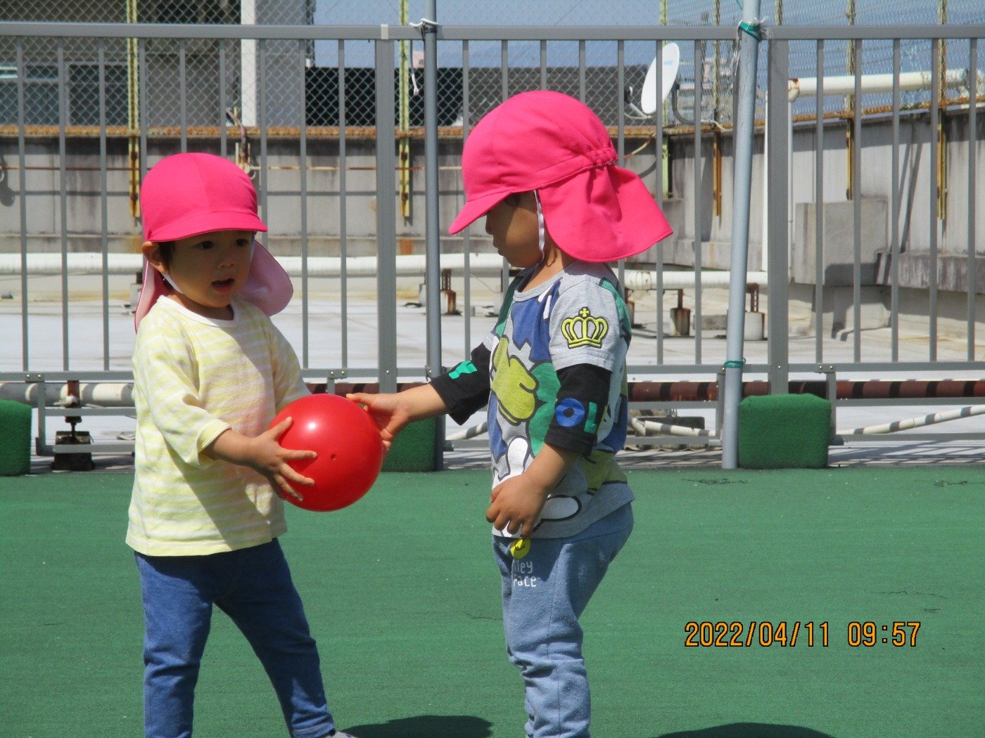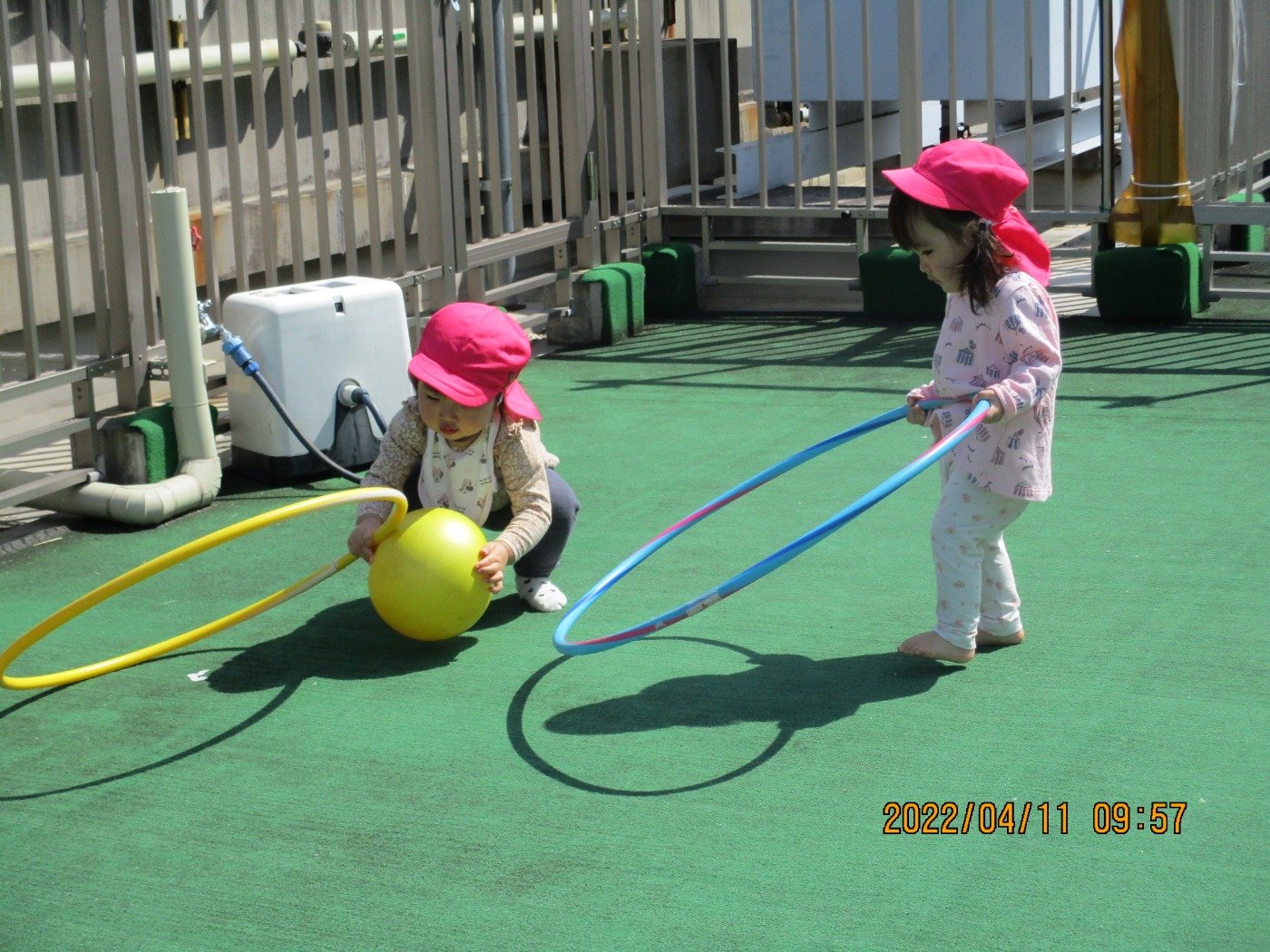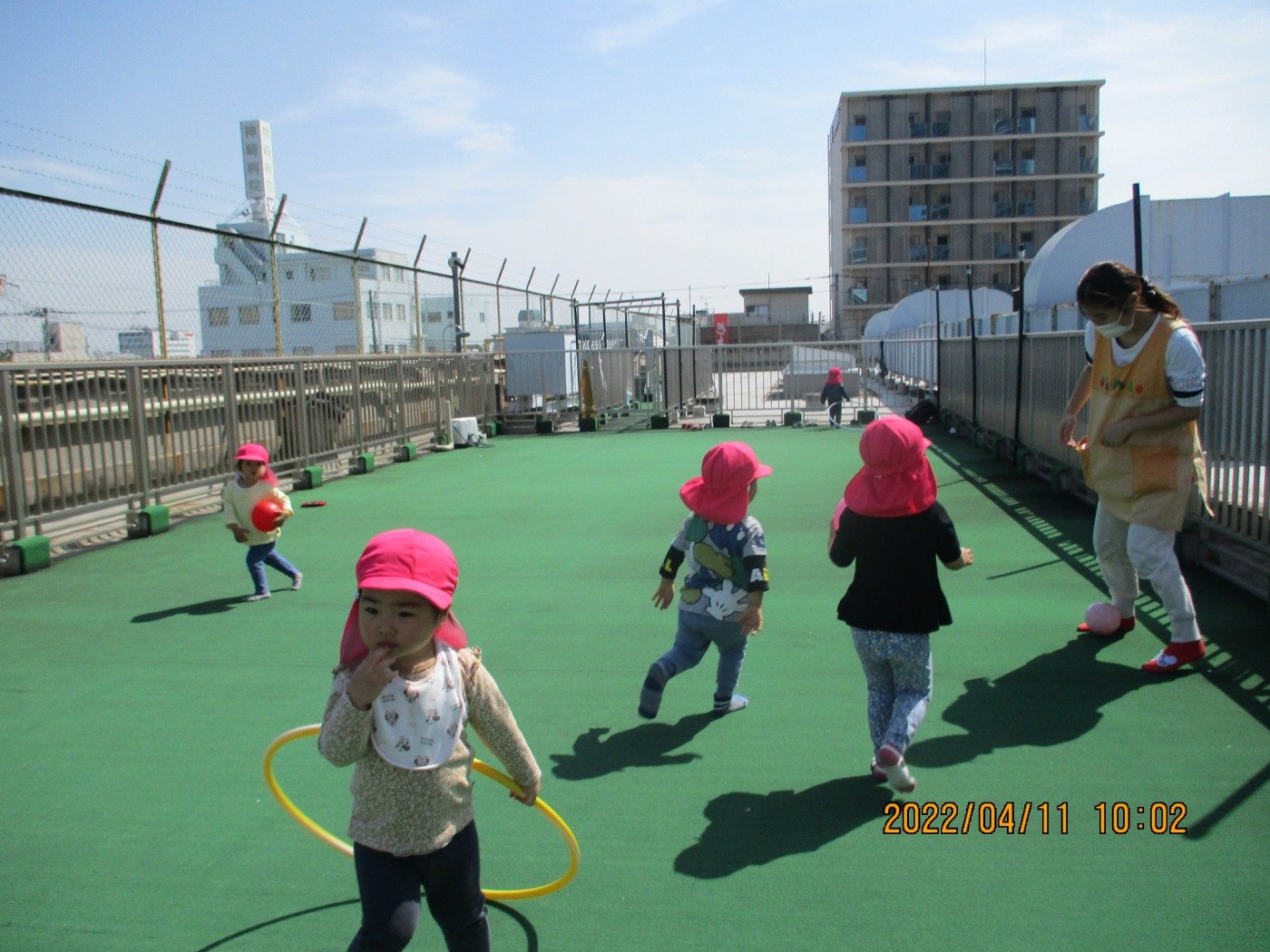 くまぐみさん ホームブログ 2022.04.11 今日は屋上でお友だちと一緒にフープやボールで 走って走って たくさん、体を動かして遊びました♫ 子ども達の体力は想像以上! 先生も子ども達も暑かったぁーーー と・・・・ とってもいい笑顔で帰ってきました😊