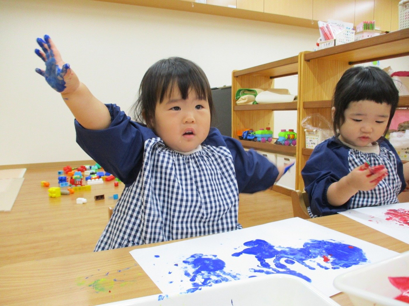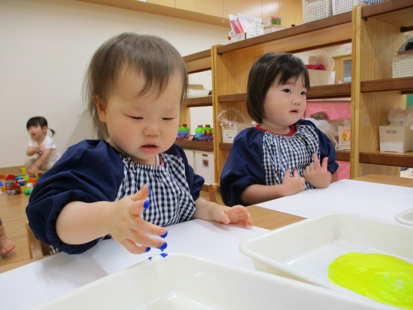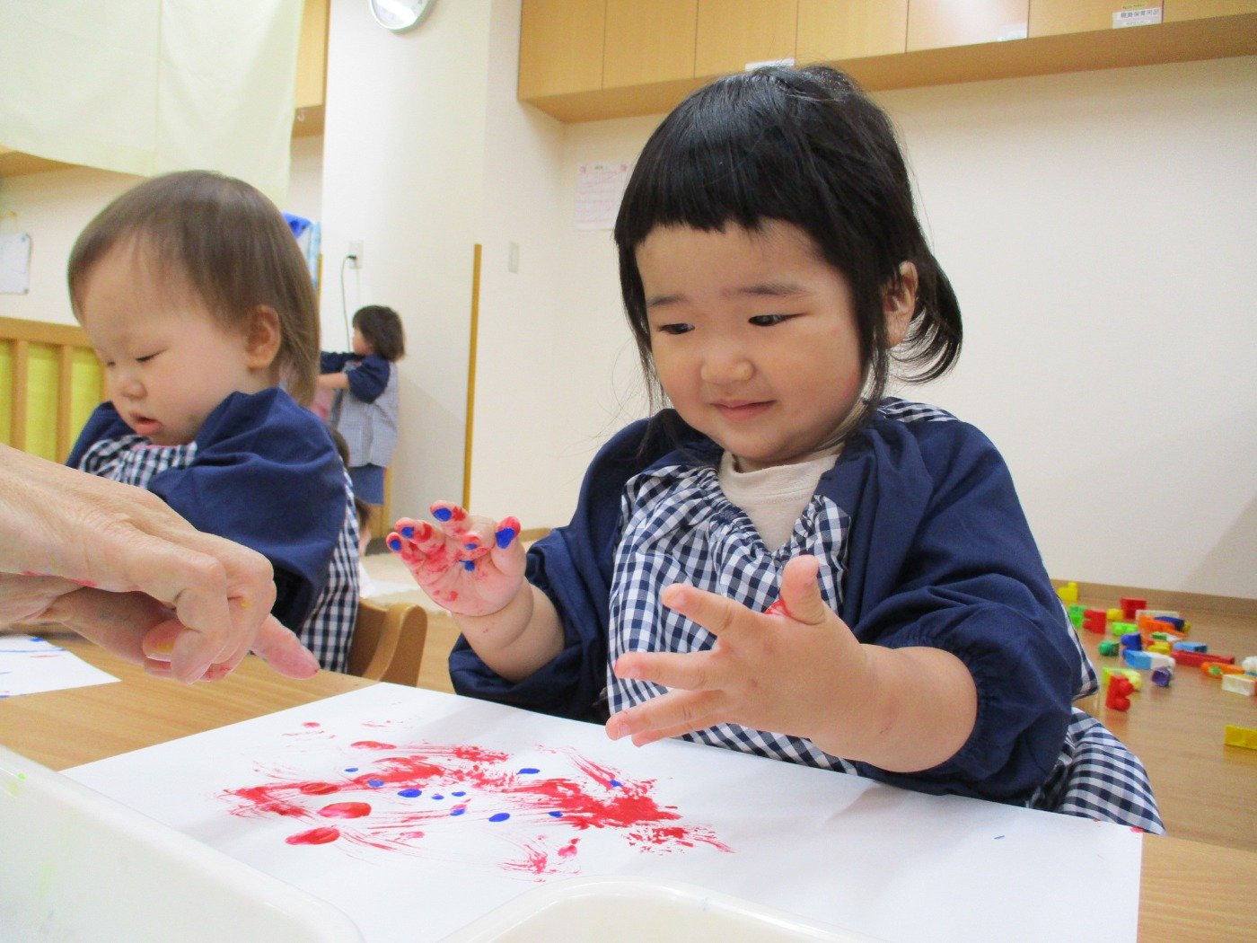 うさぎぐみさん ホームブログ 2022.06.06 今週も元気いっぱいに登園してくれたうさぎぐみさん♪ お部屋で、はじめての「えのぐ」を経験 お友だち、みんな一緒のスモッグを着て・・・ さぁー絵の具を触って ぺたぺた おそる、おそるのお友だちや 絵の具の感触にびっくり!!のお友だちと 様々な表情がみられました。。。 おともだちや、先生とたくさん色々なこと経験しようね 新聞遊びもとってもかわいかったうさぎぐみさんです♪