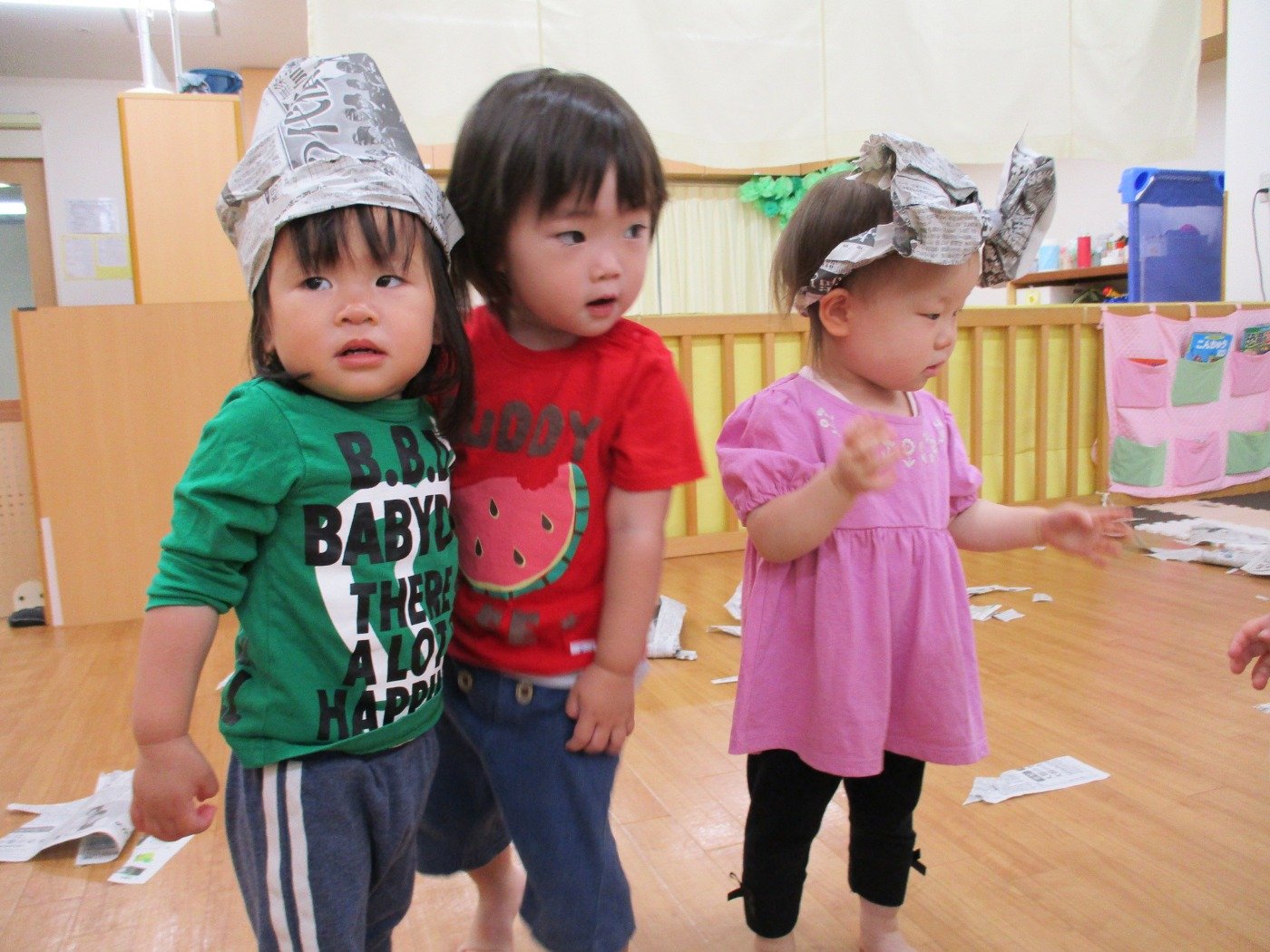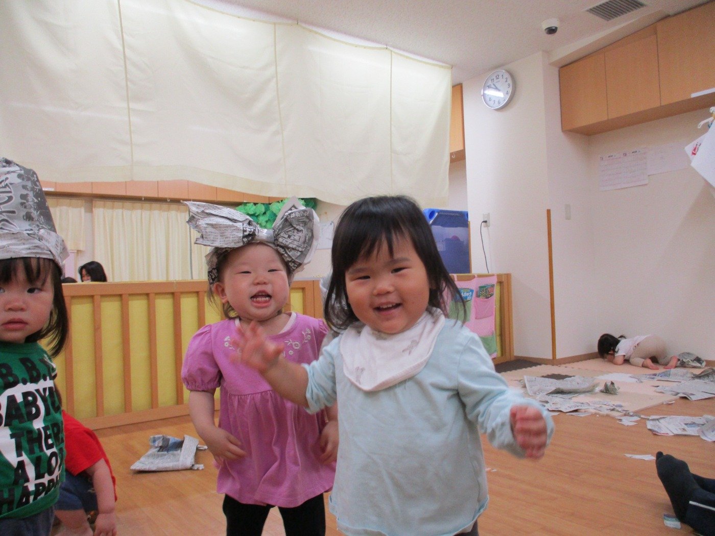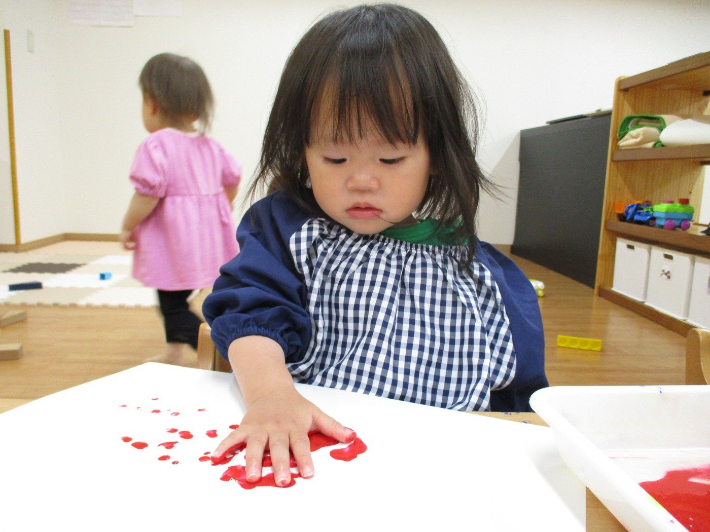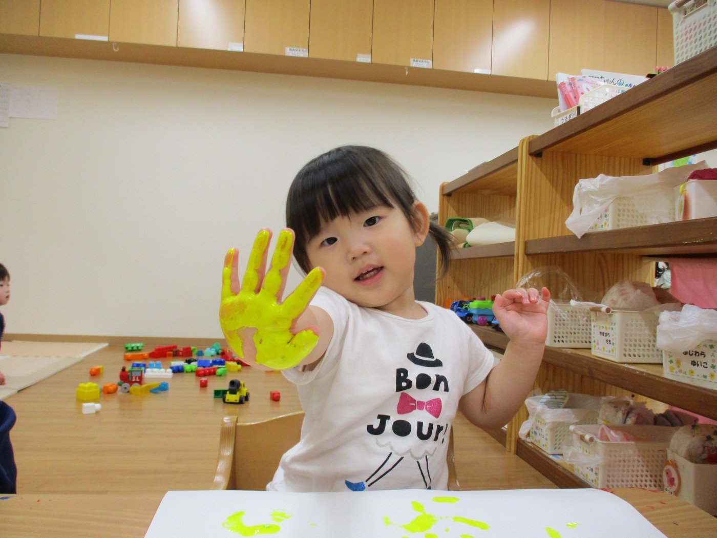 うさぎぐみさん ホームブログ 2022.06.06 今週も元気いっぱいに登園してくれたうさぎぐみさん♪ お部屋で、はじめての「えのぐ」を経験 お友だち、みんな一緒のスモッグを着て・・・ さぁー絵の具を触って ぺたぺた おそる、おそるのお友だちや 絵の具の感触にびっくり!!のお友だちと 様々な表情がみられました。。。 おともだちや、先生とたくさん色々なこと経験しようね 新聞遊びもとってもかわいかったうさぎぐみさんです♪