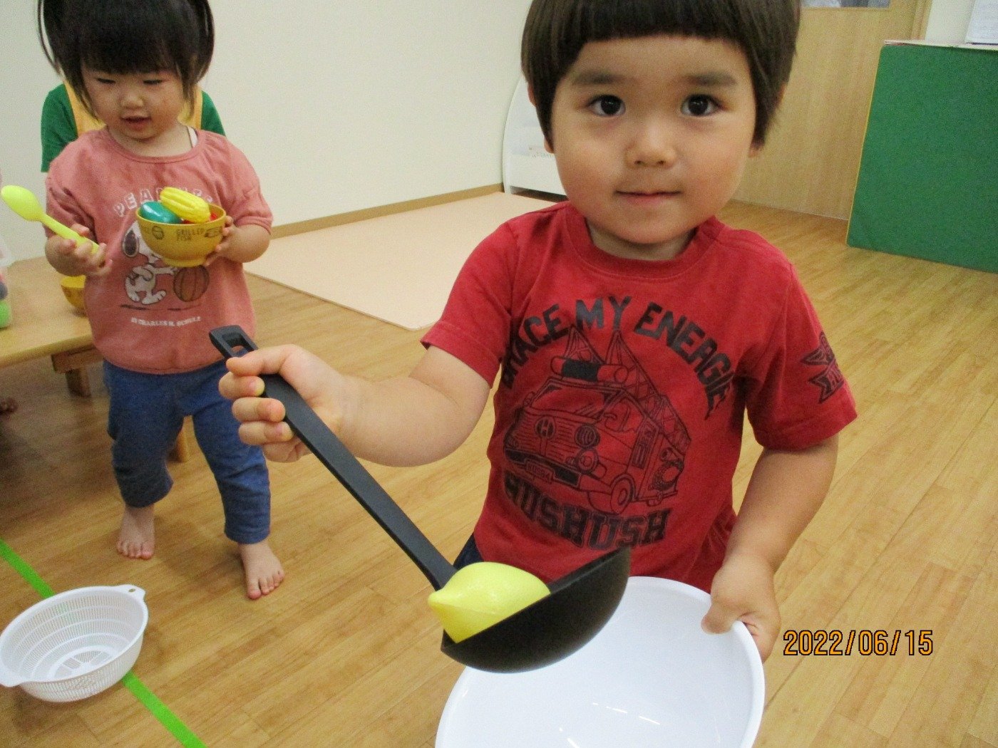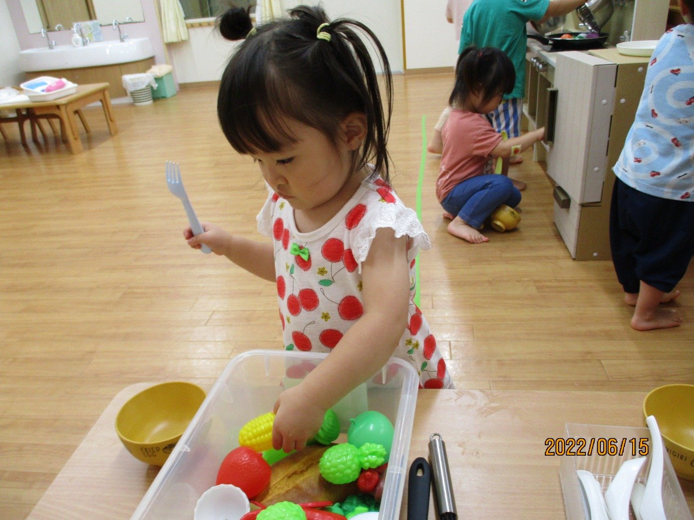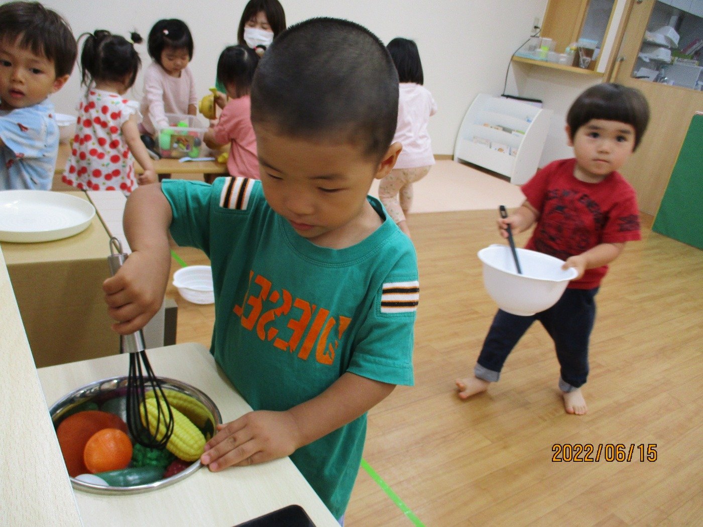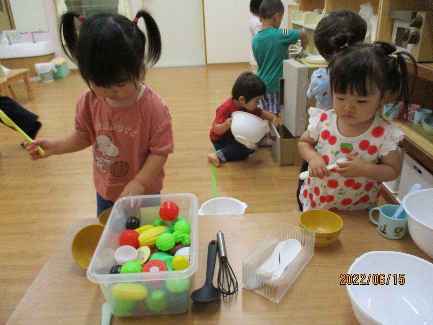 くまぐみさん ホームブログ 2022.06.15 お部屋で、コーナー遊び 子ども達もだいすきな、ままごと とっても上手にお料理して「どーぞ」 をしてくれる、くまぐみさん 最近では、0歳のひよこぐみさんの お世話も積極的にしてくれる姿をみると 微笑ましいです。