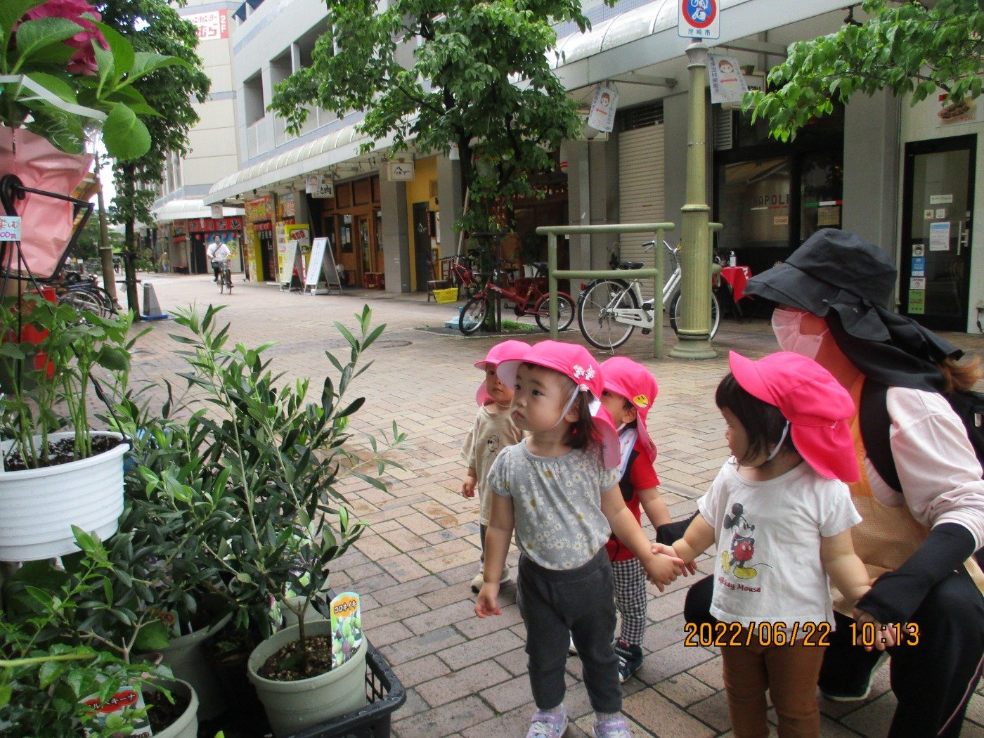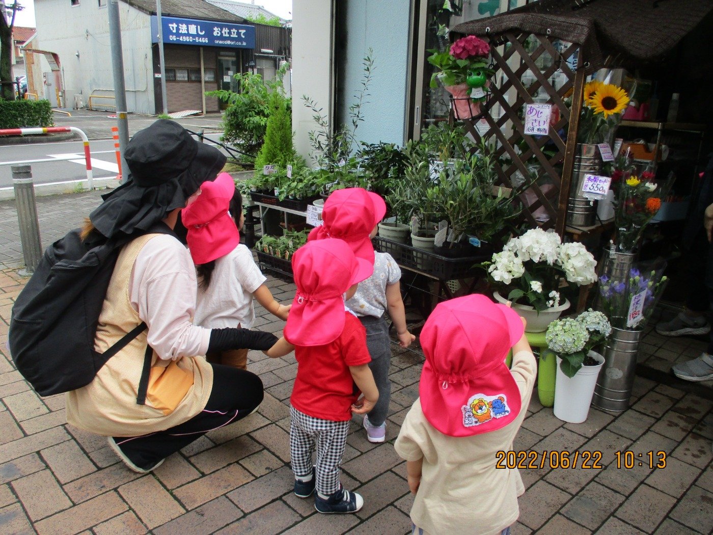 うさぎぐみさん ホームブログ 2022.06.22 梅雨の中の晴 貴重なお天気を堪能しに、商店街へ!! 子ども達にとって季節のお花も、はじめまして😊 そんな、子ども達のはじめましての瞬間を 一緒に過ごせるのはとっても素敵な時間。。。 そんな時間も大切にしていきたいと思います。
