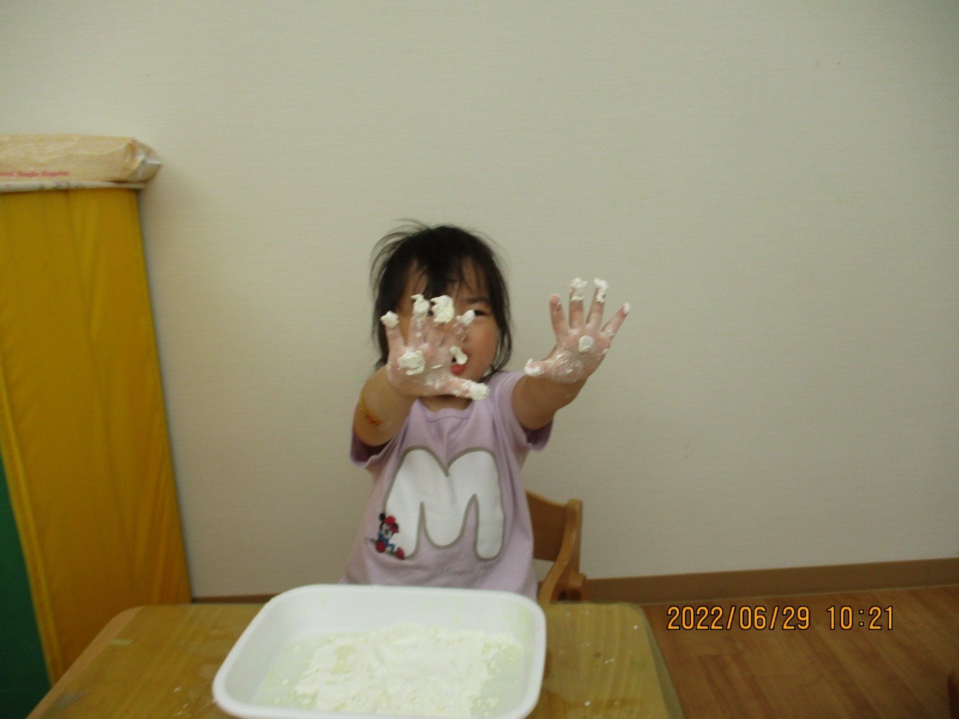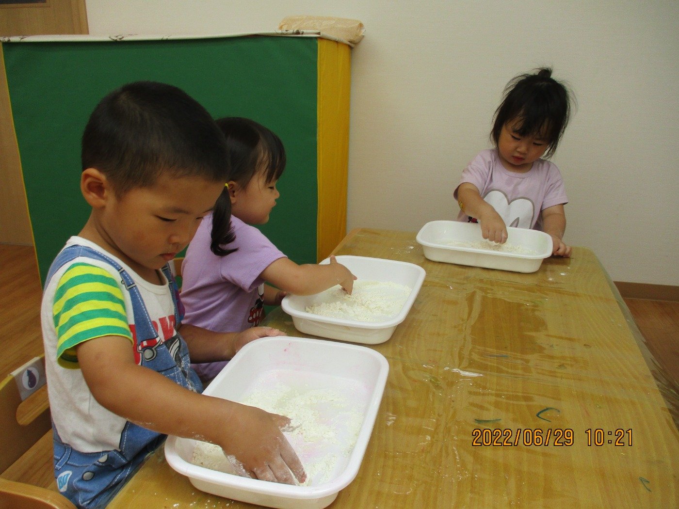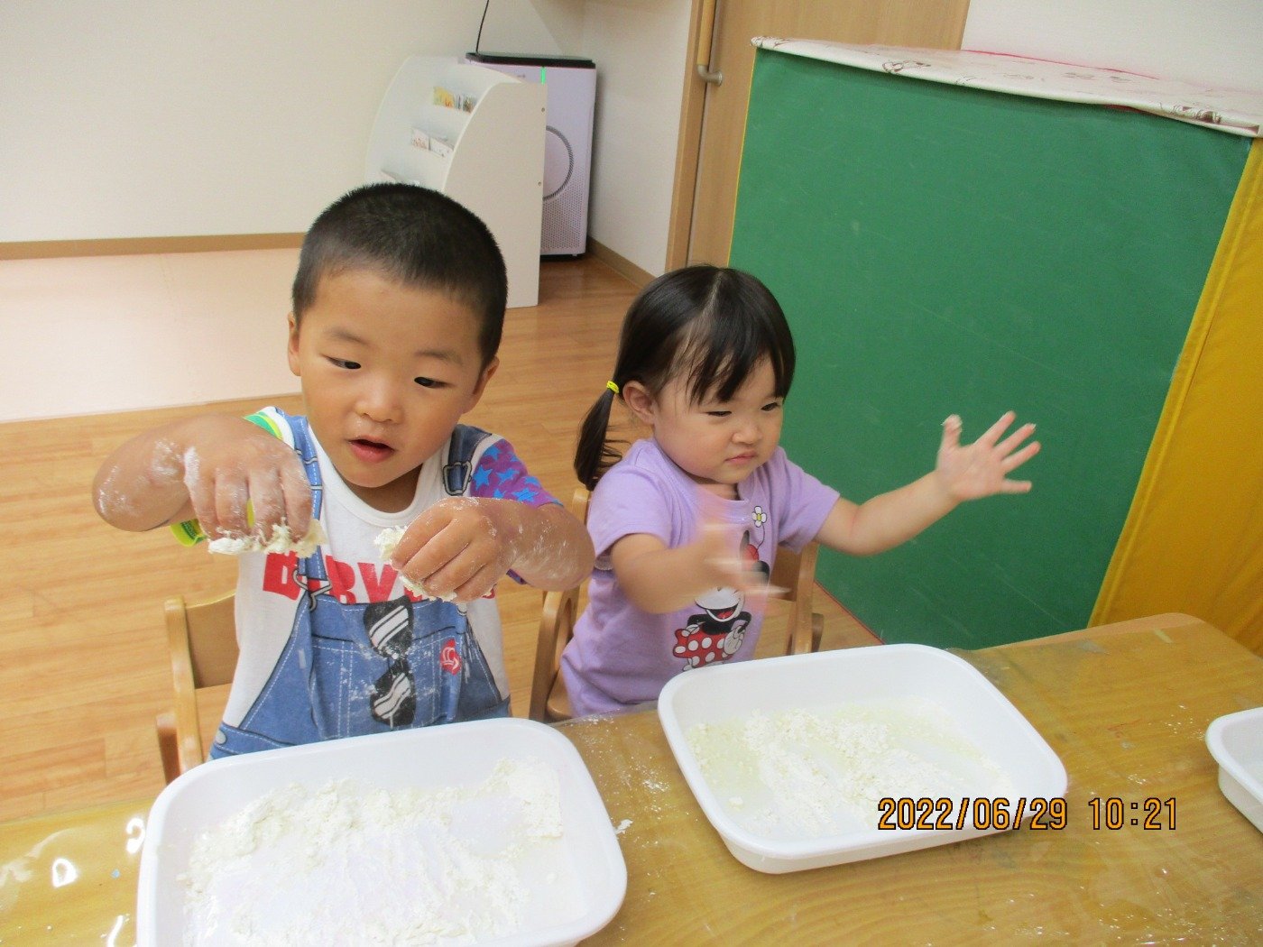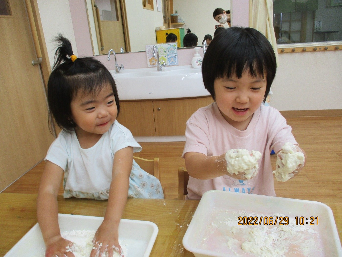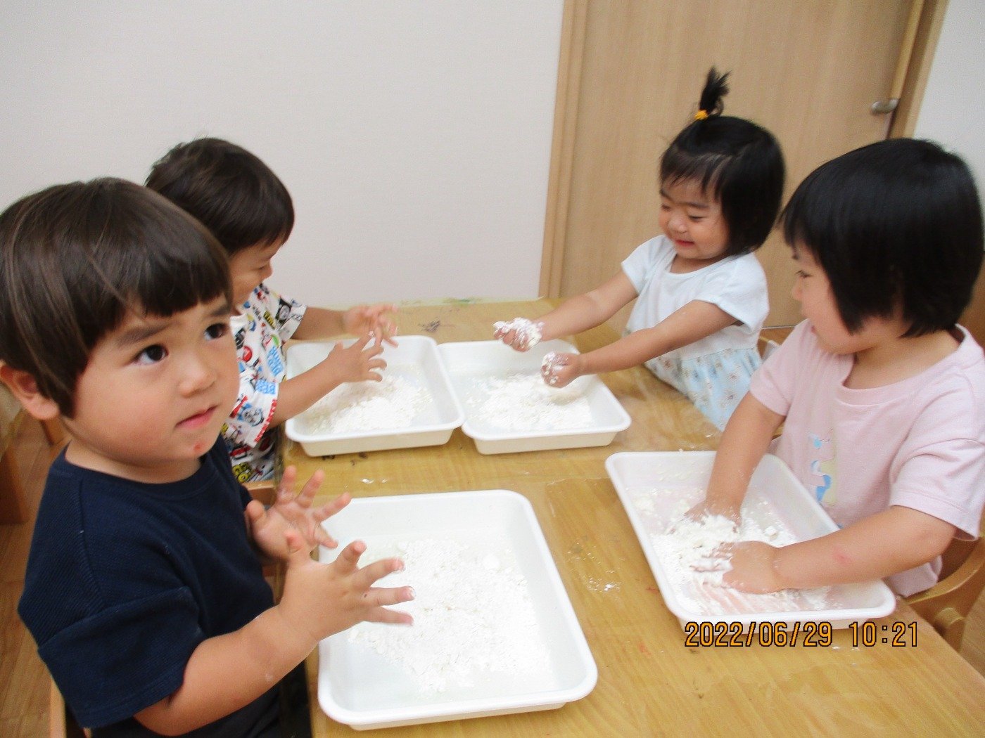 くまぐみさん ホームブログ 2022.06.29 小麦粉粘土の感触あそび!! にチャレンジ✨ 粉から、練っていきます 子ども達も、とっても楽しそう😊 感触あそびがちょっぴり苦手な お友だちも、すこしずつ触れてみてました お家では、感触遊びをする機会も少ないと 思います。 潮江園では、夏ならではの遊びをたくさん 取り入れて遊んでいきます♪