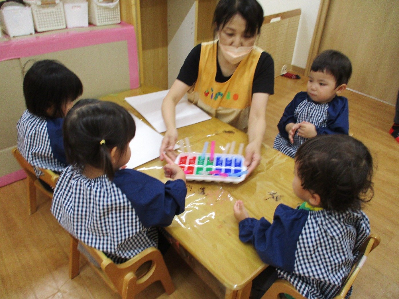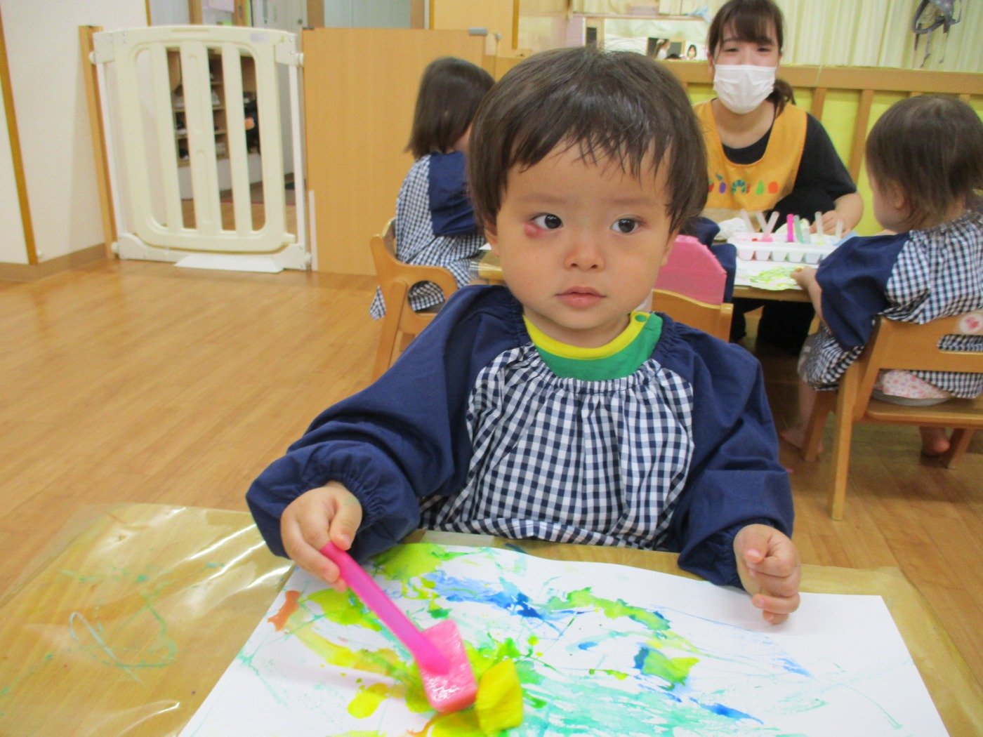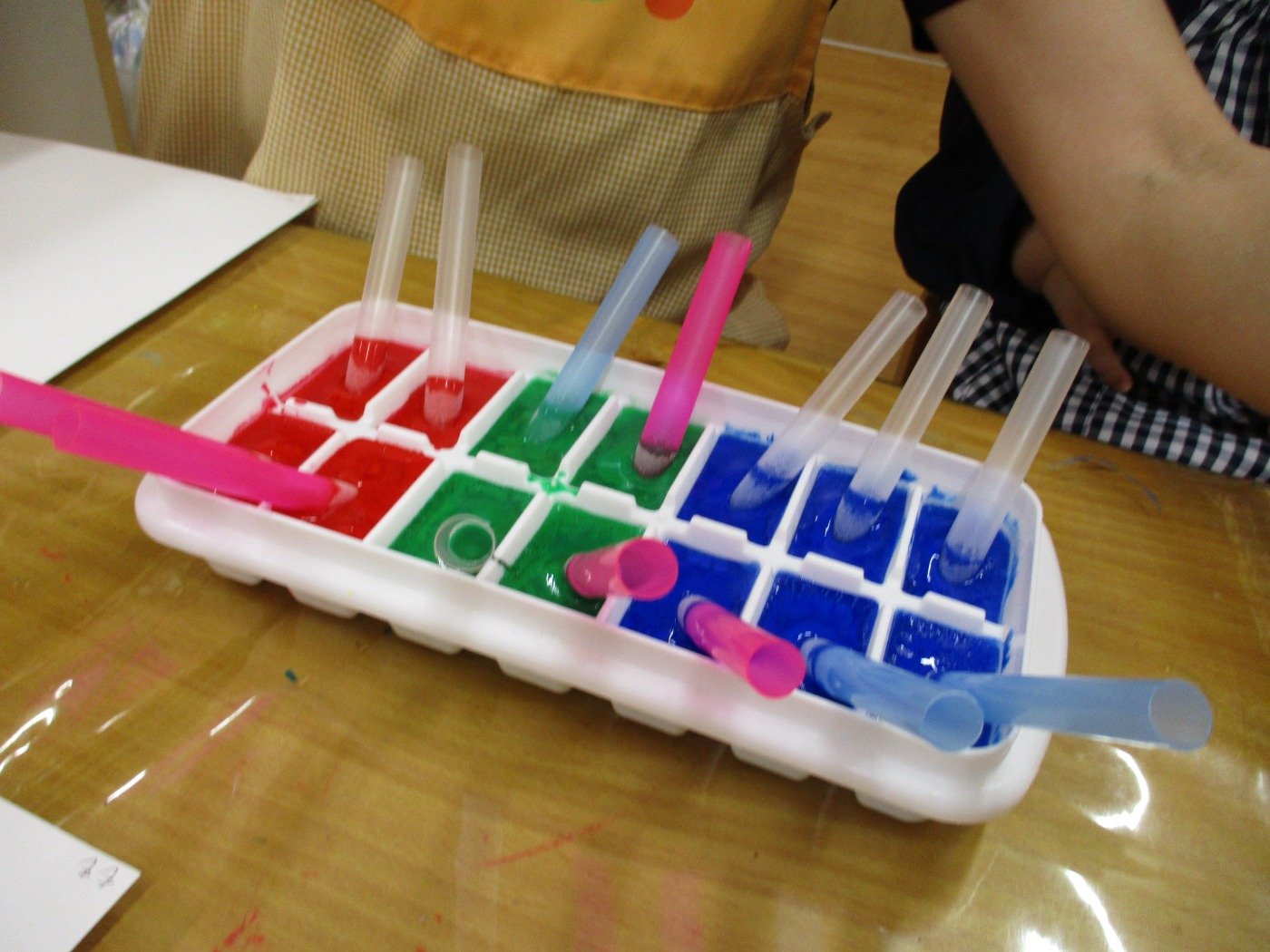 うさぎぐみさん ホームブログ 2022.07.26 感触あそびをしました!! 色氷 子ども達は、気になる色を選んで 画用紙に思い思い沢山描きました♪ 子ども達もとっても嬉しそうに冷たい感触を楽しんで 手も綺麗な色に変身してました😊