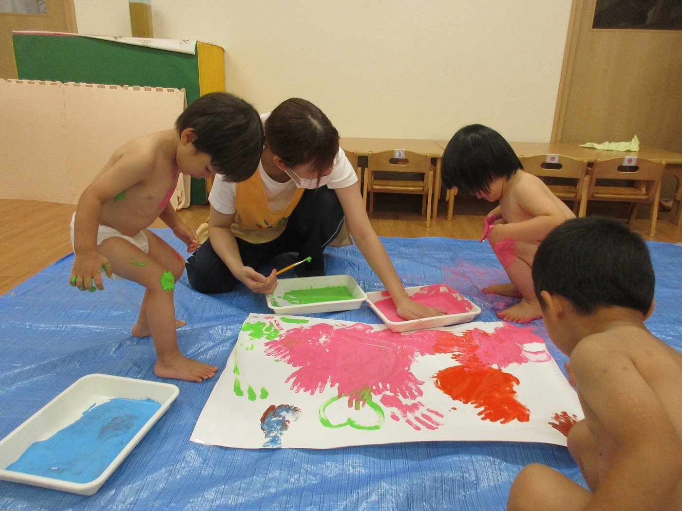 くまぐみさん ホームブログ 2022.08.05 今日は 楽しい時間!! 子ども達も・・・大はしゃぎで ボディーペインティング 先生も一緒に絵の具だらけ とっても楽しい時間を過ごしました。 夏ならではですよね♪
