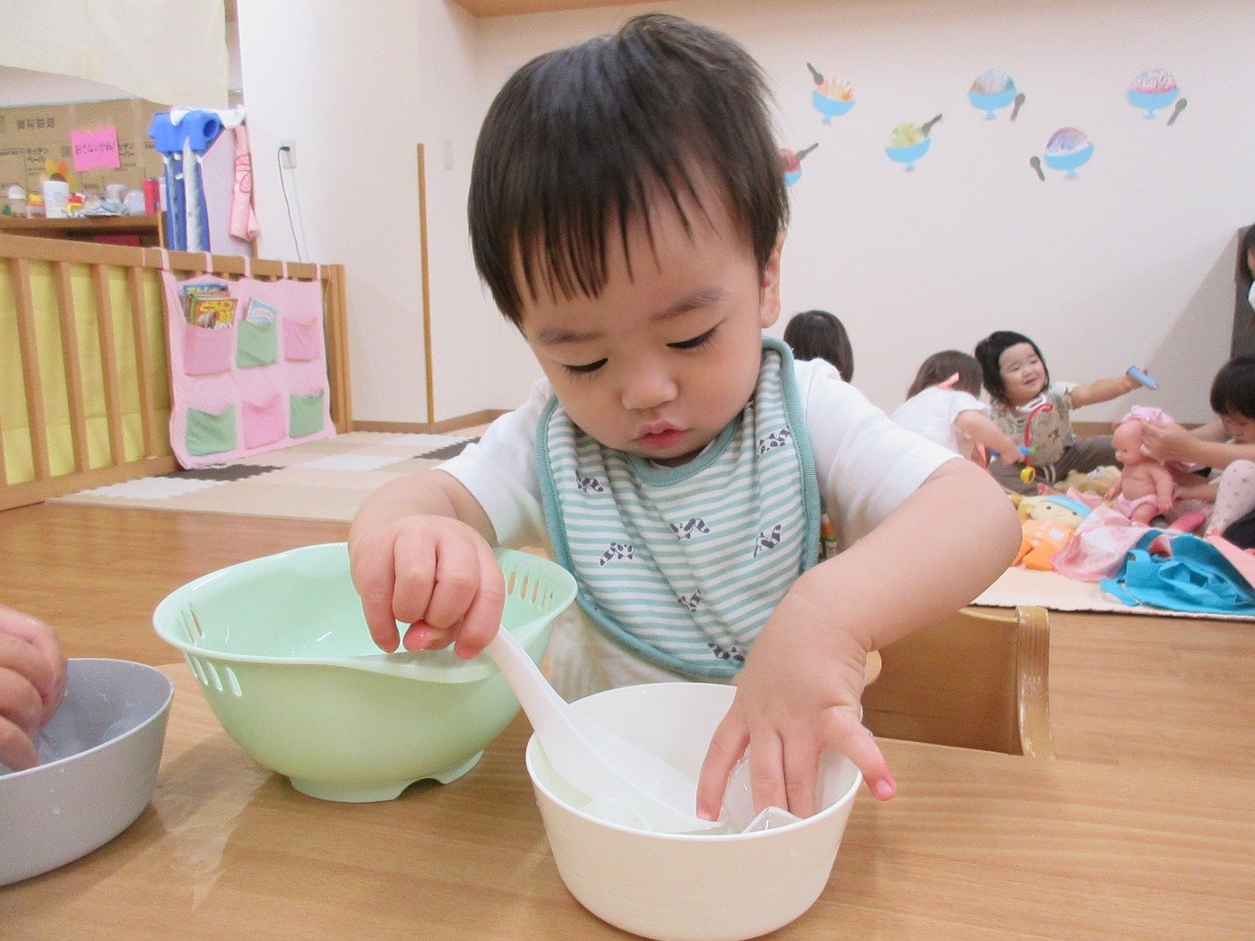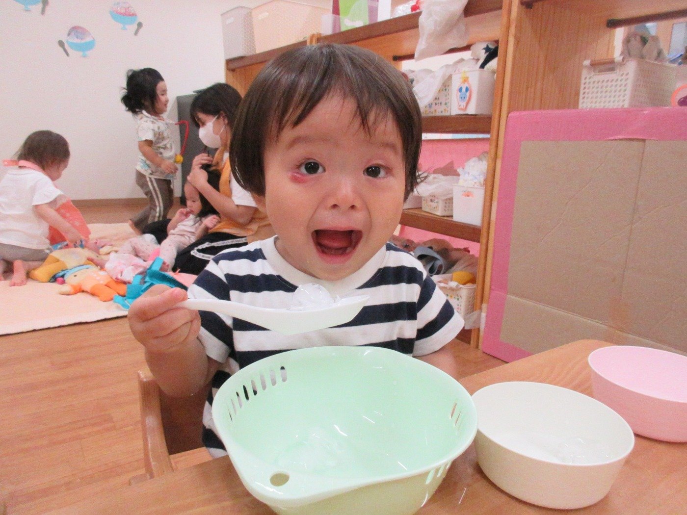 うさぎぐみ ホームブログ 2022.08.18 朝から☔のお天気ですが、うさぎさんは 毎日元気いっぱい!! お部屋でゆったりすごし 「こおり」の感触あそび! 入園前はなかなか触れたり経験することが少ない感触あそび 保育園では先生のアイデアいっぱいの、 感触あそびを夏は楽しみます♬ お家でもお試ししてみてくださいね。