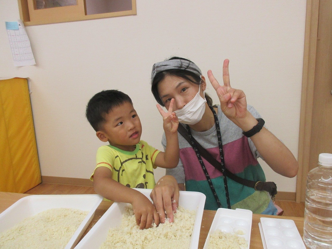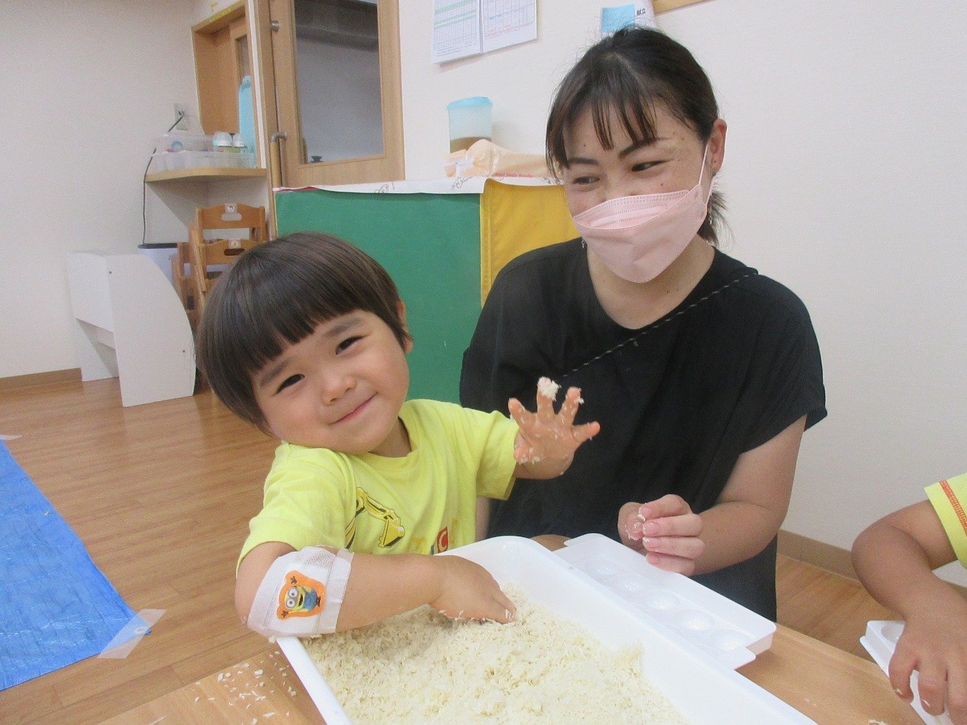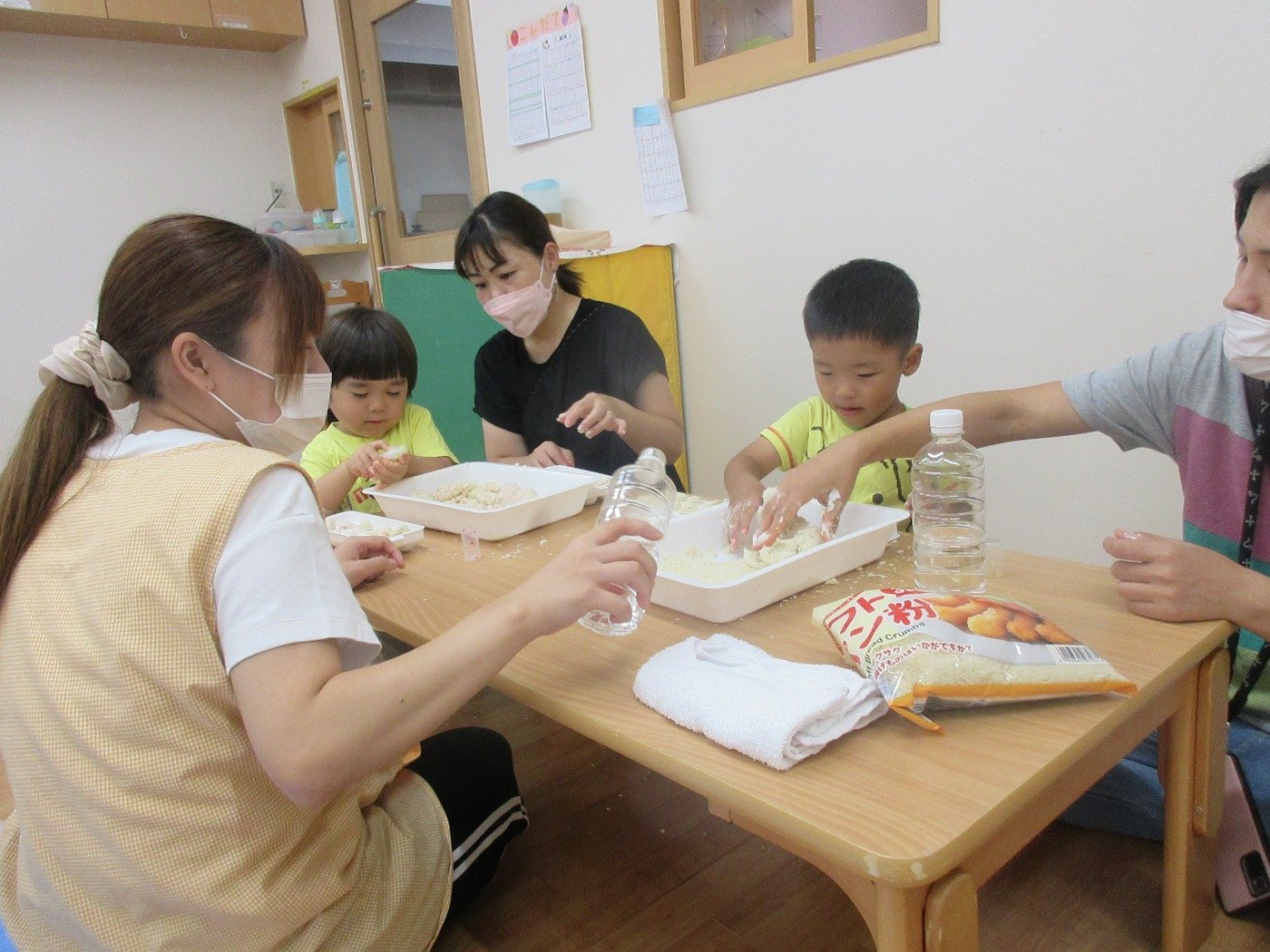くまぐみさん参観😊 ホームブログ 2022.09.08 くまぐみさんの参観 子ども達が日頃園で過ごしている 様子を一緒に体験して欲しい思いから 体験型参観にしました。 感触あそび! ぱんこ・団子の粉・片栗粘土 一緒に混ぜて・こねて・色をつけて 子ども達も保護者の方が一緒で嬉しそうなお顔♡ 一緒に楽しんでもらえたら嬉しいです。