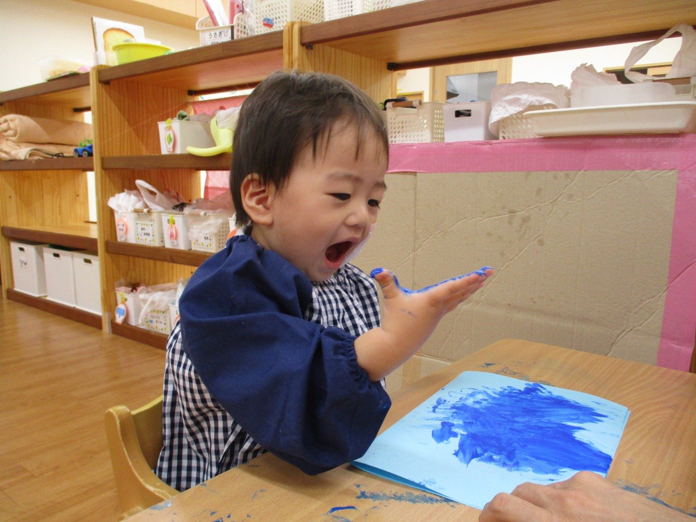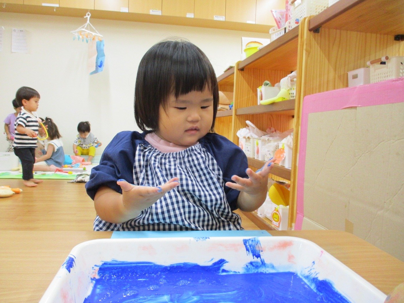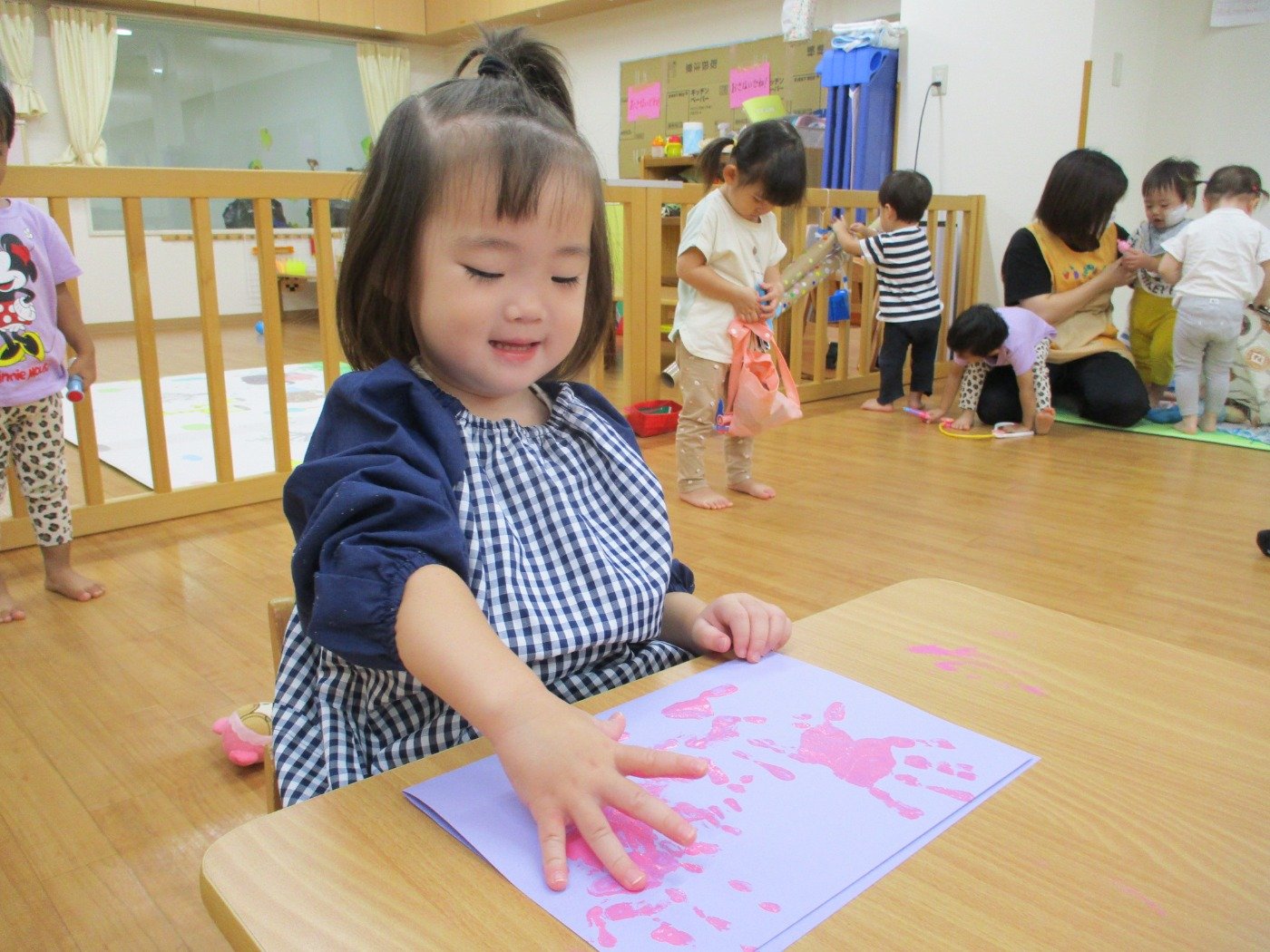 うさぎぐみさん ホームブログ 2022.09.20 今日は、絵の具の感触をたのしみました😊 両手に絵の具をつけて、ぺたぺた 子ども達も楽しそうに参加してました 絵の具の感触遊びが、はじめてのお友だちも 参加!!最初は感触に不思議そうな顔をしてました これからたくさんの感触遊びもしていきたいと思います。