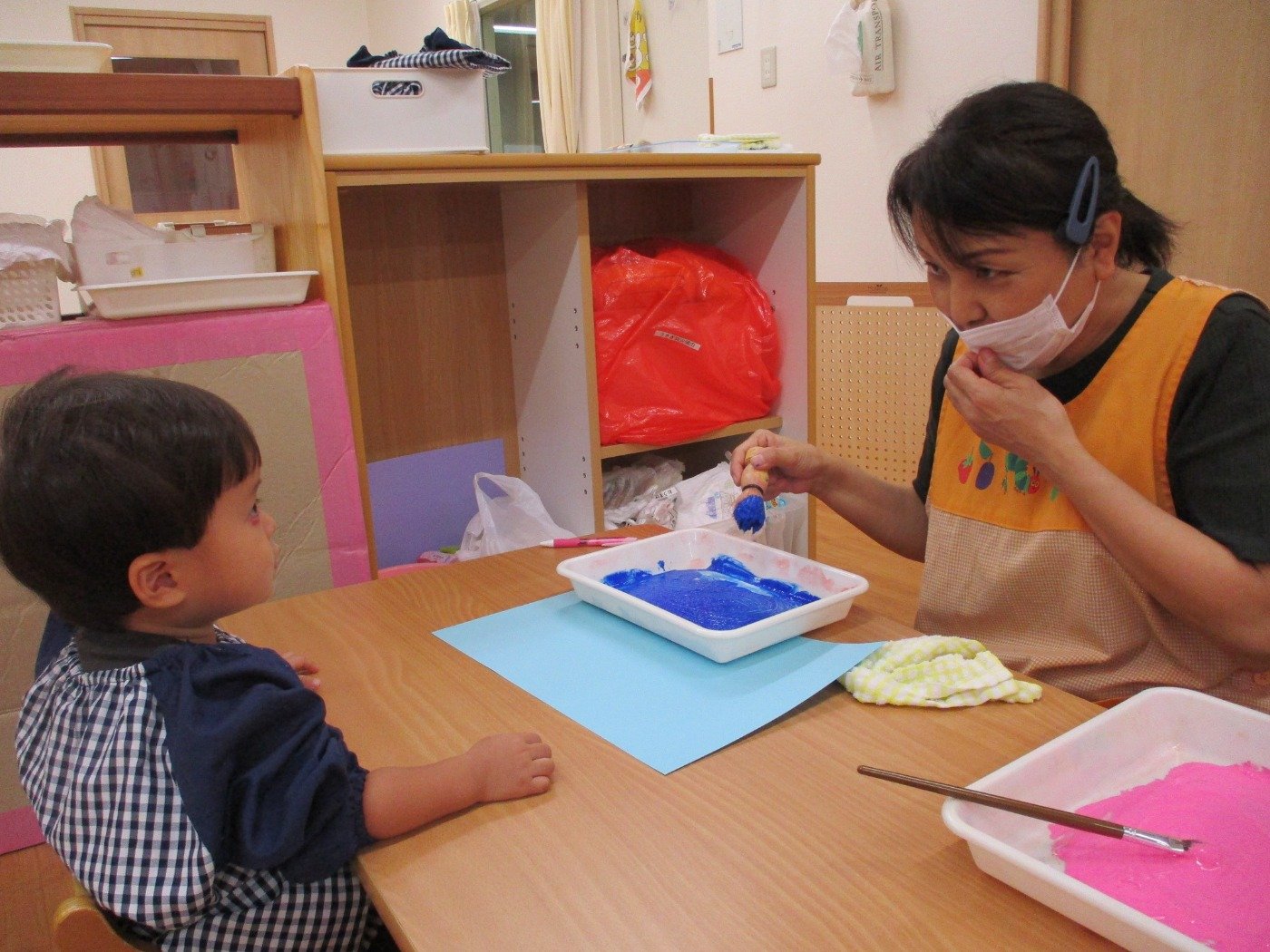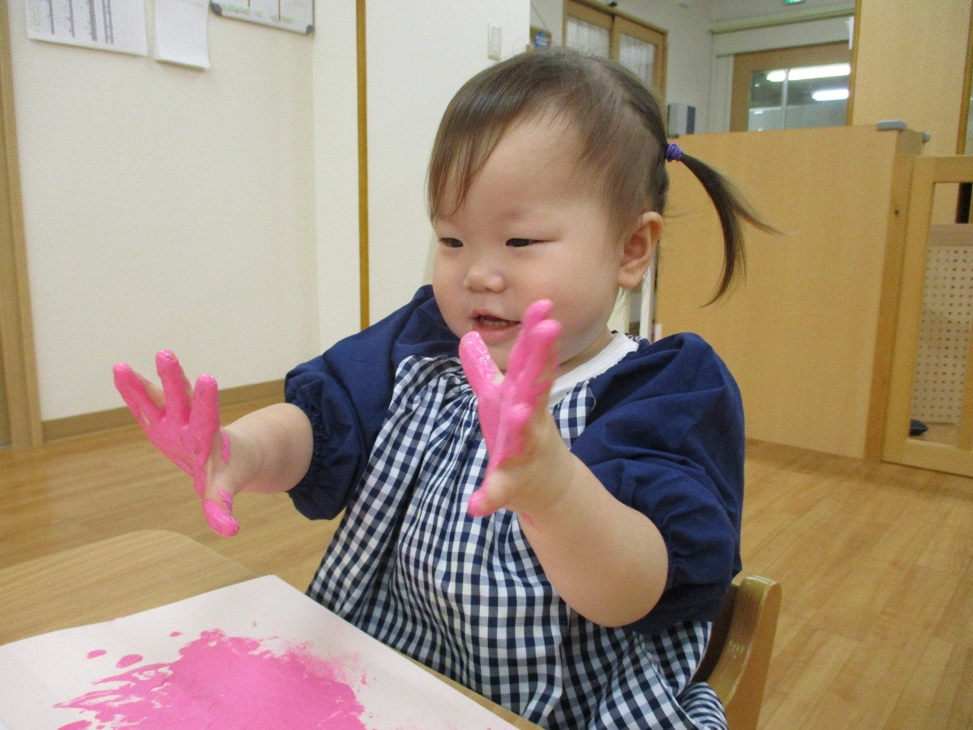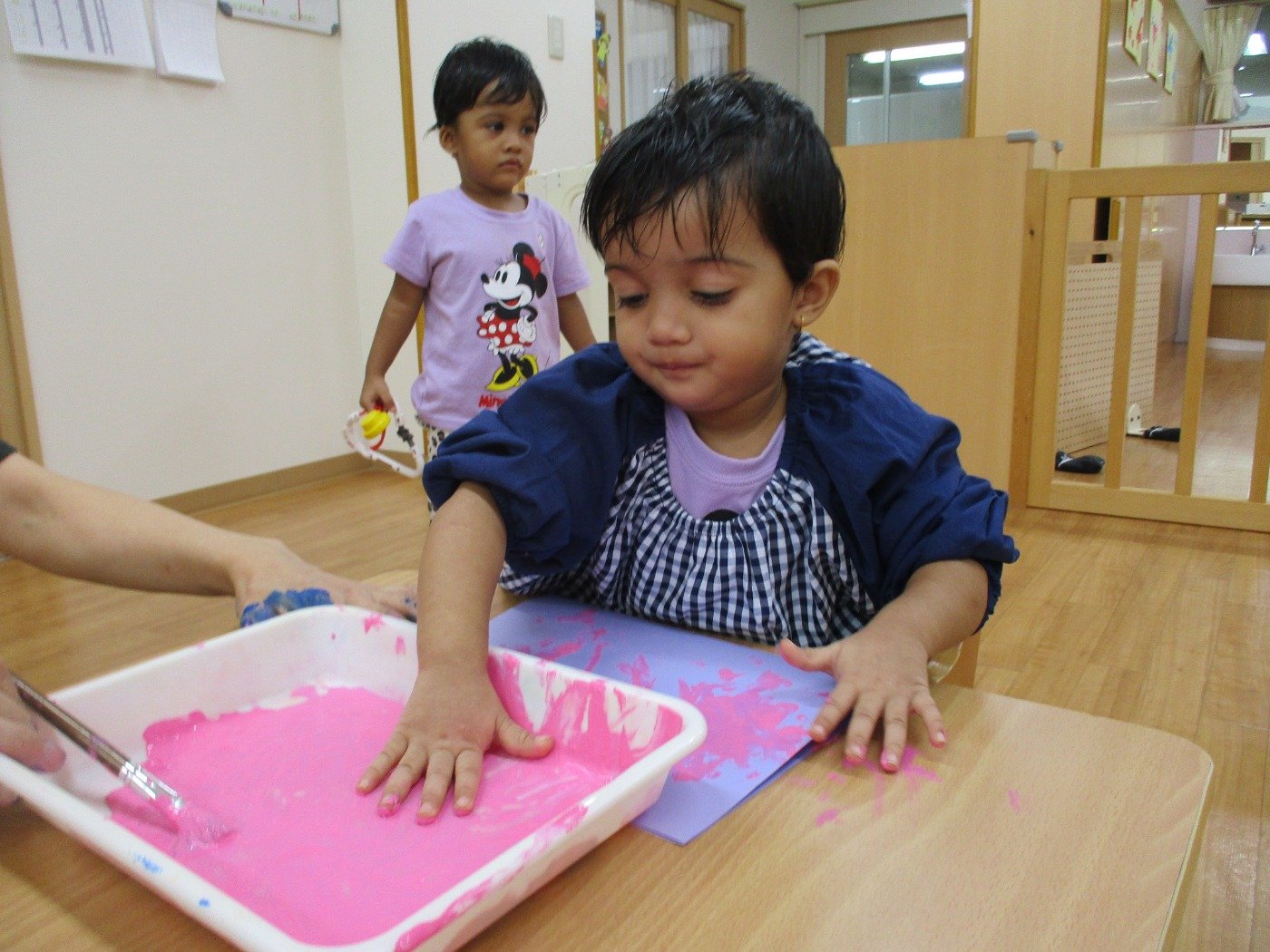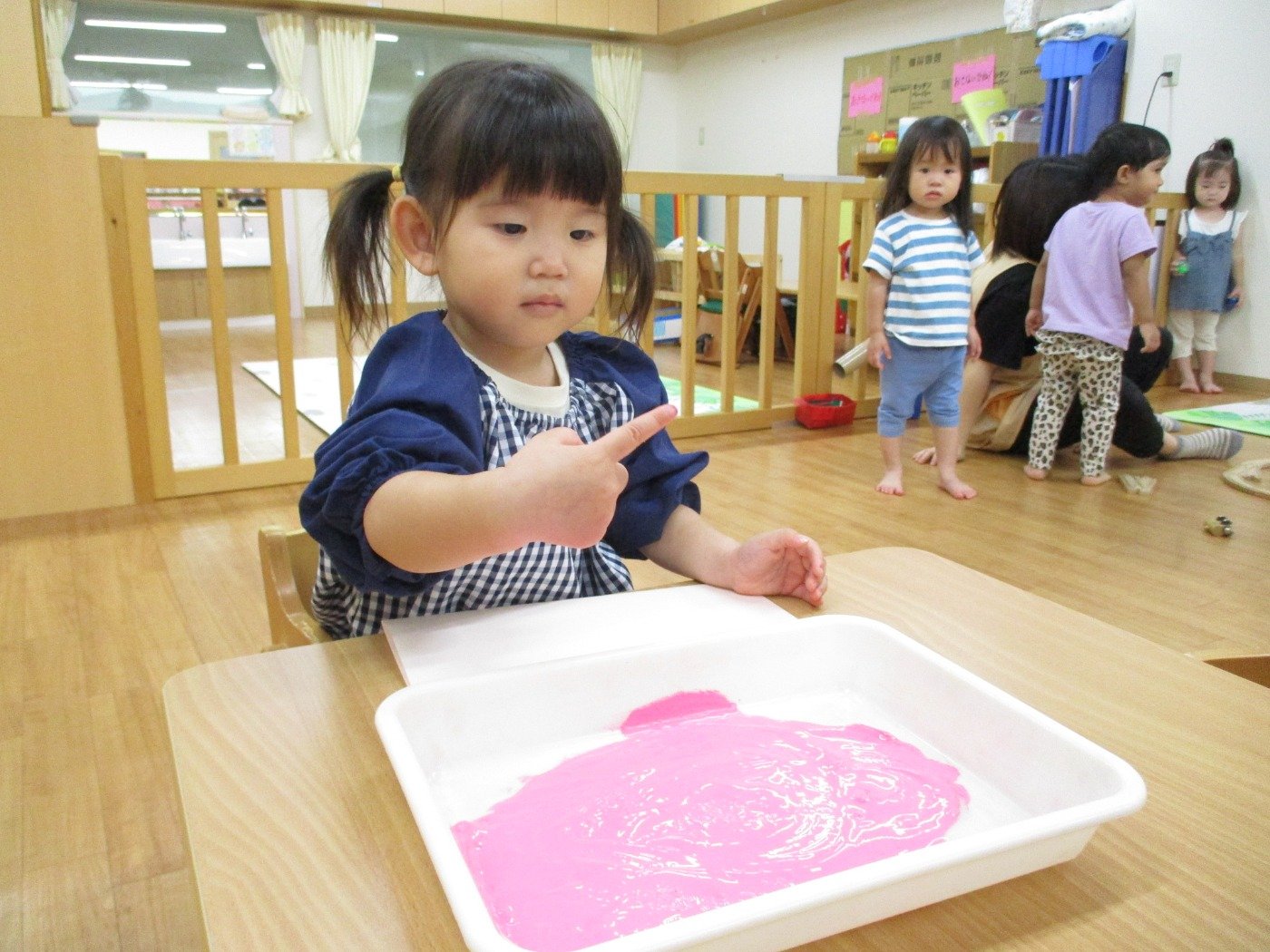うさぎぐみさん ホームブログ 2022.09.20 今日は、絵の具の感触をたのしみました😊 両手に絵の具をつけて、ぺたぺた 子ども達も楽しそうに参加してました 絵の具の感触遊びが、はじめてのお友だちも 参加!!最初は感触に不思議そうな顔をしてました これからたくさんの感触遊びもしていきたいと思います。