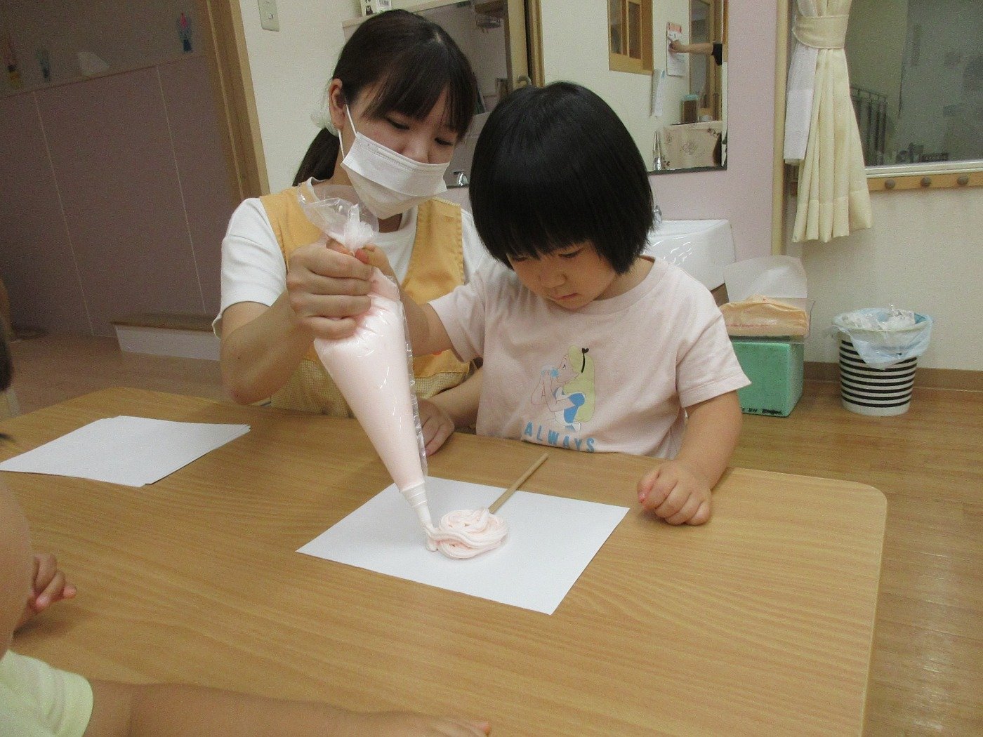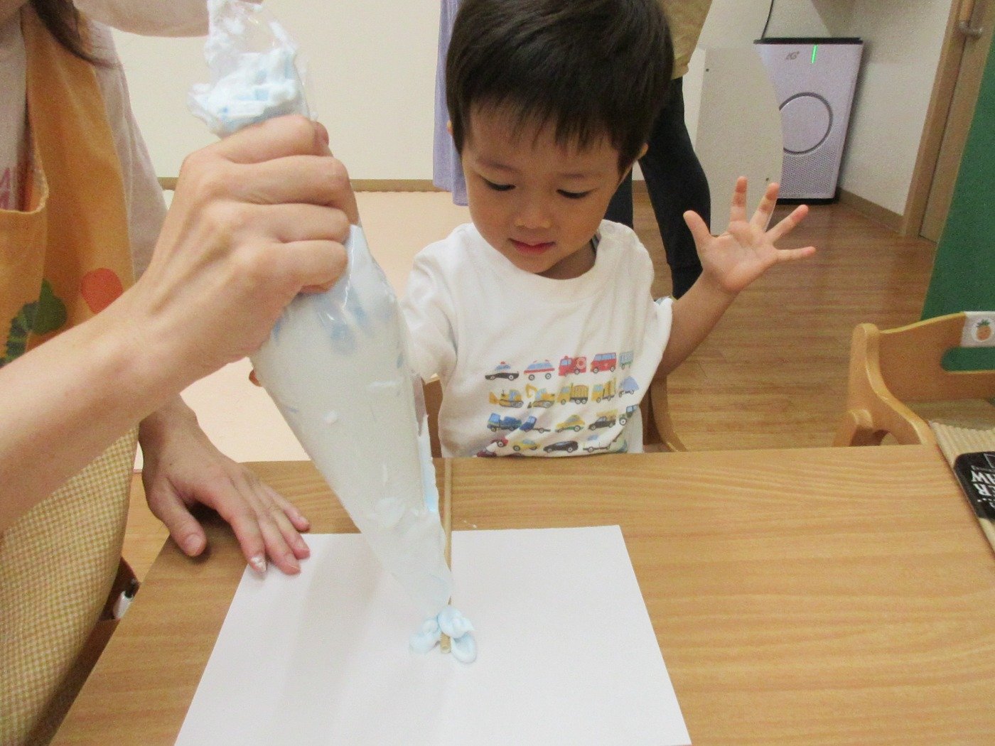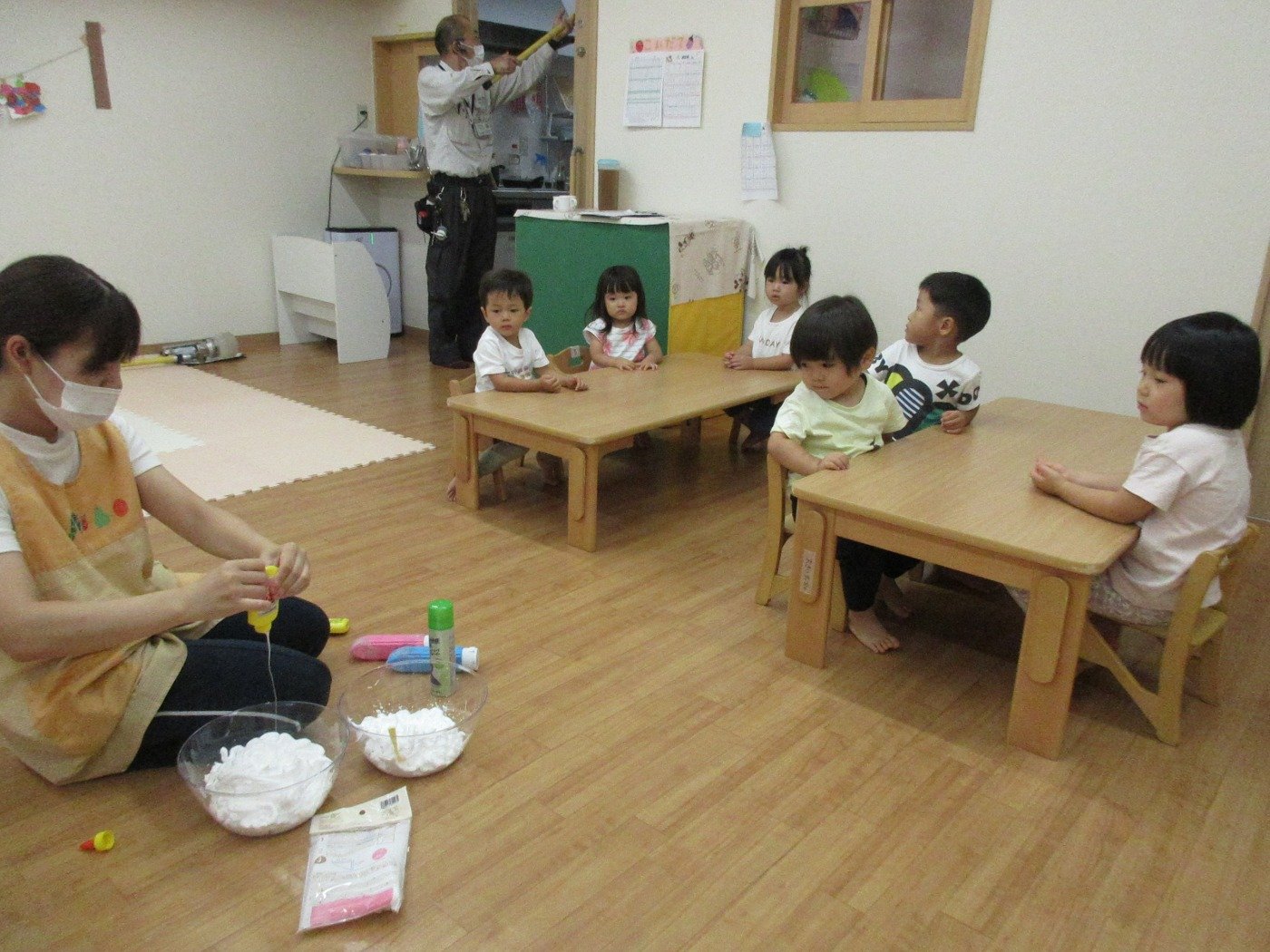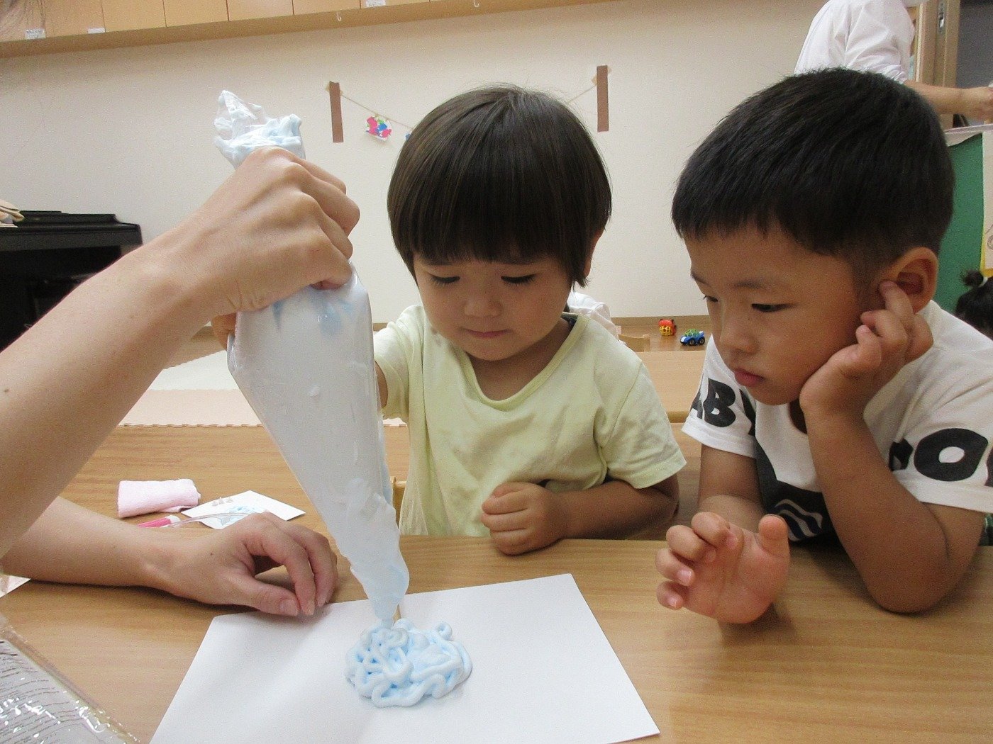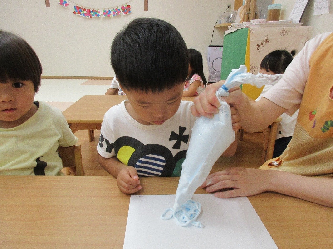 くまぐみさん ホームブログ 2022.09.22 くまぐみさん 今日は、感触?体験をしました😊 ふわふわな・・・泡 きれいないろ 綿菓子みたにふわふわな泡を先生と 一緒に絞りました 何に変身するのか楽しみです♫