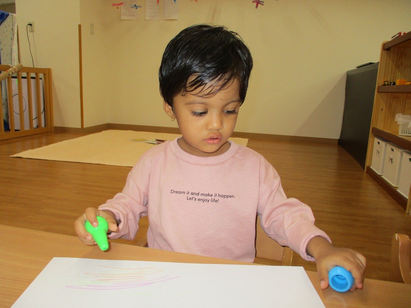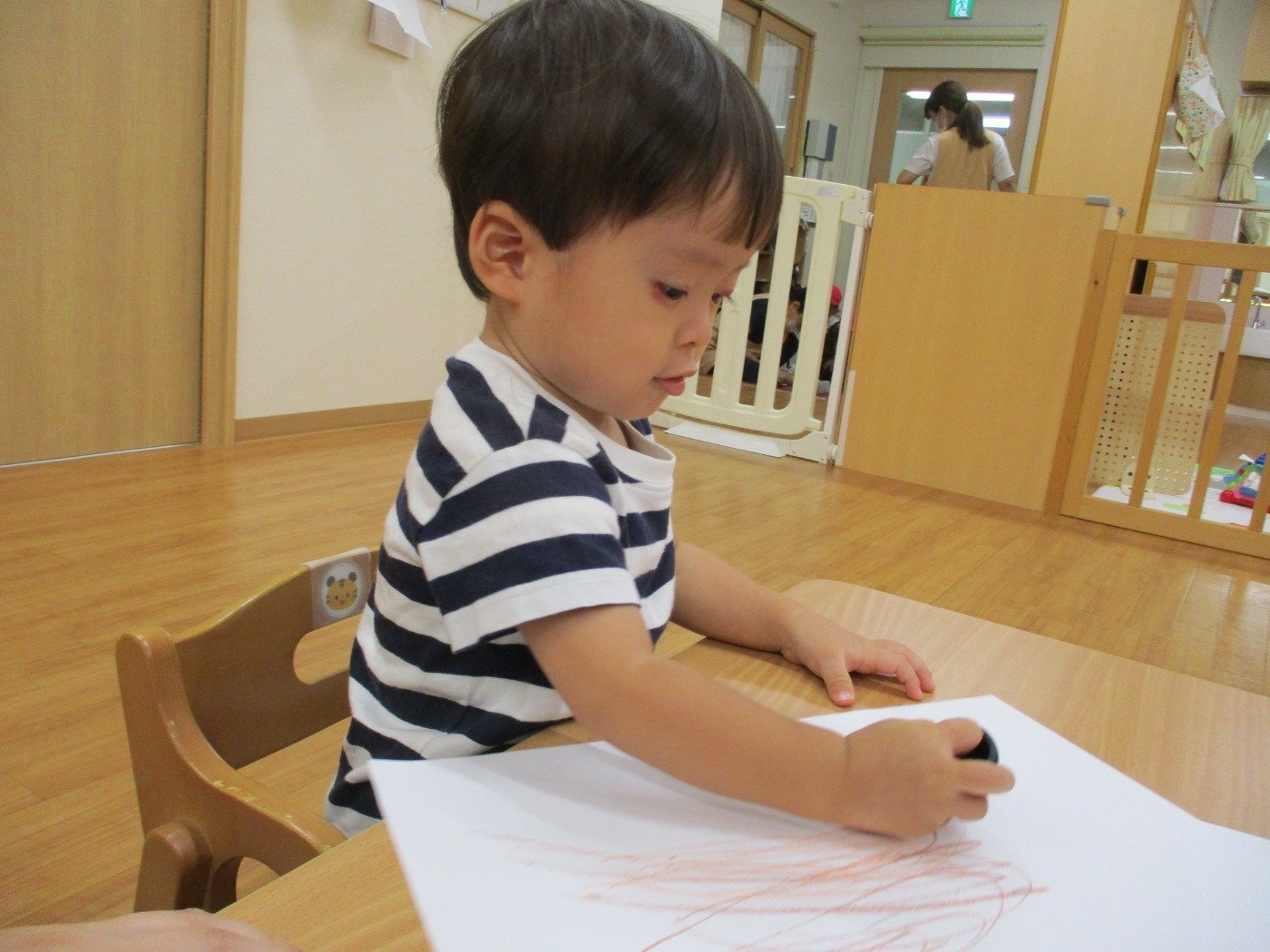 うさぎぐみさん ホームブログ 2022.09.27 お部屋で、クレヨンでなぐり描き!! 子ども達もとっても真剣なお顔で描いてます 何を描いているのかな? そーっと見てみると 素敵な色とりどりの大きな・・・まる😊 でした