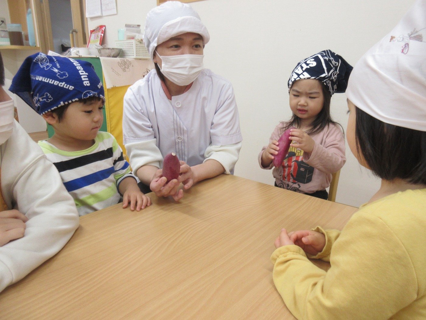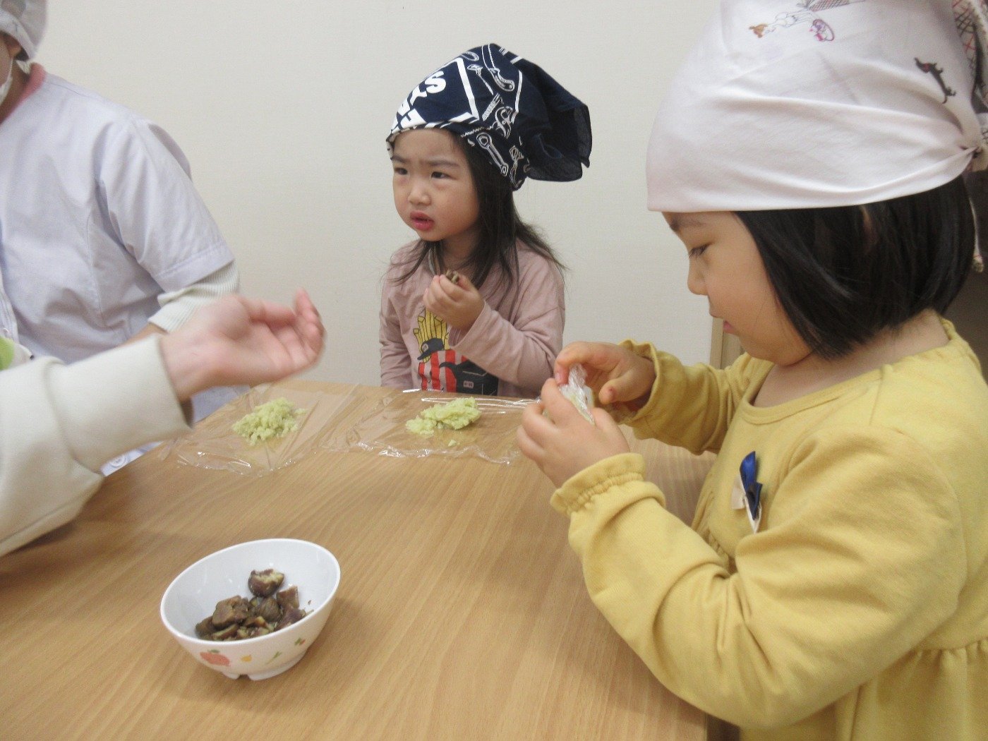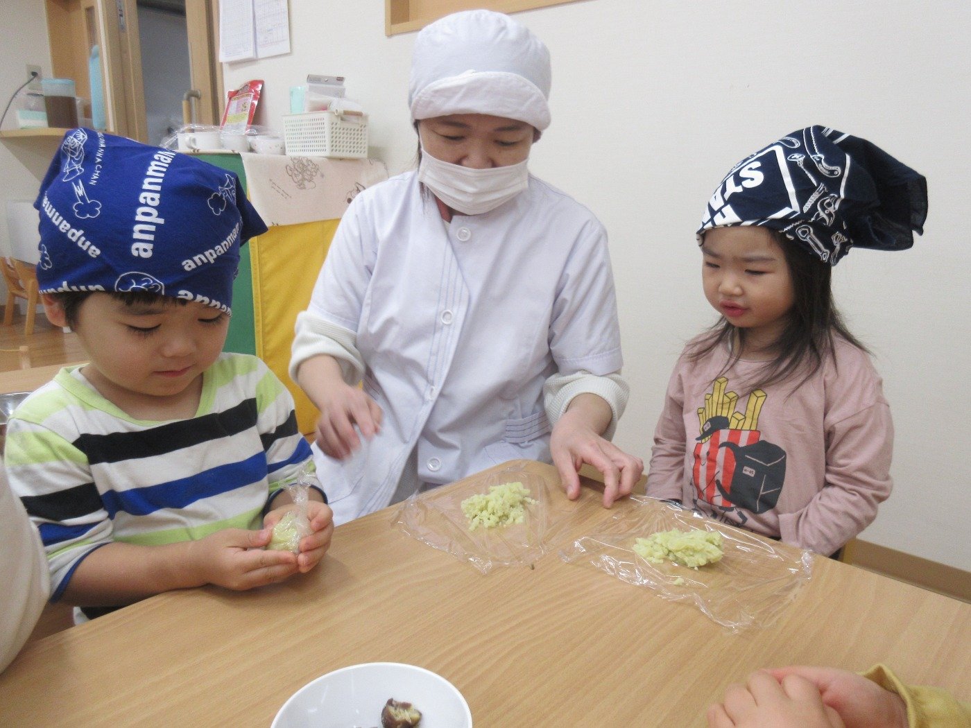 くまぐみさん クッキング ホームブログ 2022.11.24 くまぐみさん 「いもきんとん」をクッキング!! 調理さんから お芋を見せてもらって・・・ 興味深々 触って、お芋のにおいをかいで さぁー 丸めます😊 子ども達も 楽しそうでした 自分たちで 作った 「いもきんとん」 はおしい♡ 次のクッキングは何をするのかな?