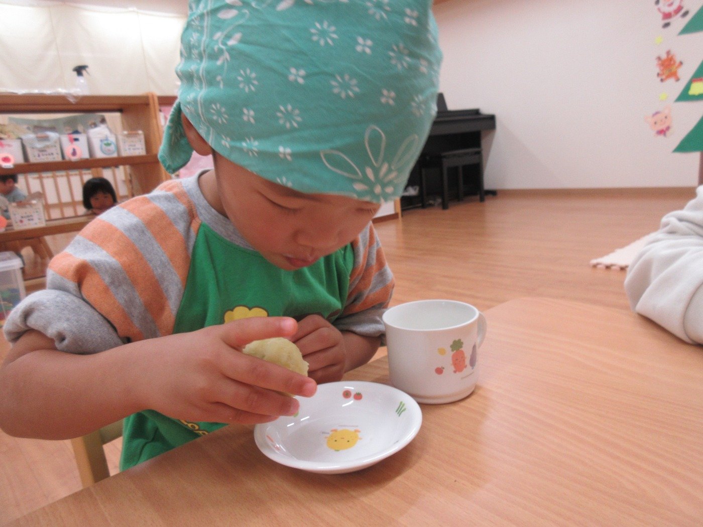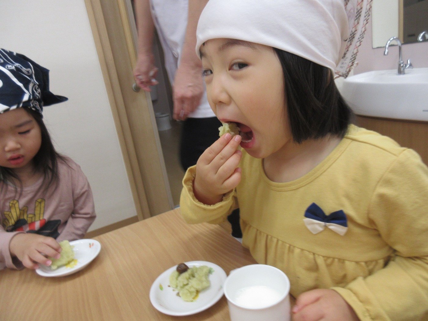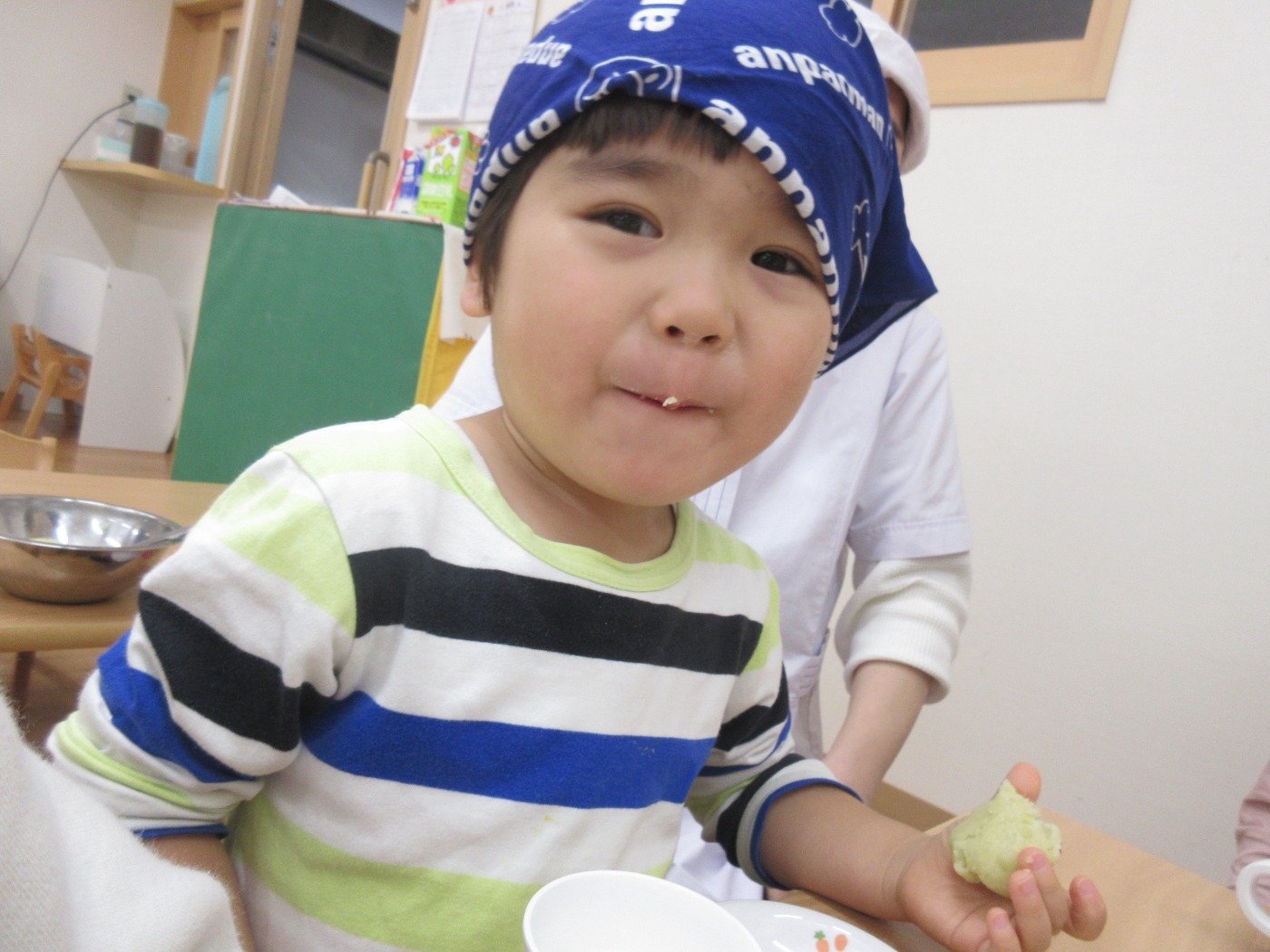 くまぐみさん クッキング ホームブログ 2022.11.24 くまぐみさん 「いもきんとん」をクッキング!! 調理さんから お芋を見せてもらって・・・ 興味深々 触って、お芋のにおいをかいで さぁー 丸めます😊 子ども達も 楽しそうでした 自分たちで 作った 「いもきんとん」 はおしい♡ 次のクッキングは何をするのかな?