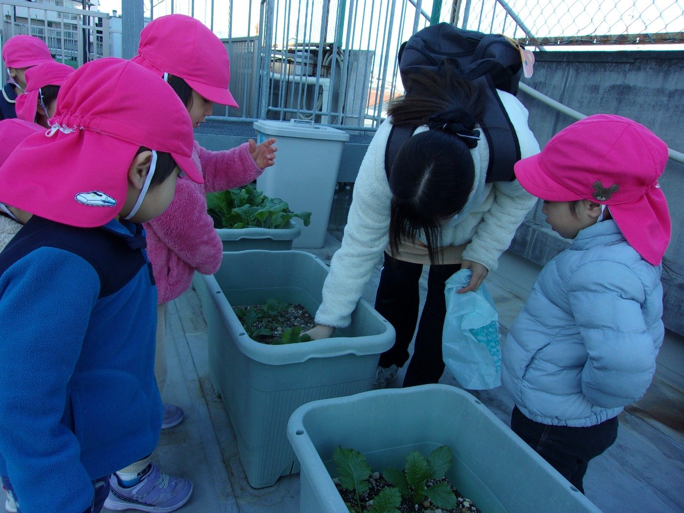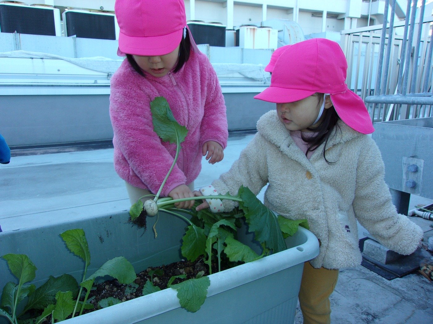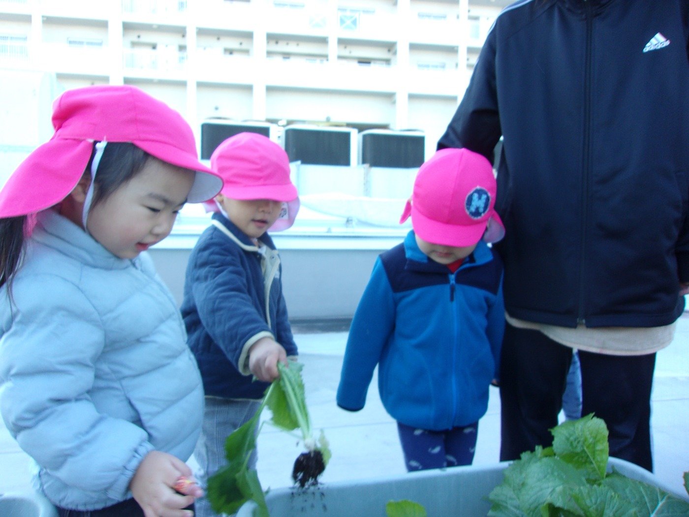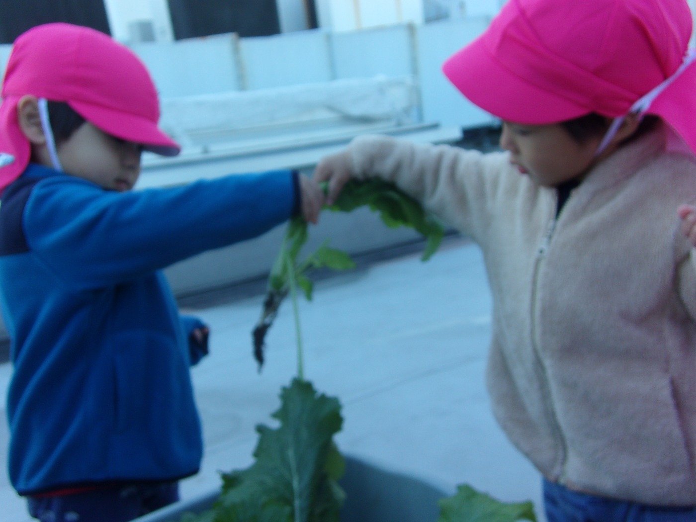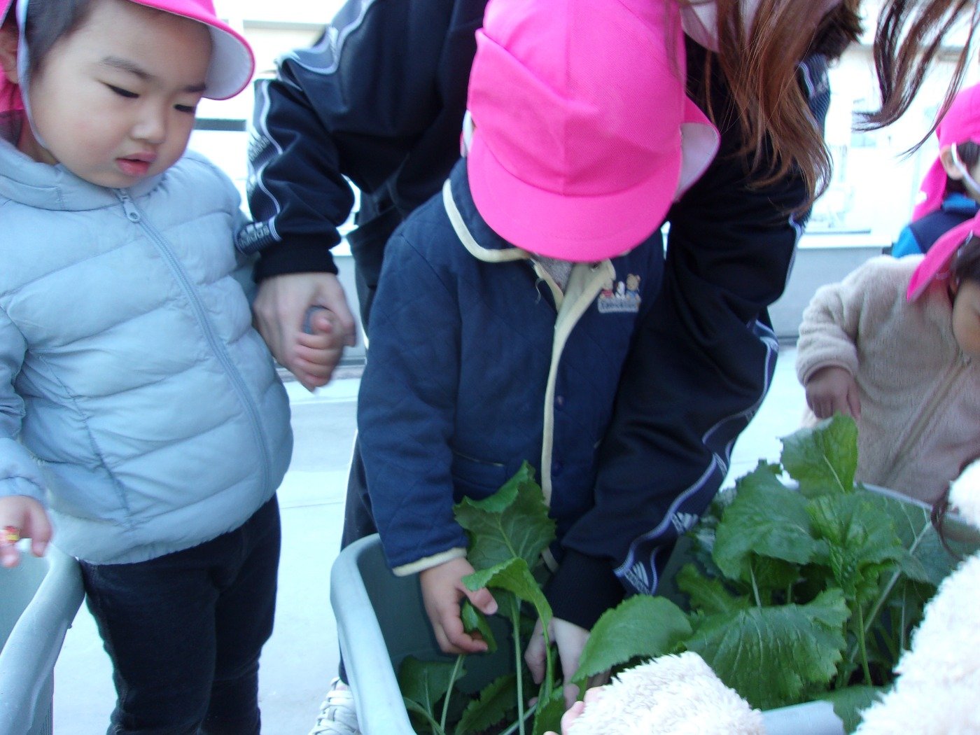 くまぐみさん ホームブログ 2022.12.19 風も冷たい日でしたが 子ども達は元気いっぱい!! 「かぶ」の収穫に行ってきました 小さな・・・ちいさな 「かぶ」 葉っぱは大きく 絵本の「おおきなかぶ」とは 逆のかぶでしたが、子ども達は楽しんで 収穫をしてきました😊