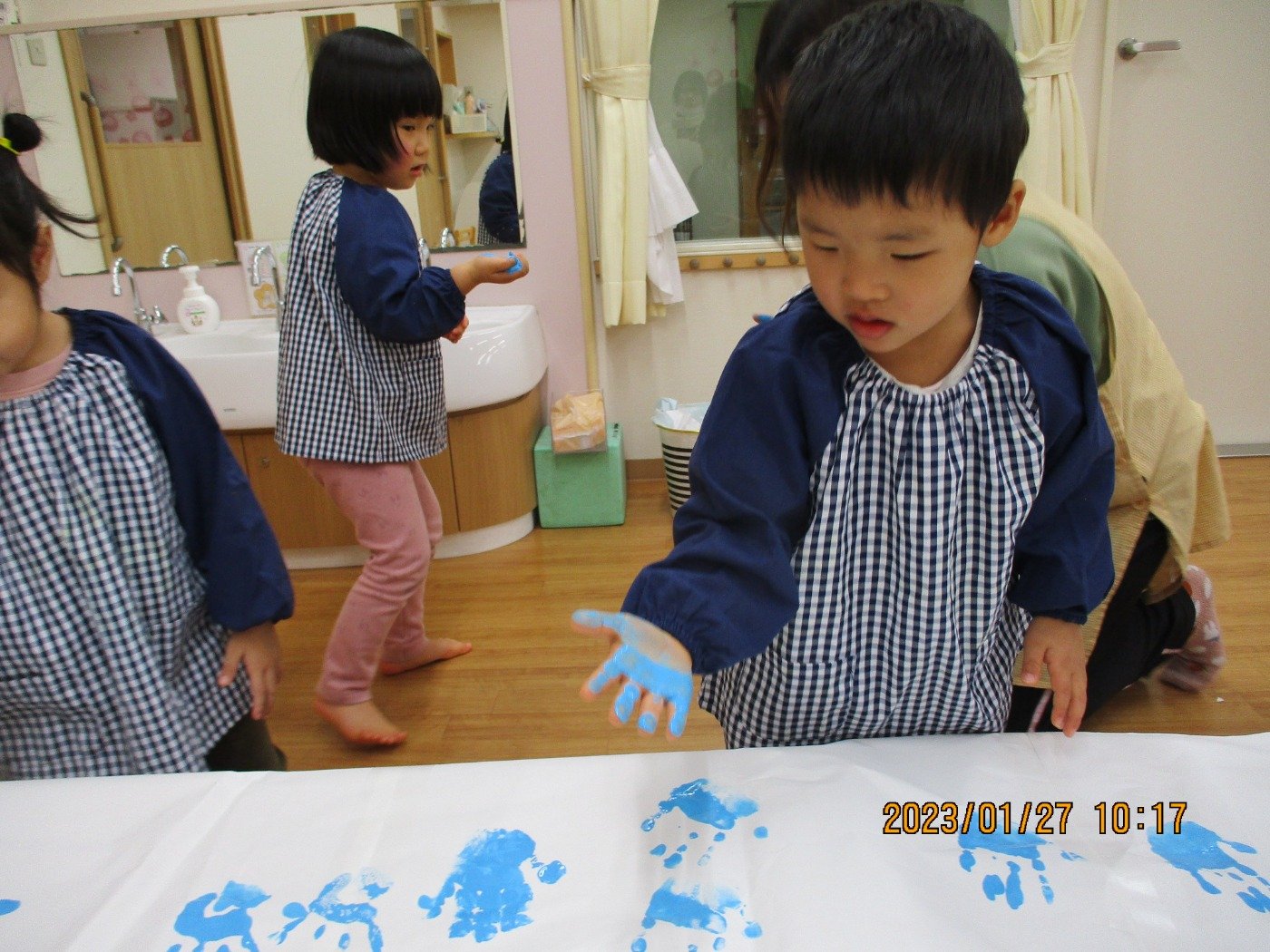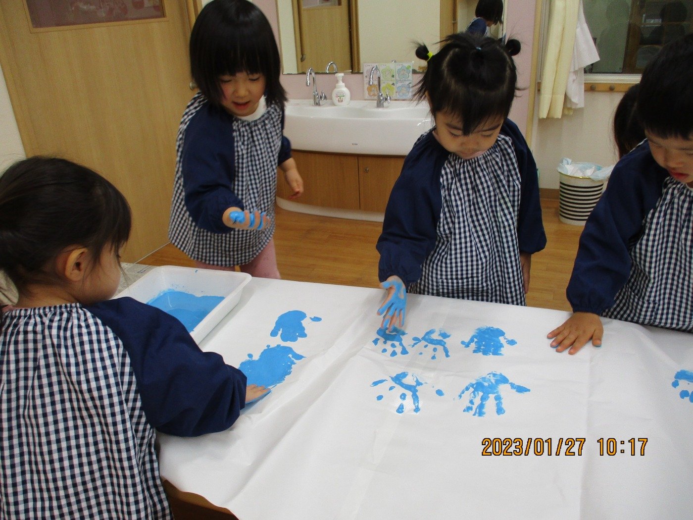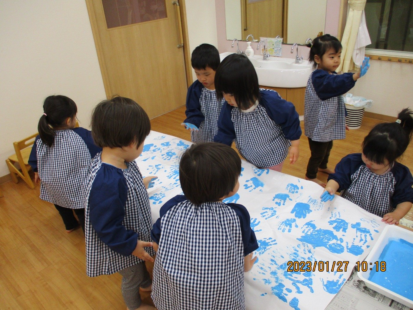 くまぐみさん ホームブログ 2023.01.27 今日は、、、、、 子ども達もおおはしゃぎ!! ぬたくり をしました😊 絵の具の感触を楽しみにながら ペタペタ・・・・と沢山塗って遊びました 子ども達の笑顔とっても素敵🌟