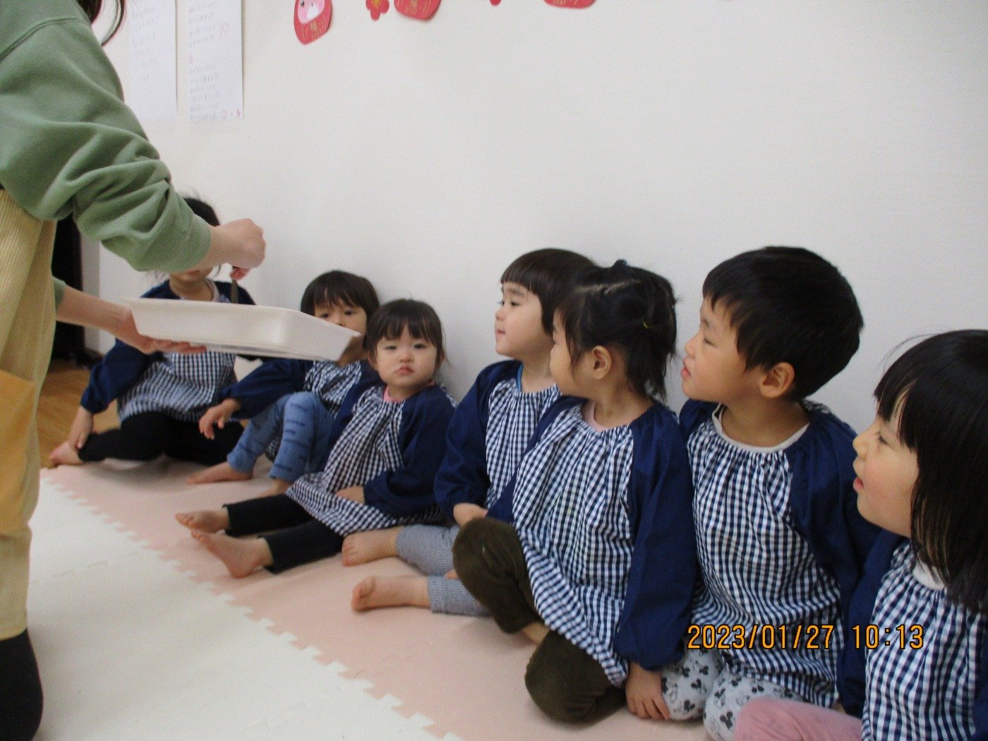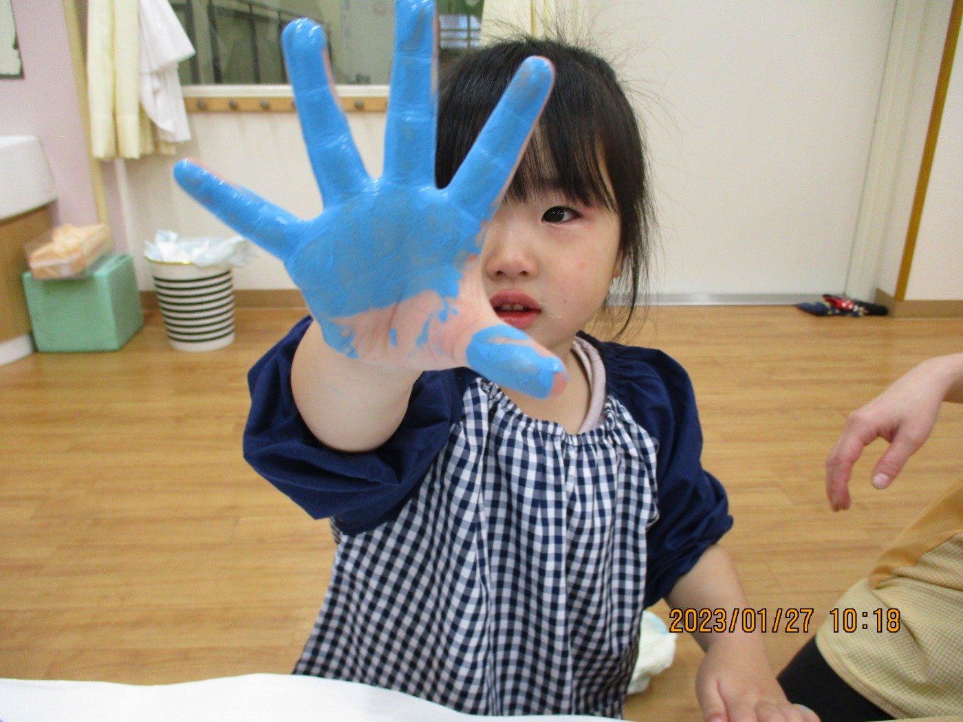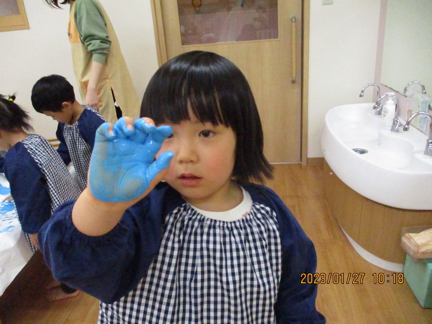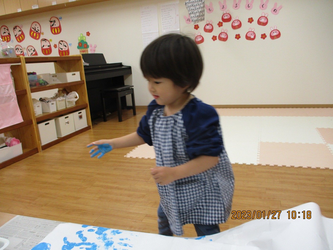 くまぐみさん ホームブログ 2023.01.27 今日は、、、、、 子ども達もおおはしゃぎ!! ぬたくり をしました😊 絵の具の感触を楽しみにながら ペタペタ・・・・と沢山塗って遊びました 子ども達の笑顔とっても素敵🌟