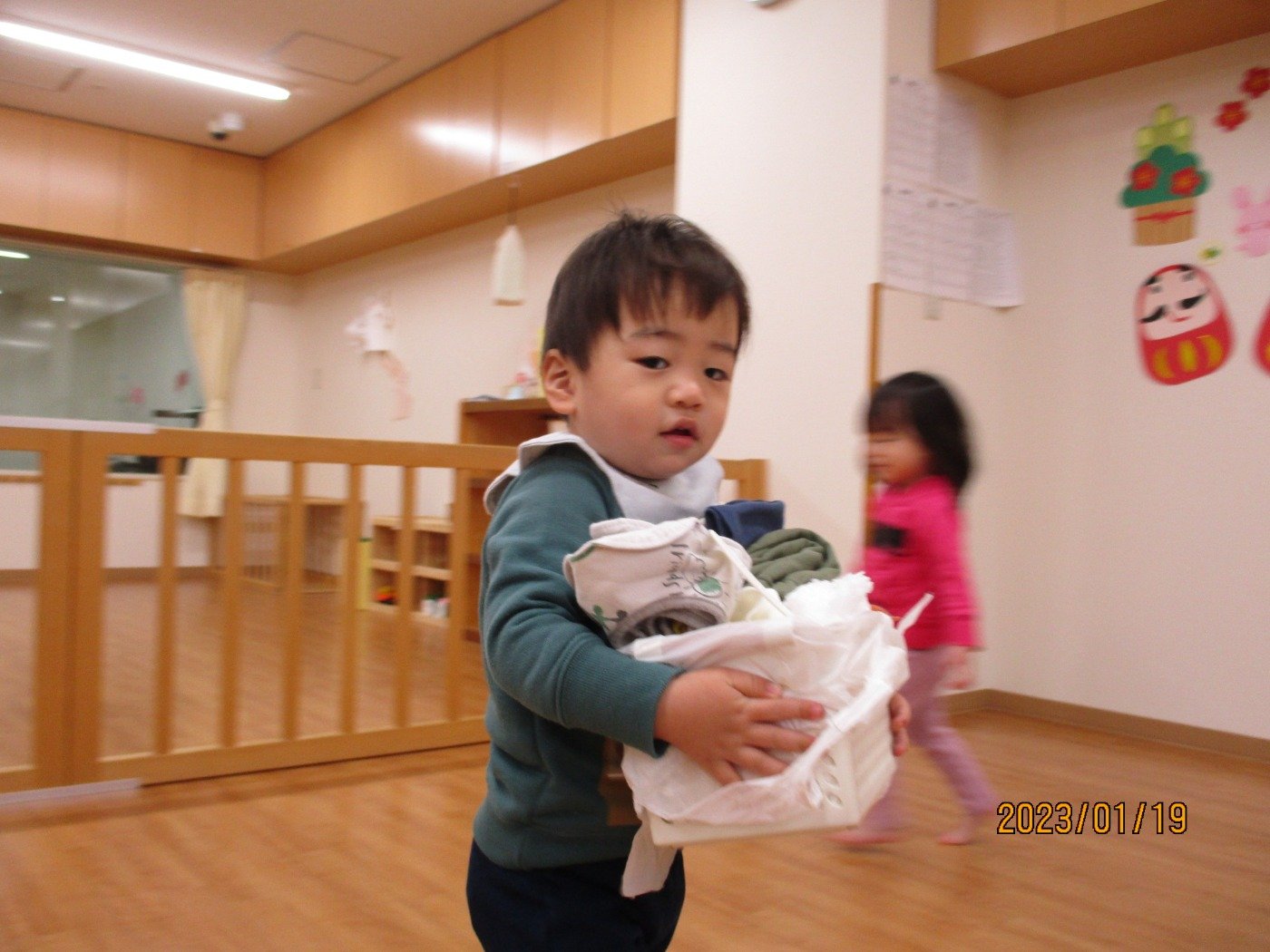 うさぎぐみさん ホームブログ 2023.01.19 子ども達の登園後の様子😊 朝の時間は合同保育になります。 子ども達とゆったり遊べる素敵な時間 登園したら、子ども達は着替えのカゴを持って お部屋に入ってきます。 この姿は本当にかわいいです♡ 入園の頃は、泣いていた子ども達も いっぱいできることが増えました♪ 成長を一緒にみていけたらうれしいです。
