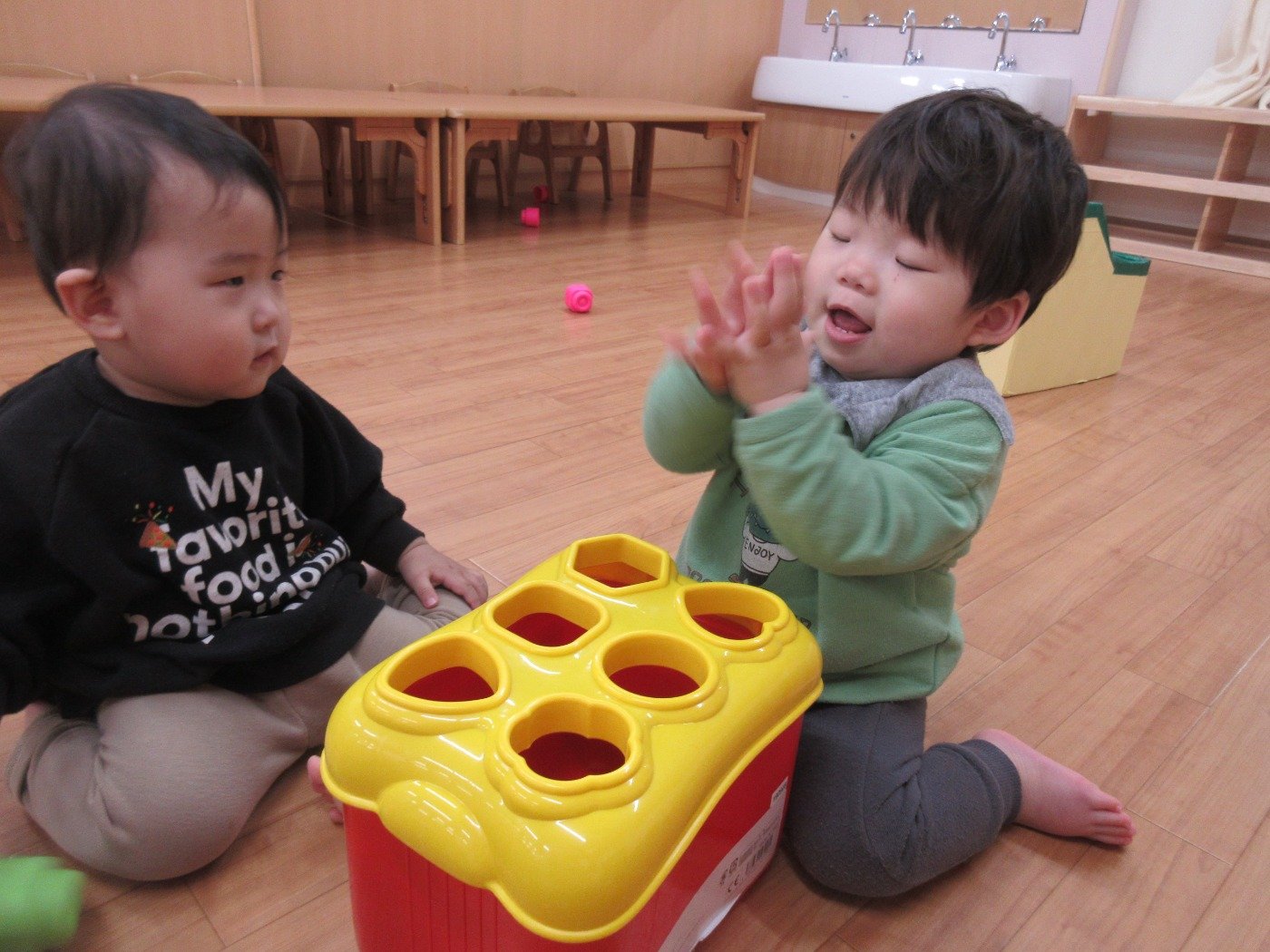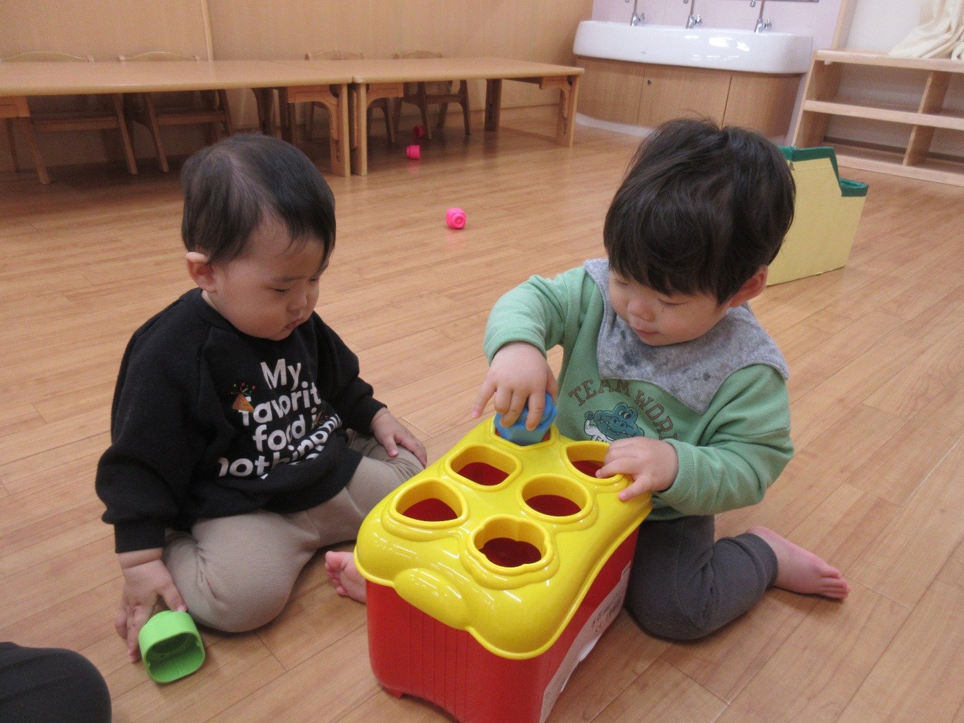 ひよこ組さん😊 ホームブログ 2023.03.24 ひよこ組さん、今日はお部屋の中で遊びました。 お友だちと一緒に、型はめにチャレンジ! 小さな手で、入れたり、摘んだり。一生懸命遊ぶ姿が、とても可愛かったです♡ できたできた~! 何個積みあげれるかなぁ~。集中したお顔も可愛い♫