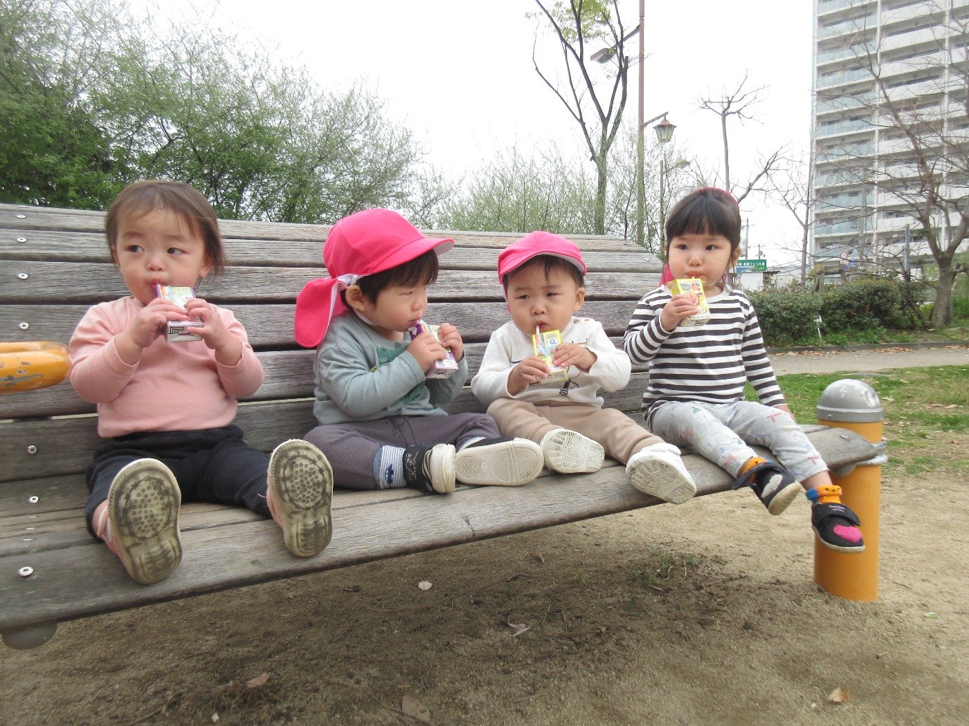 公園でみんなで ジュースを飲んでおやつを食べました😊
