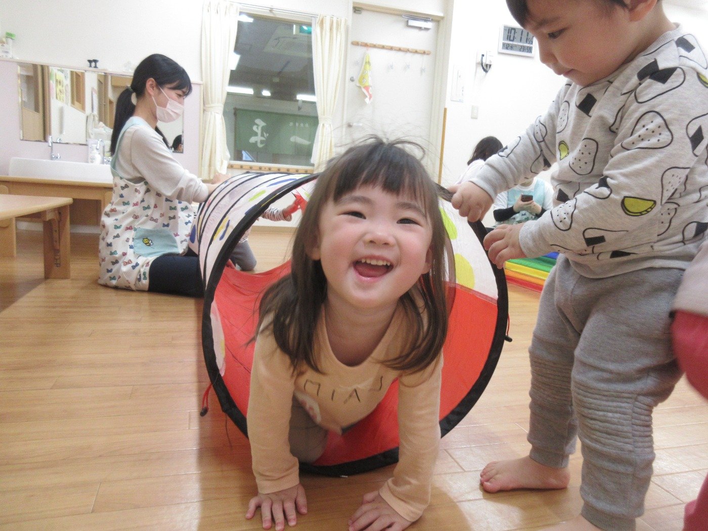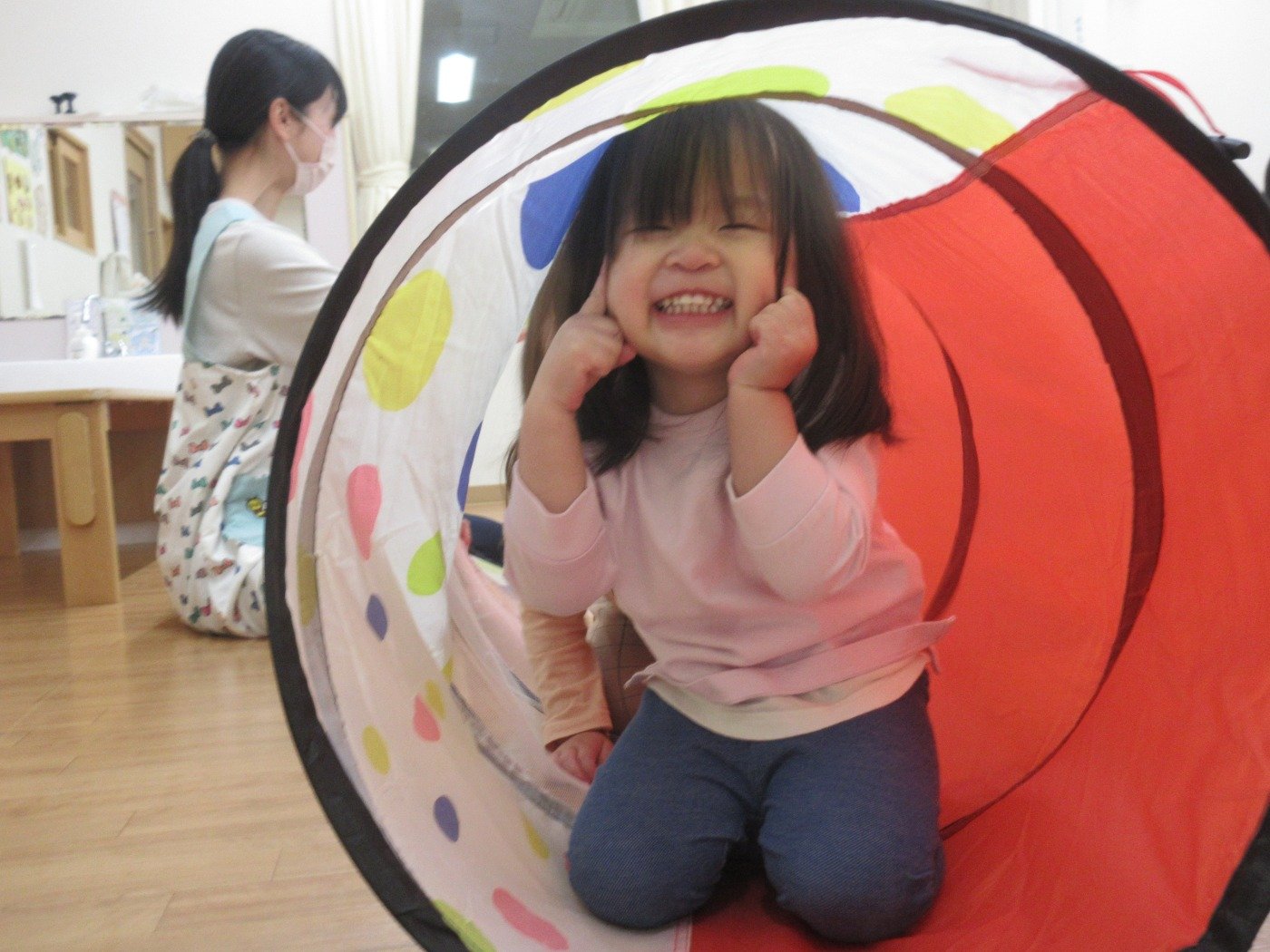 トンネルからお友だちが出てくると、「ばあ~」と顔を見合わせ笑い声が絶えない様子。