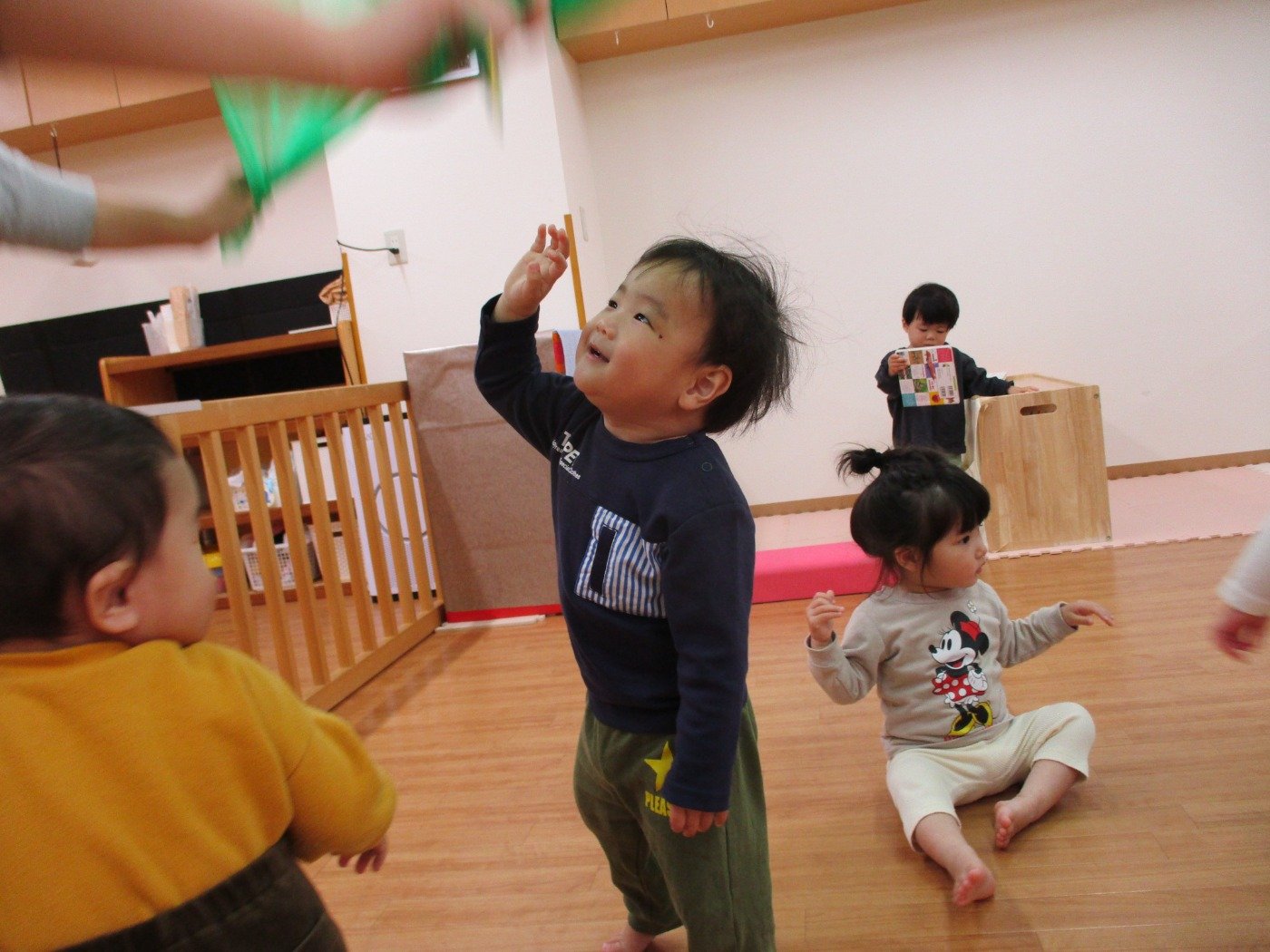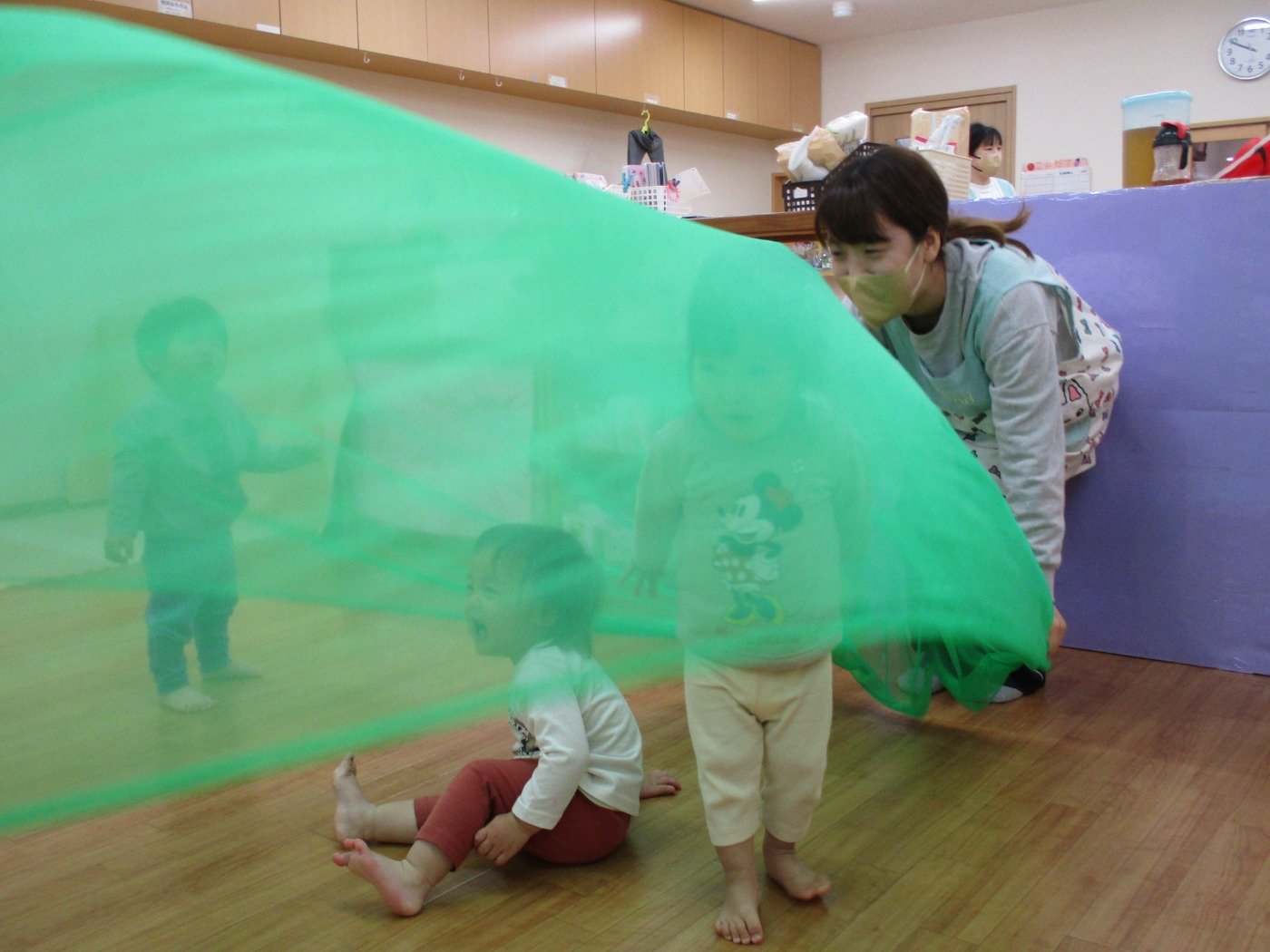 うさぎ組さん ホームブログ 2023.04.12 うさぎ組さんのお部屋からも、子ども達の賑やかな声が・・・ 「うえからしたから おおかぜこい♪」 優しい歌声に合わせて オーガンジーの布に包まれる子ども達。 布に触れたくて、背伸びをしながら腕をめいっぱいあげ、心地よい風や 布の感触を十分に楽しみました。