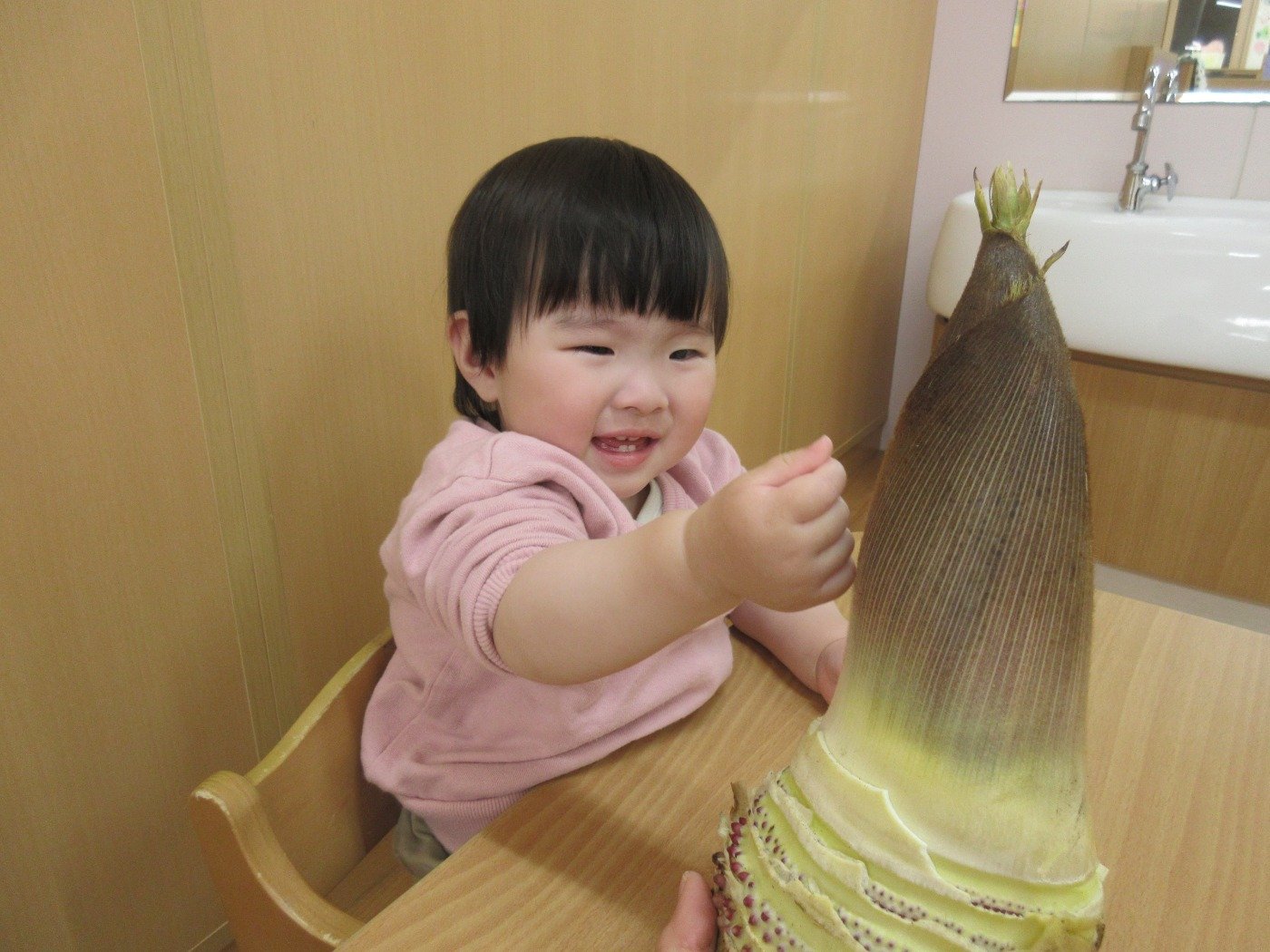 興味津々な子ども達。 自分のお顔よりも大きなタケノコに驚きながらも、
