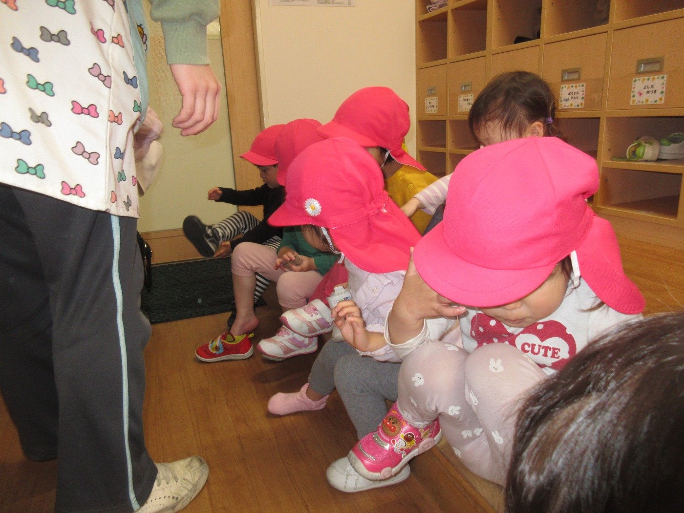 身支度も一生懸命な子ども達。早くお外に行きたい気持ちが先走りそうになりながらも、