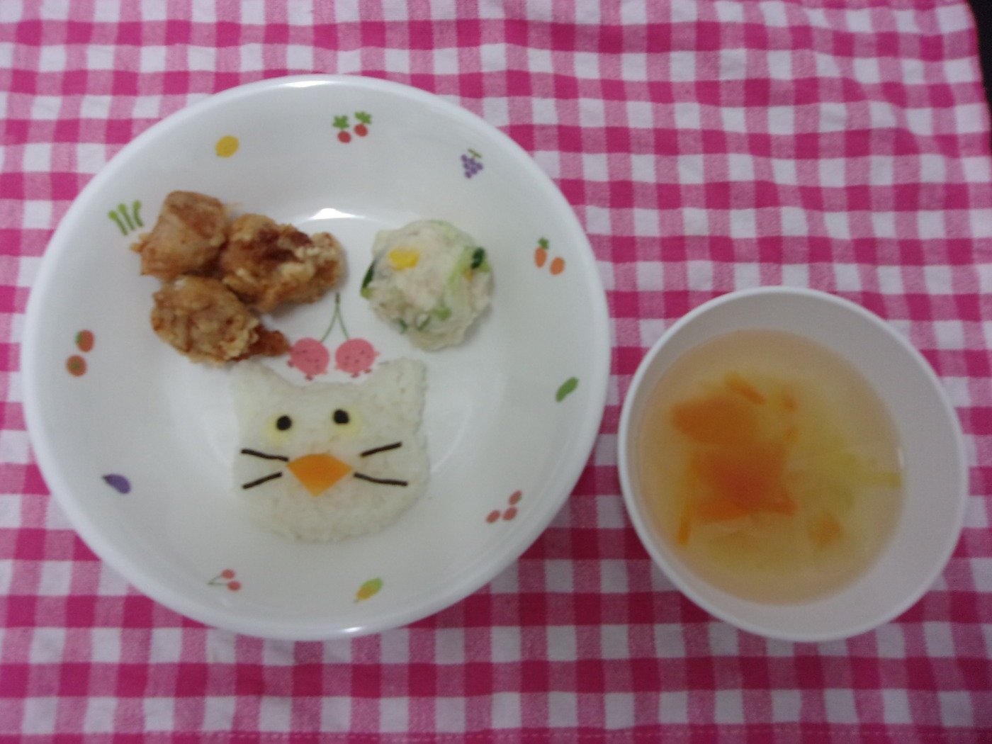 子ども達に大人気の とりのから揚げ ポテトサラダ コンソメスープ