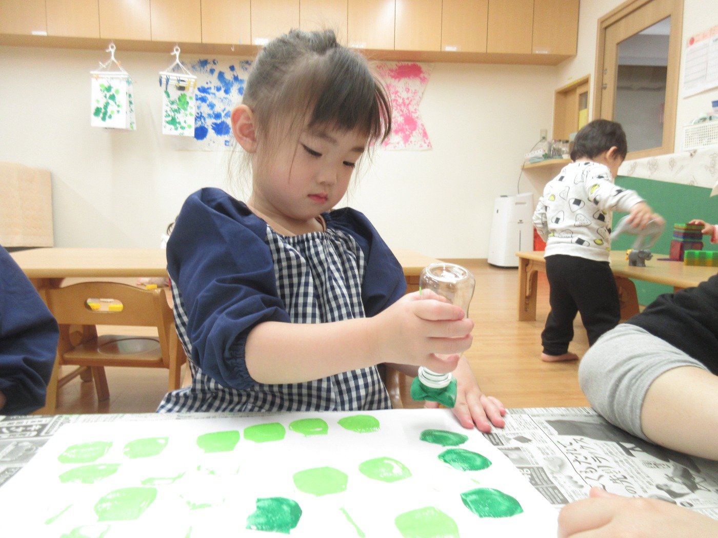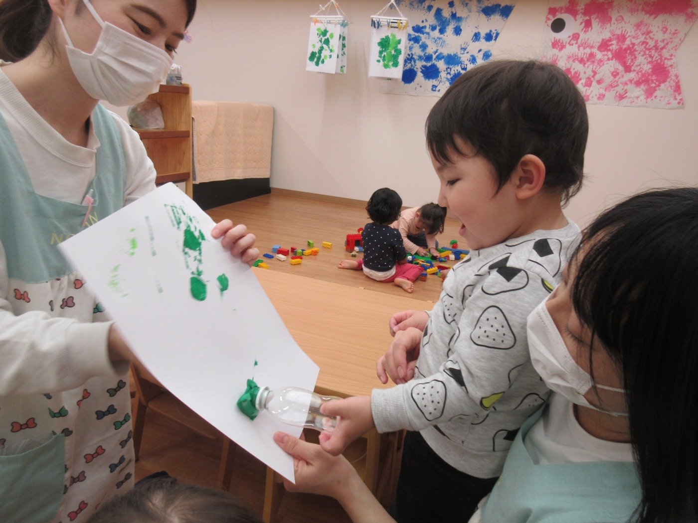 くま組さん ホームブログ 2023.04.20 今日は、お部屋でスポンジスタンプをしました。 2色の色が混ざらないように、感覚をよく見ながら慎重にスタンプしたり、 力加減で形が変わるので、スタンプするたびスティックをひっくり返し スポンジをまじまじ観察したり・・・ 画用紙いっぱいにスタンプ遊びを楽しみました😊