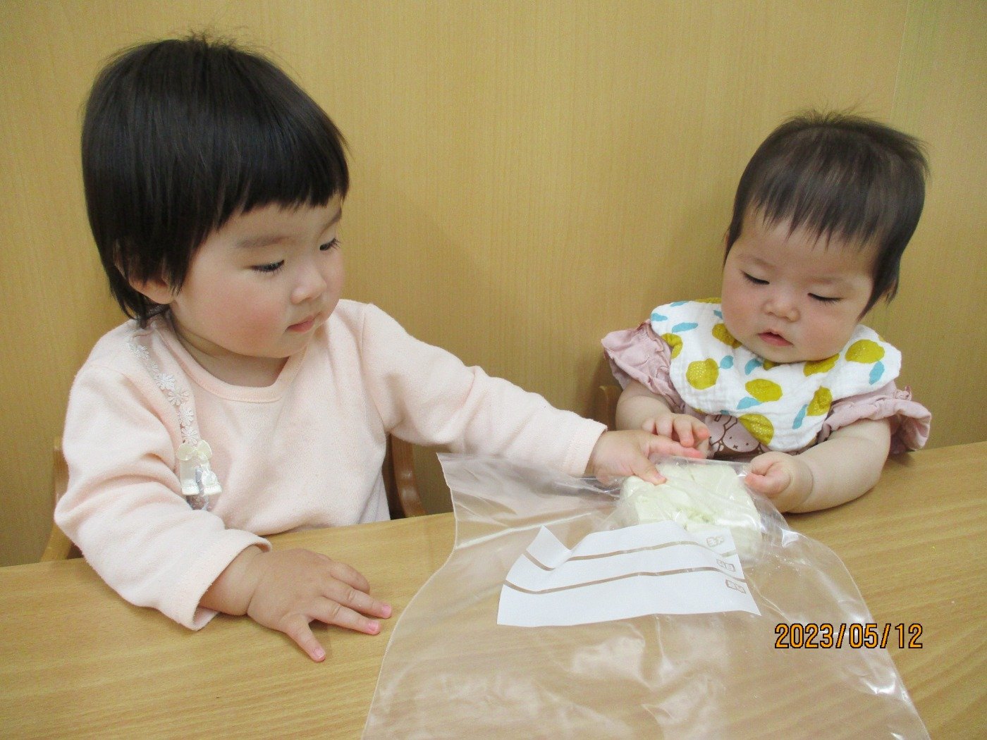 今日は、いつもみんなが食べ慣れている食材を使って感触遊びをしました。