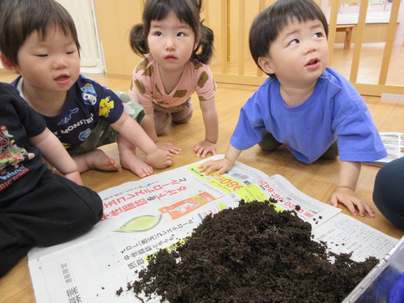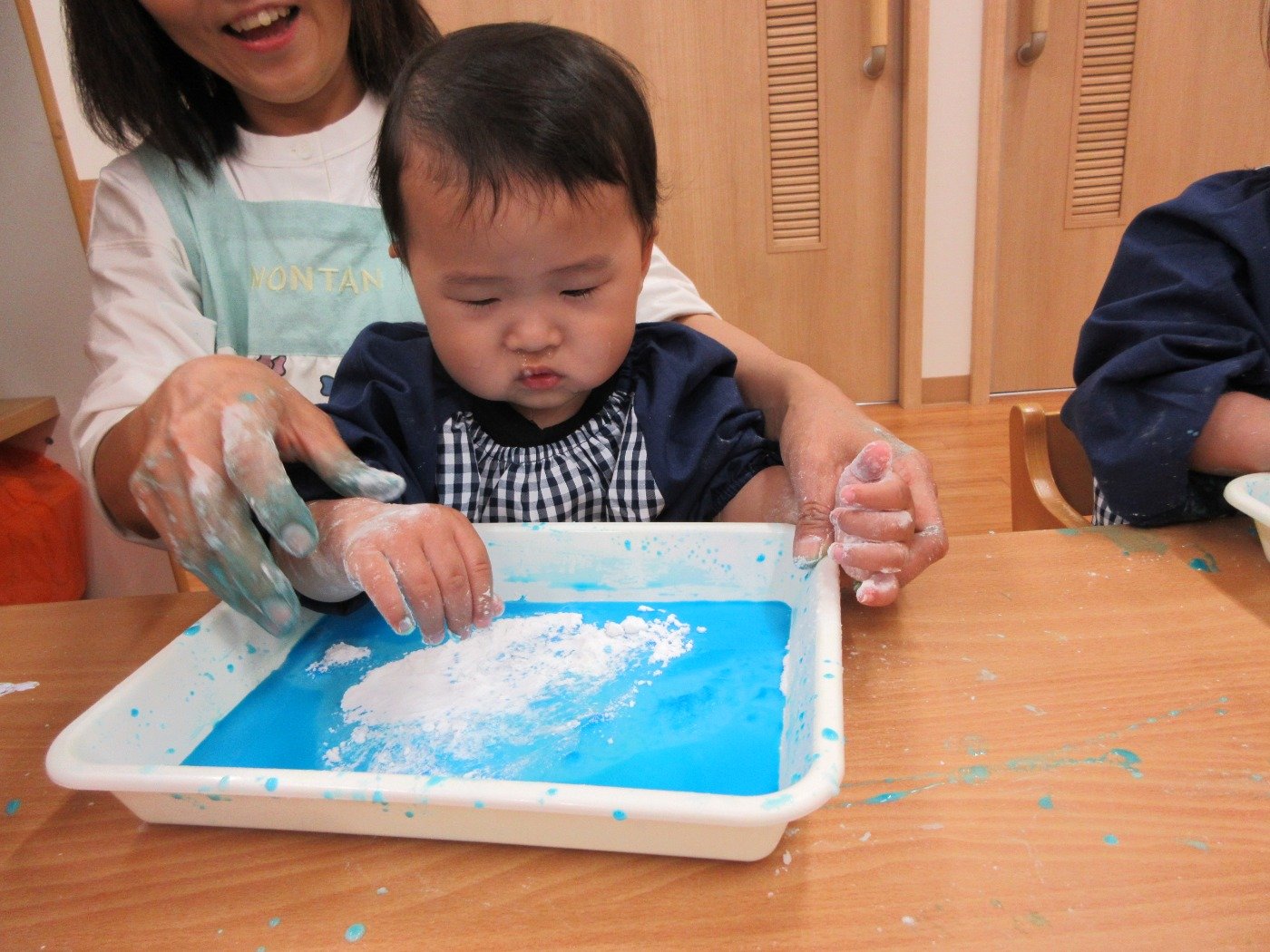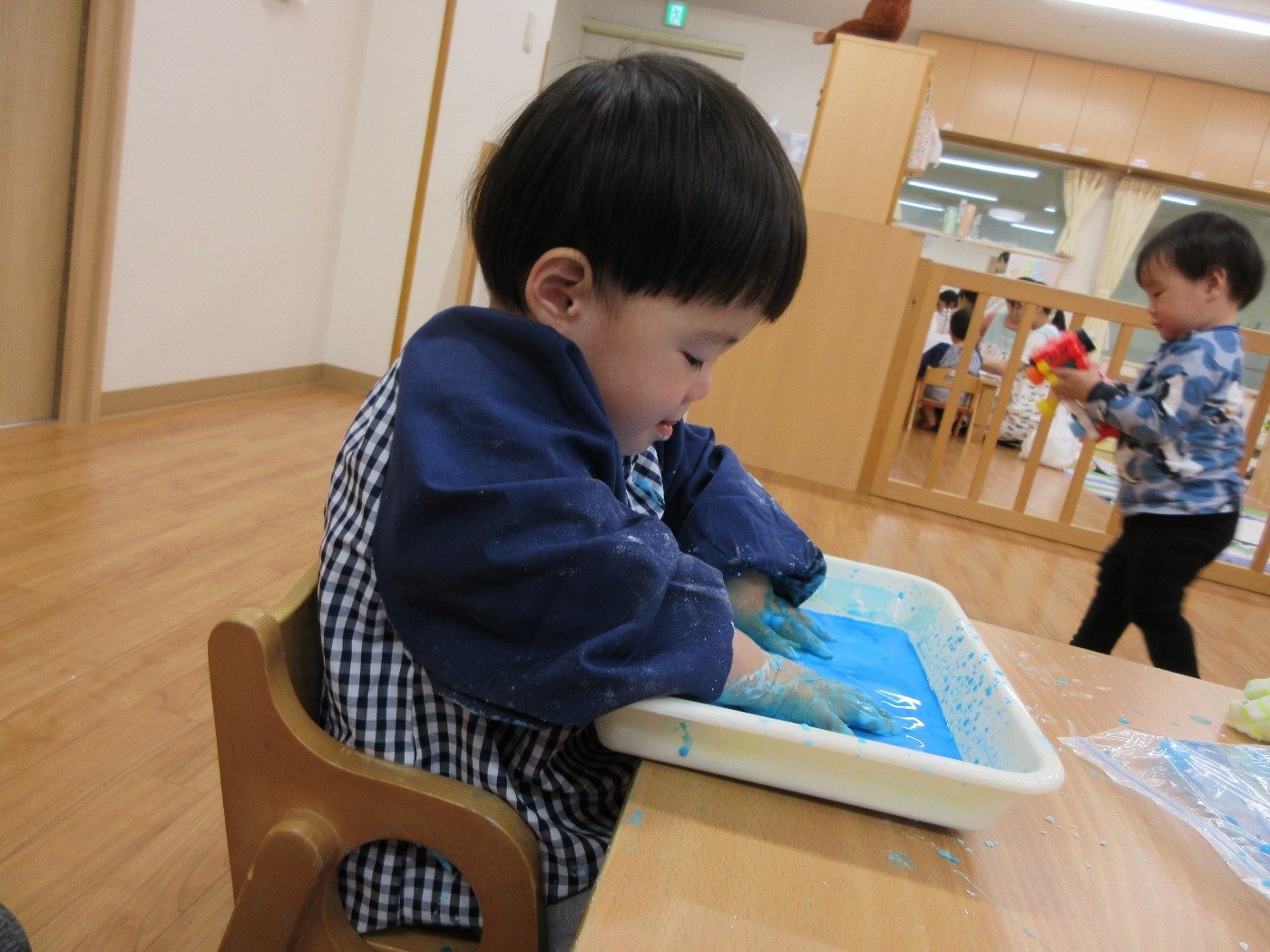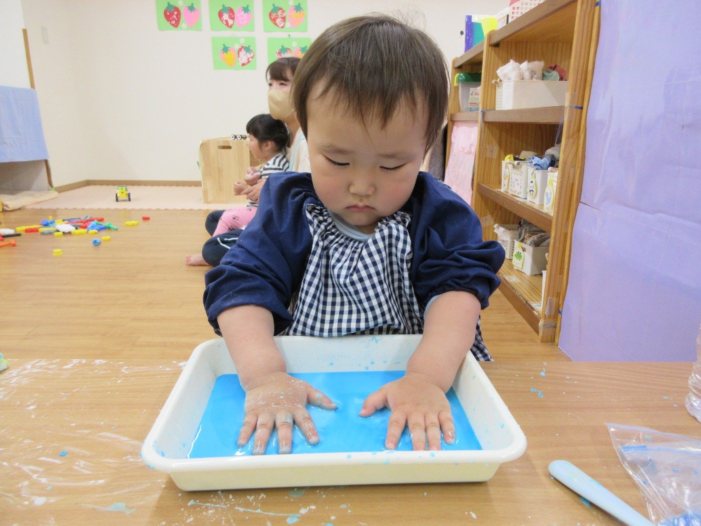 お天気が悪い日は、お部屋でいろいろな感触遊びをするのに絶好のチャンス!