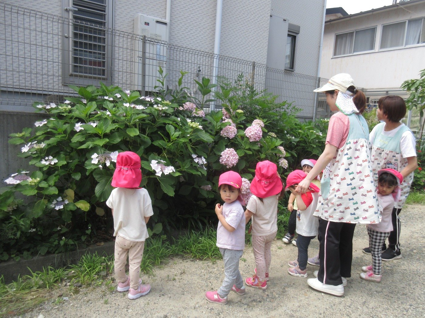 「ぴんく!」「あお!」と、いろいろな色の紫陽花を見つけたり、、