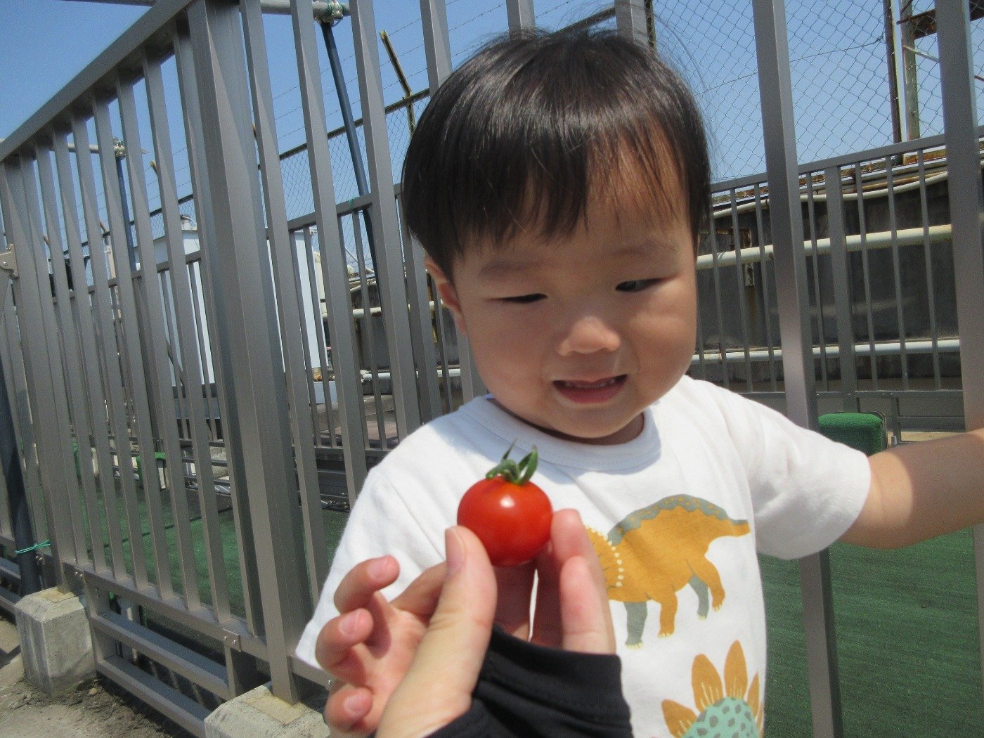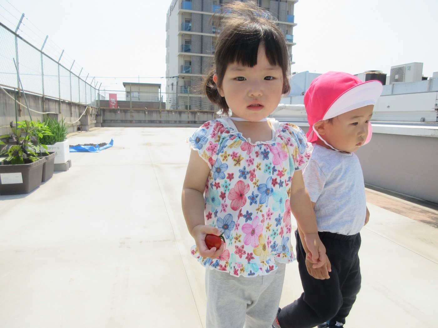 朝のおやつ後、うさぎ組さんは、ひろばで栽培している夏野菜の収穫に出かけました。