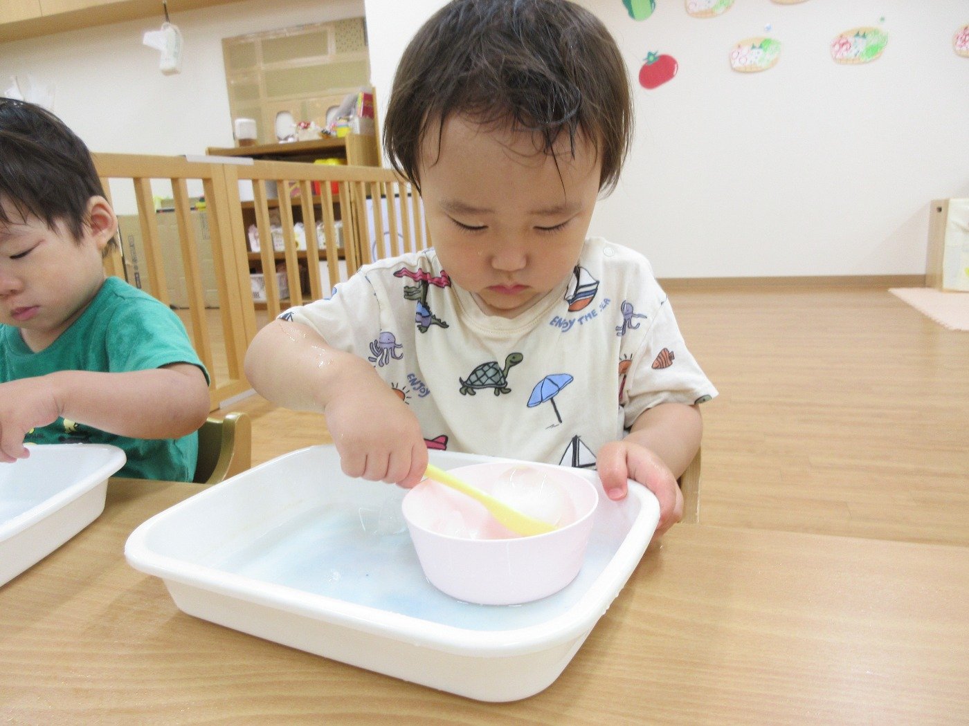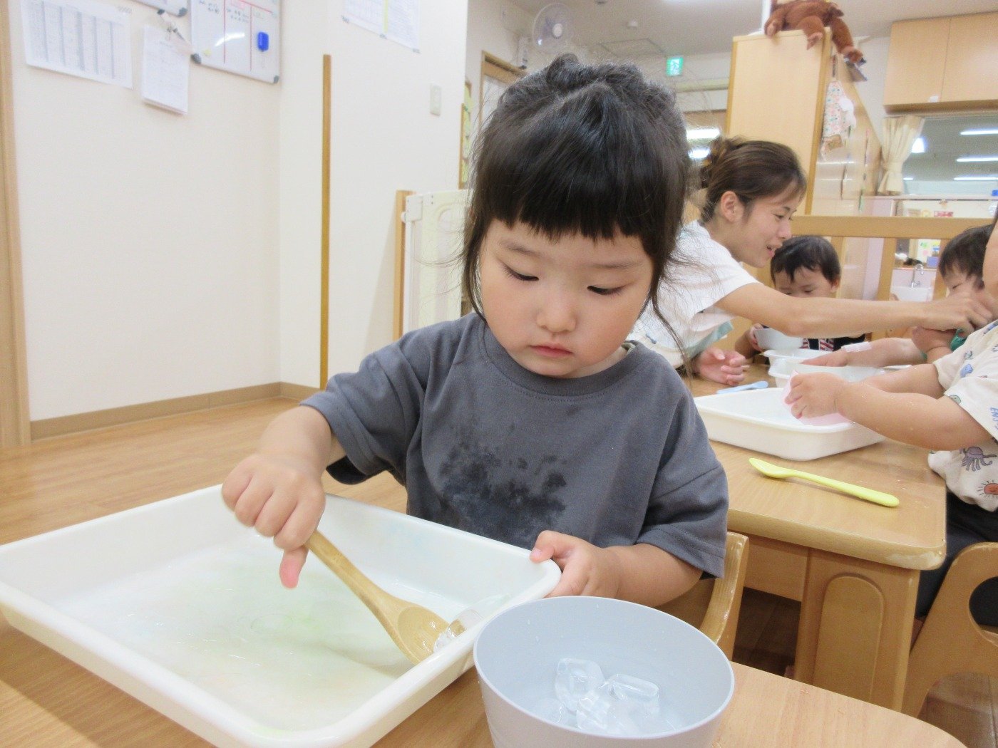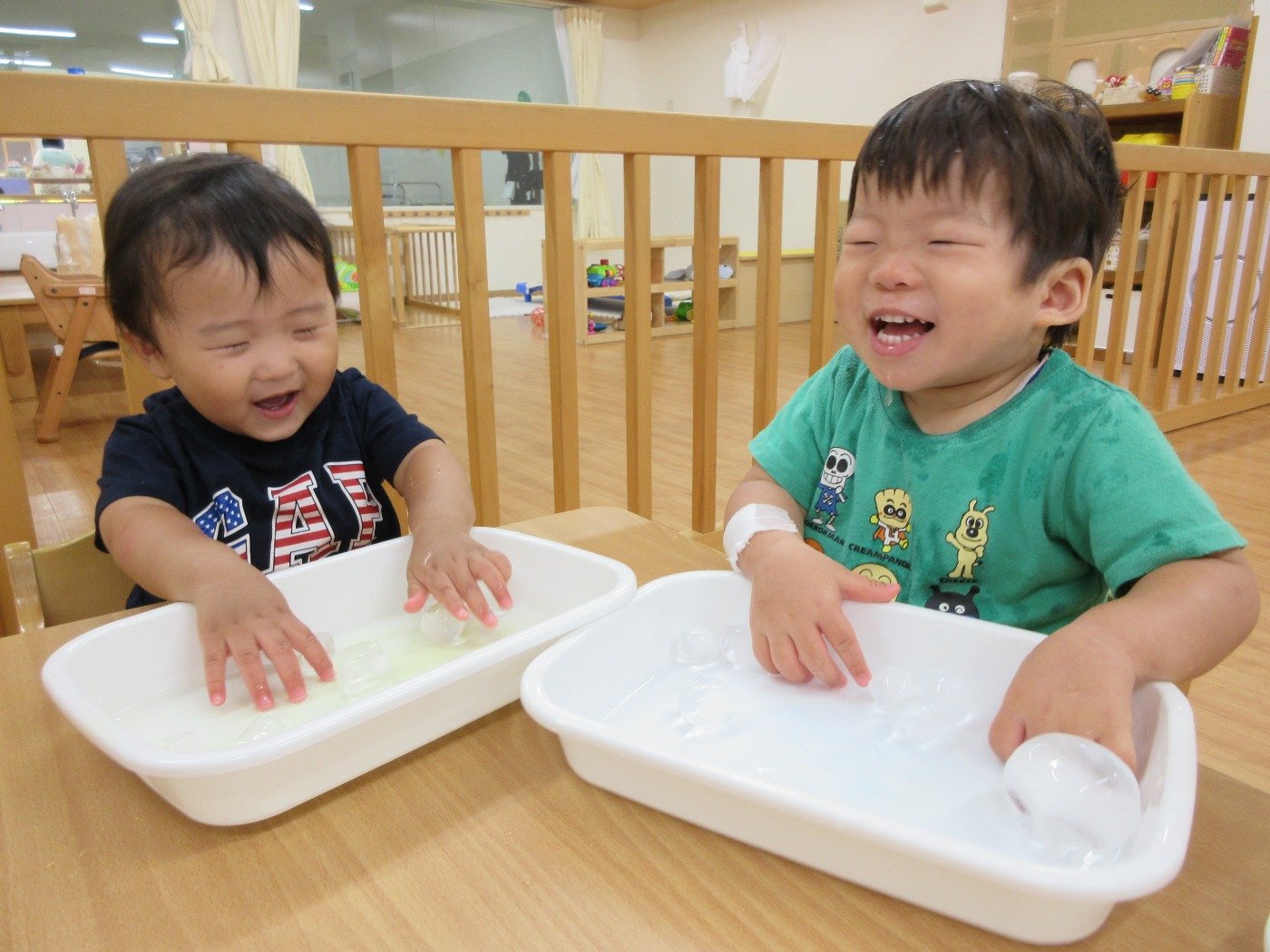 うさぎ組さん ホームブログ 2023.07.25 今日は、お部屋で氷遊びをしました。 四角い氷・まんまるな氷・大きい氷・小さい氷・・・ 様々な氷に触れ、「わあ!」「ちゅめたい」と触れては、ひょいっと手を引いてみたり。 どんどん小さくなっていく氷を、不思議そうに見つめたり、指先でつまんでは滴る冷たい水に 大喜びな子ども達。 透明な氷越しに、保育士と目が合うとキラキラな笑顔で応えてくれる可愛い姿も見られましたよ😊