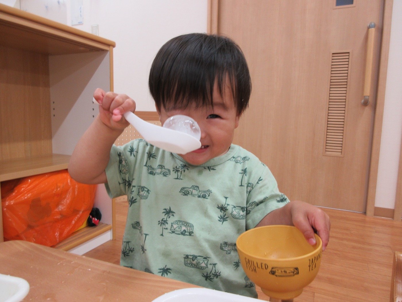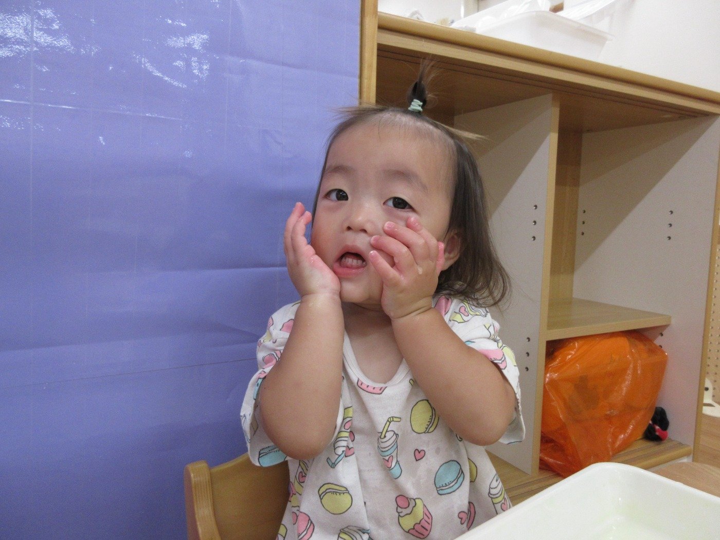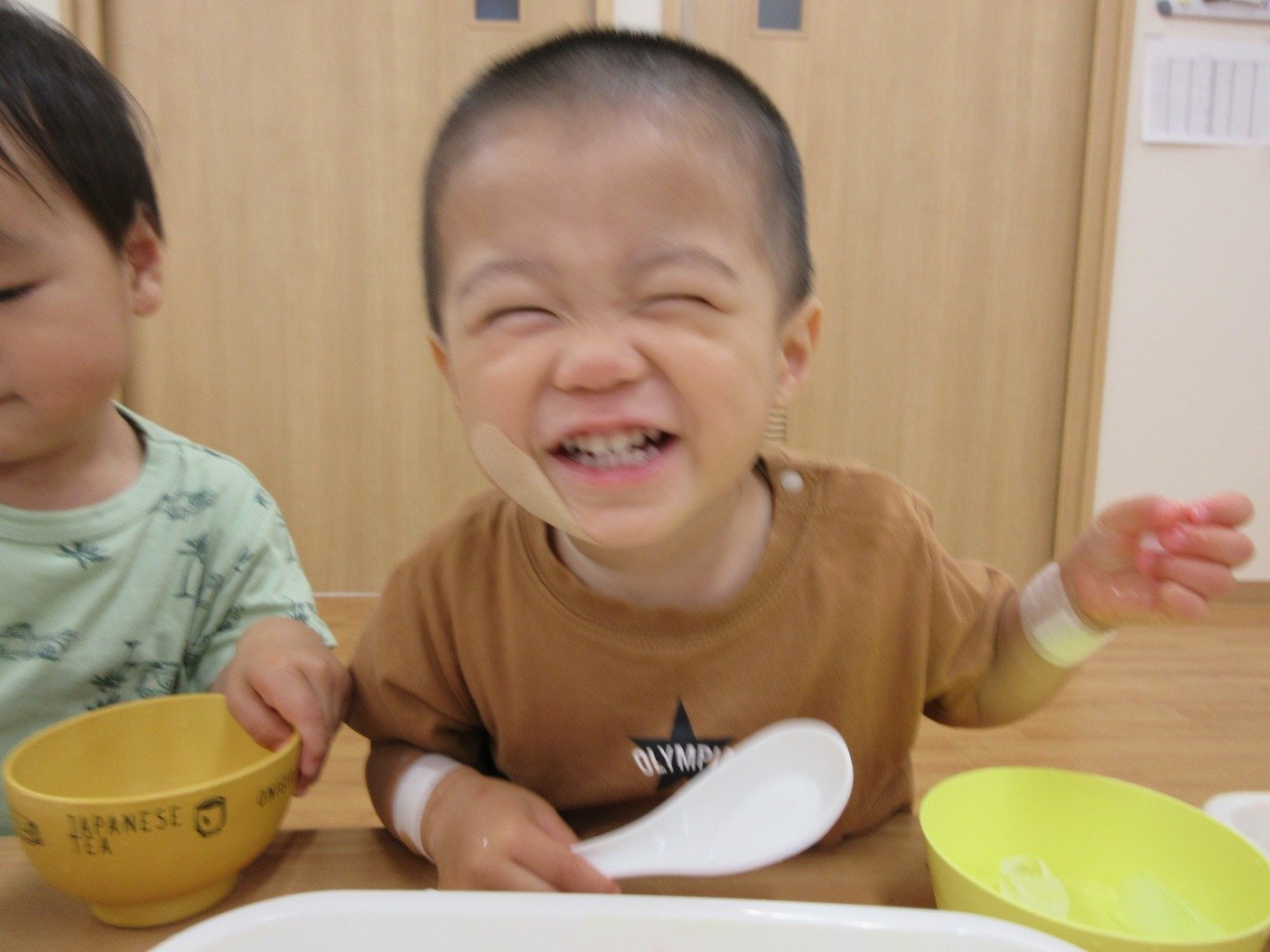 うさぎ組さん ホームブログ 2023.07.25 今日は、お部屋で氷遊びをしました。 四角い氷・まんまるな氷・大きい氷・小さい氷・・・ 様々な氷に触れ、「わあ!」「ちゅめたい」と触れては、ひょいっと手を引いてみたり。 どんどん小さくなっていく氷を、不思議そうに見つめたり、指先でつまんでは滴る冷たい水に 大喜びな子ども達。 透明な氷越しに、保育士と目が合うとキラキラな笑顔で応えてくれる可愛い姿も見られましたよ😊