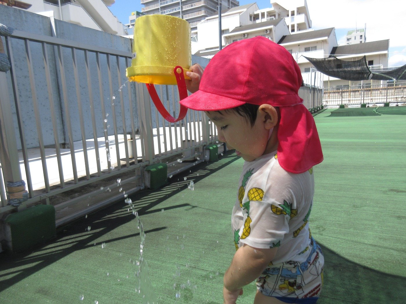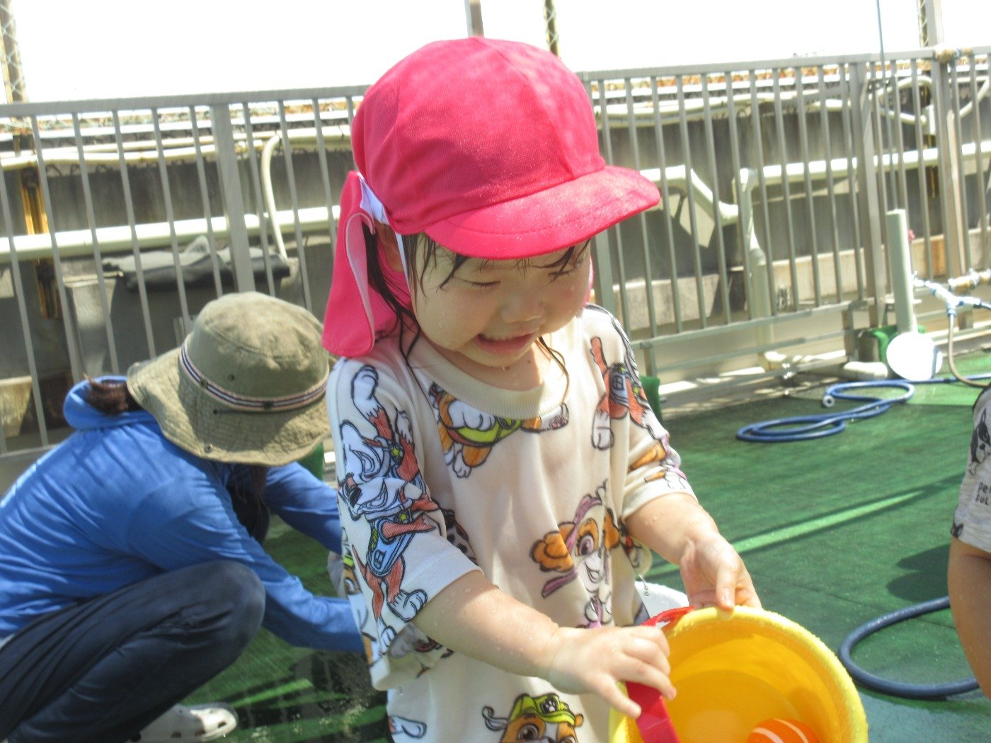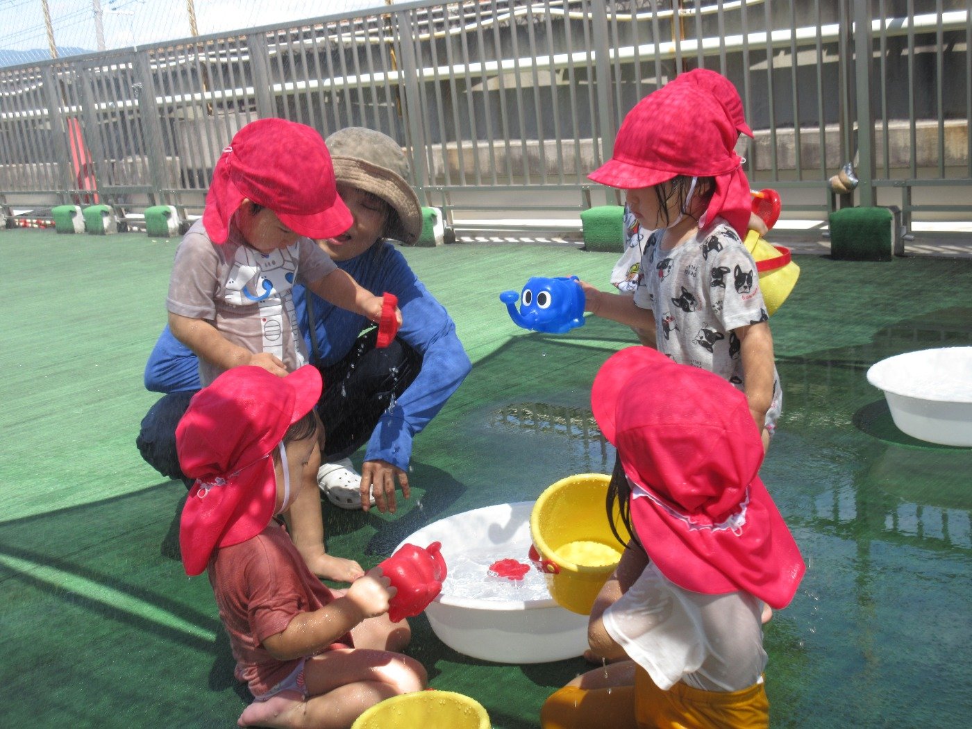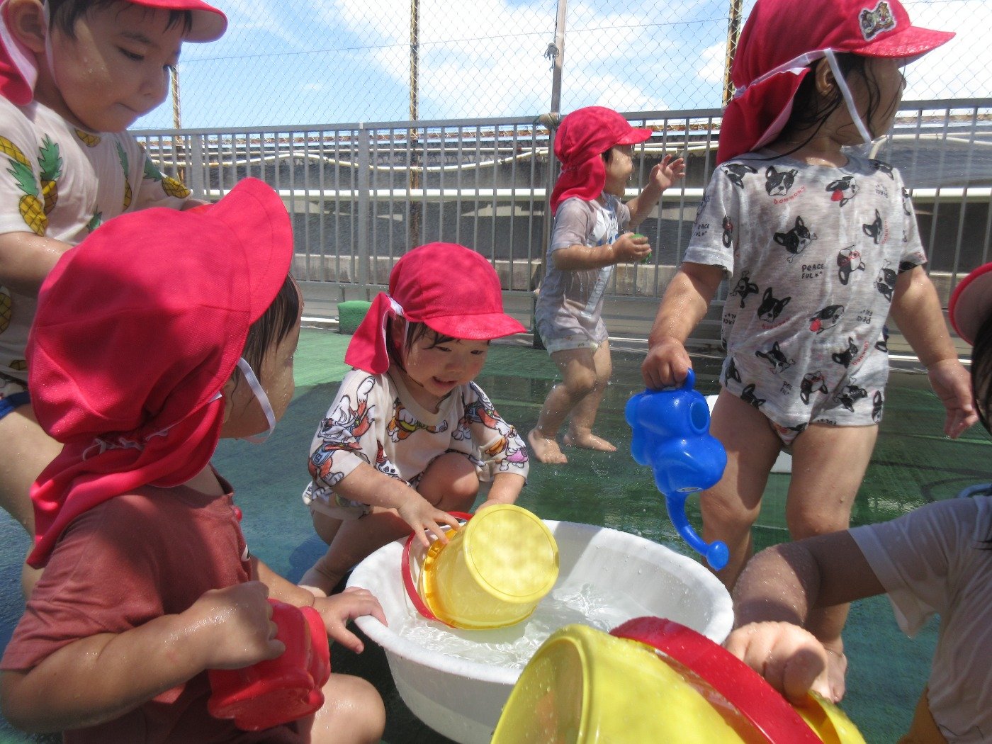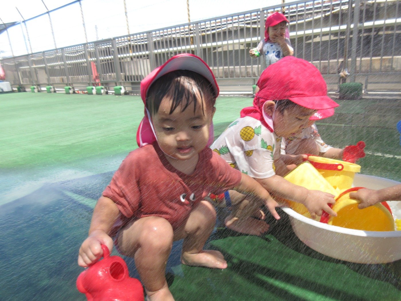 今日はうさぎぐみさんと、くまぐみさんと一緒に水遊びをしました。