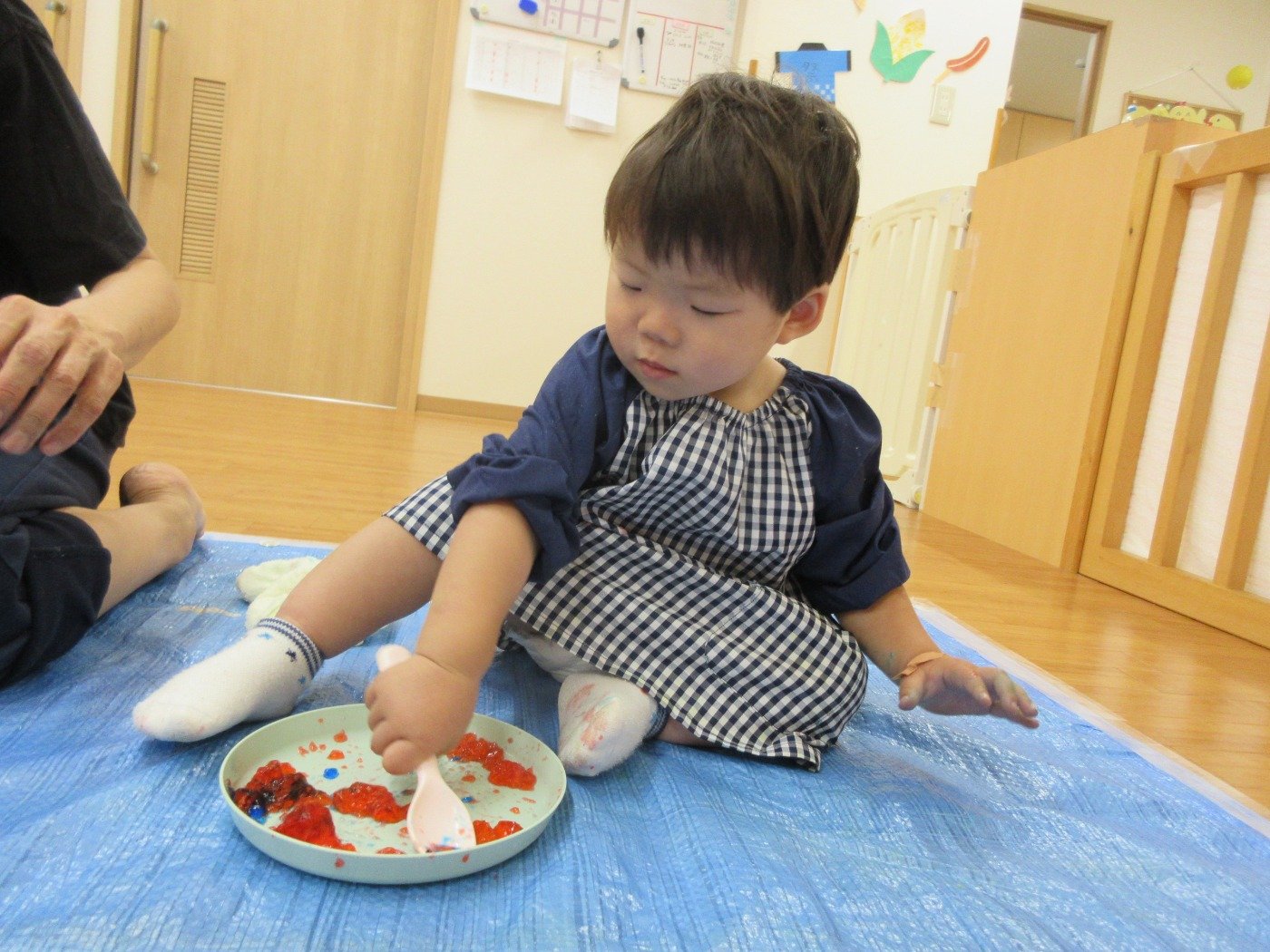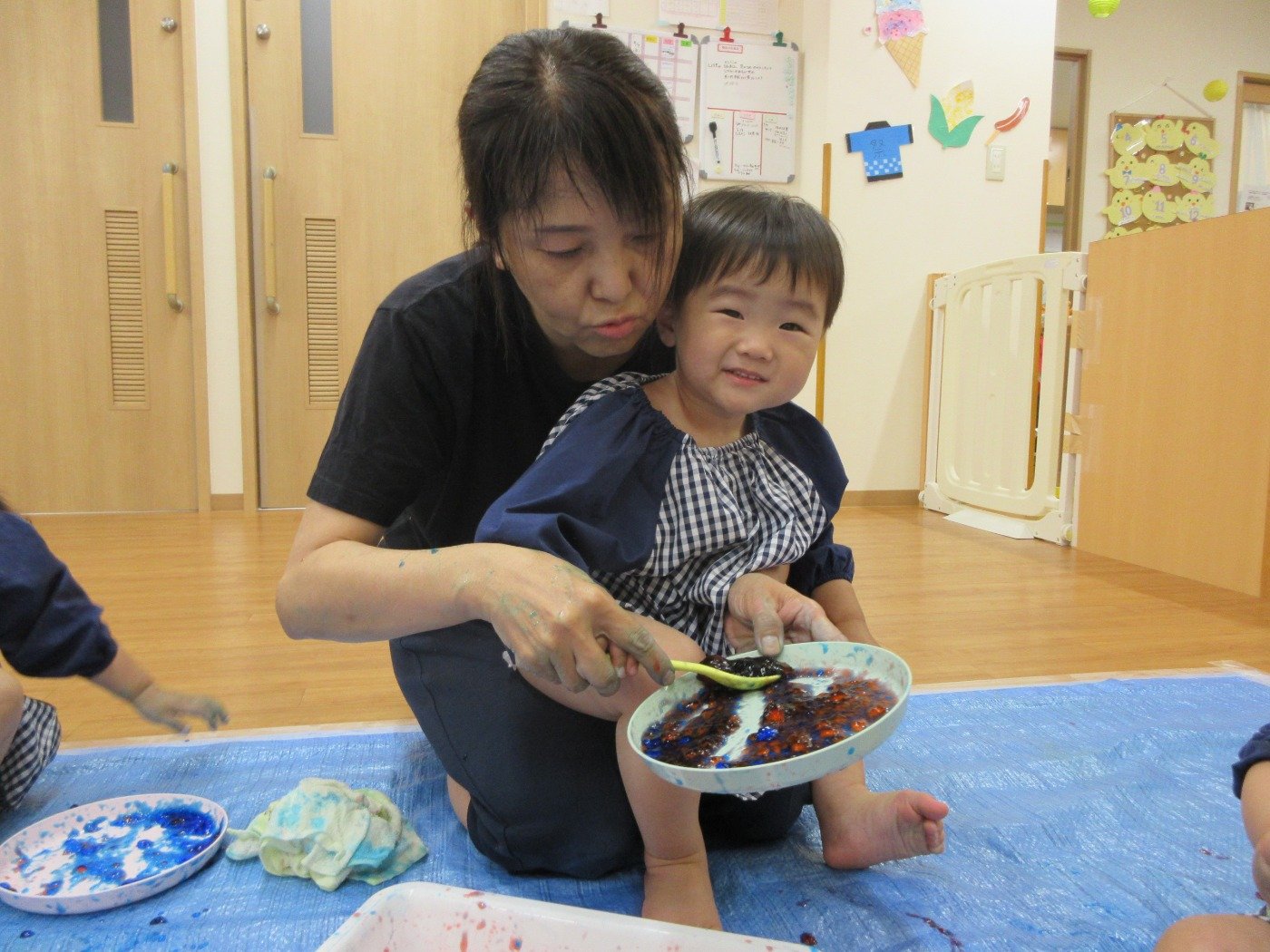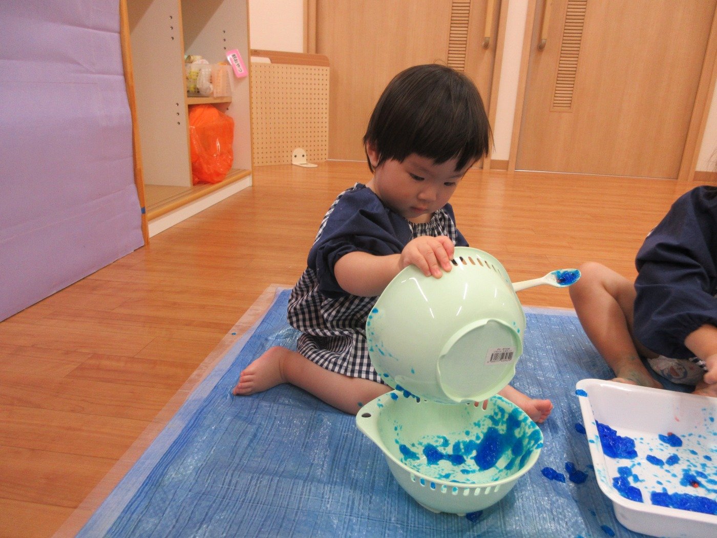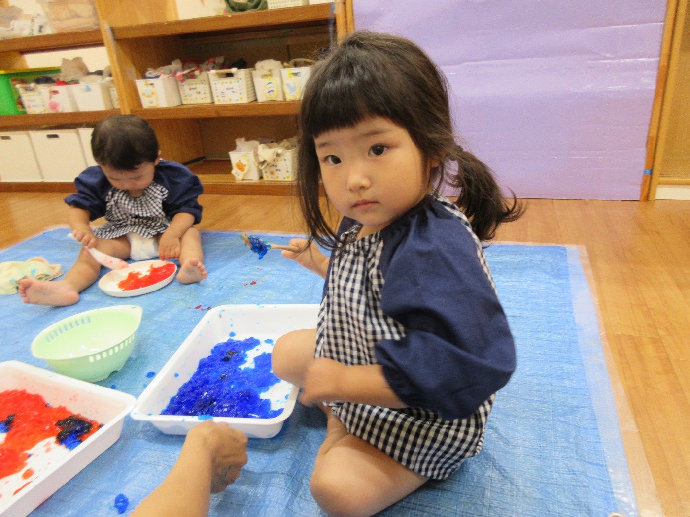 はじめての感触!ドキドキしながらも、あっという間に寒天遊びを楽しむ姿が見られました。