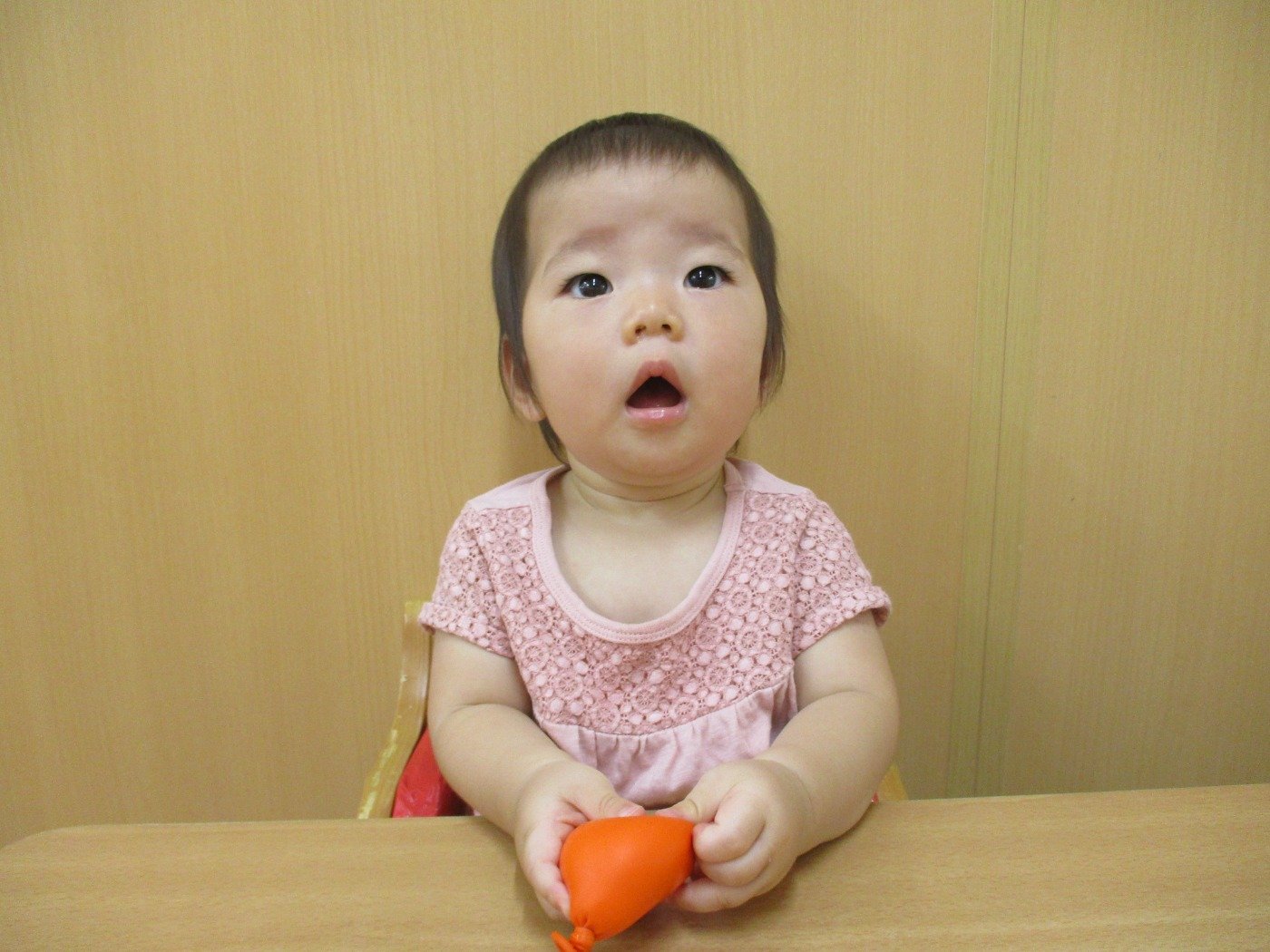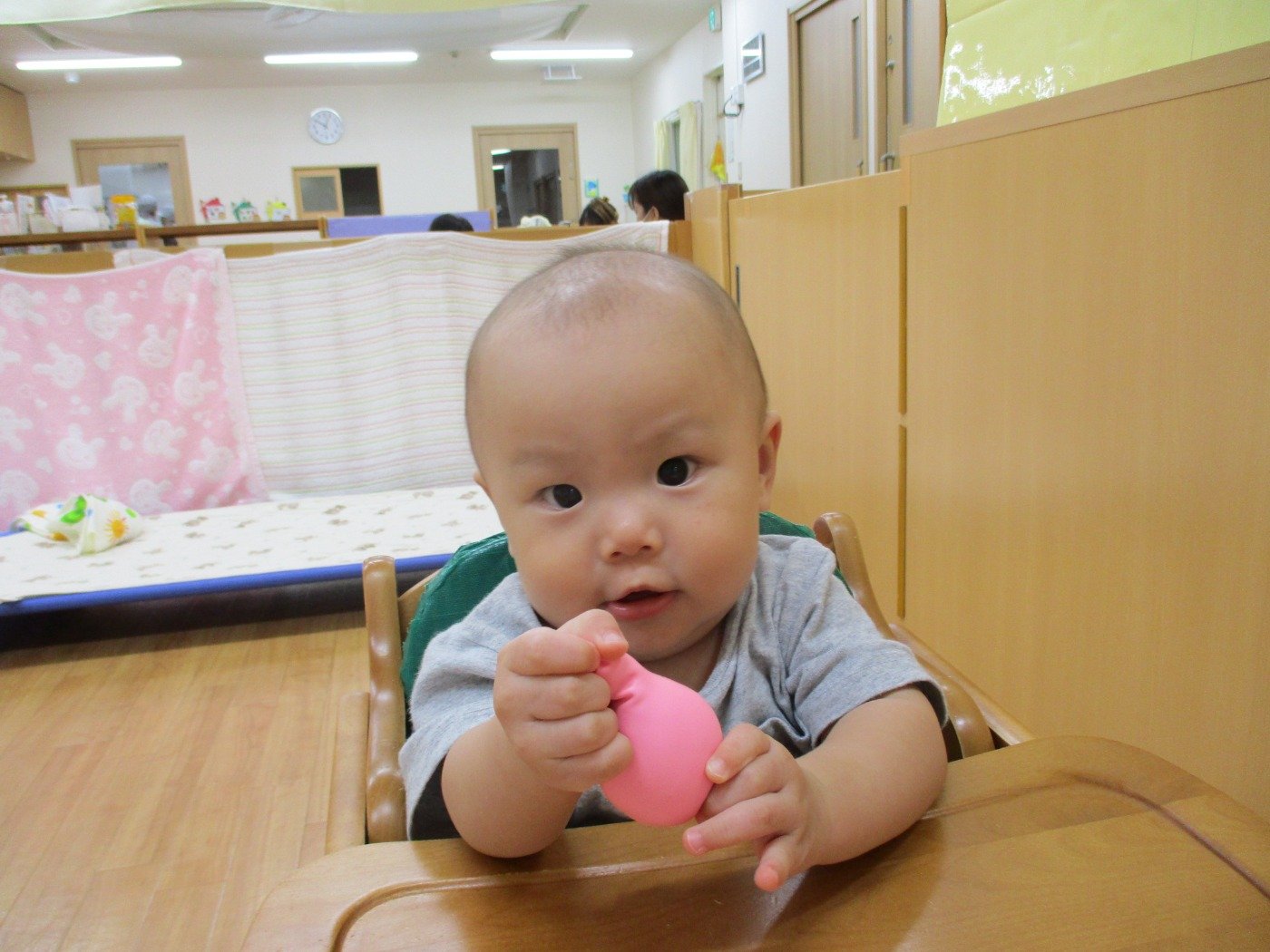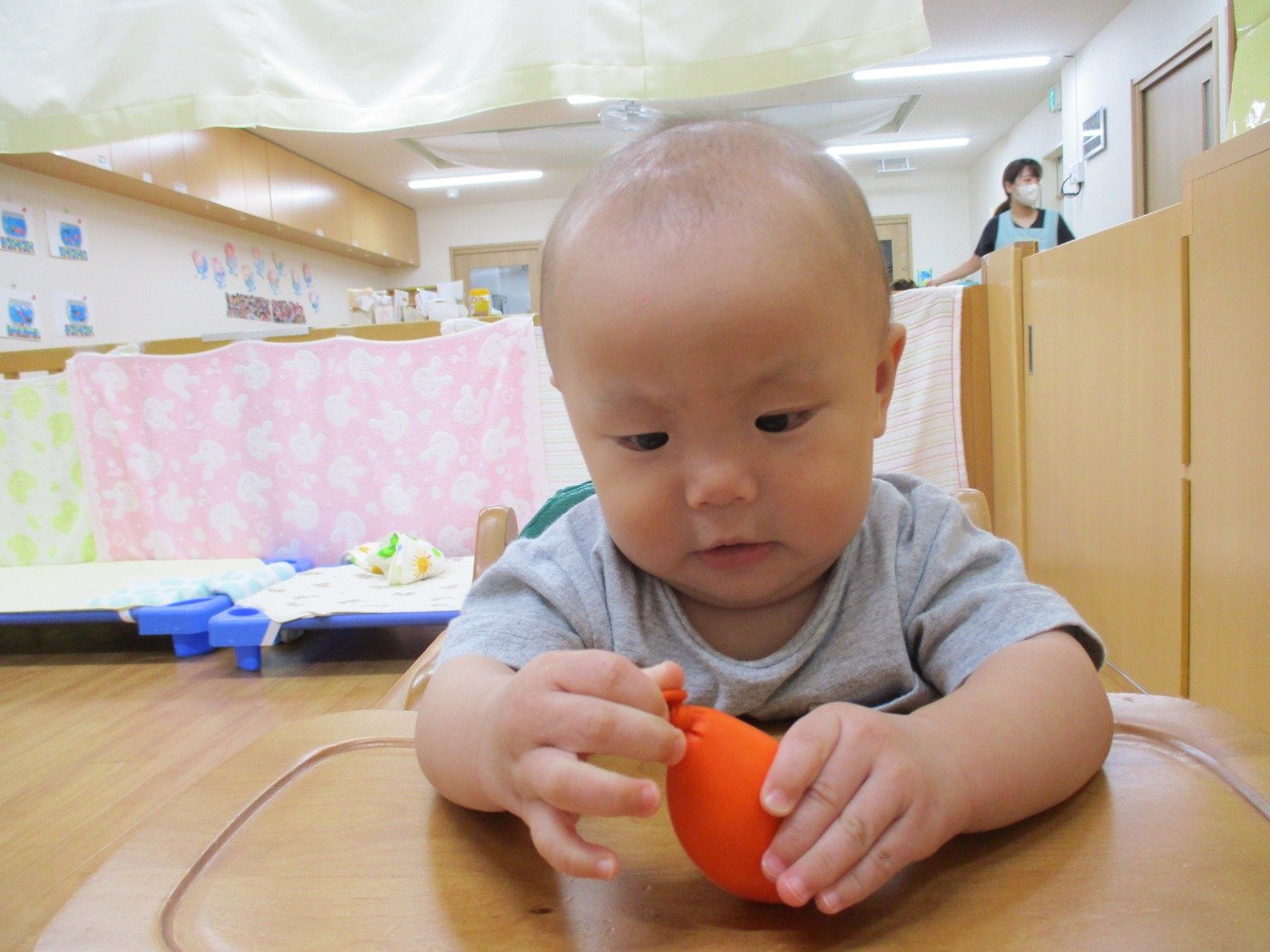 「ムニュムニュ~」「きゅっきゅ~」と声を掛けると、握ったり離したり、お顔に近づけたり、ちょっぴり?お口で確かめたりと