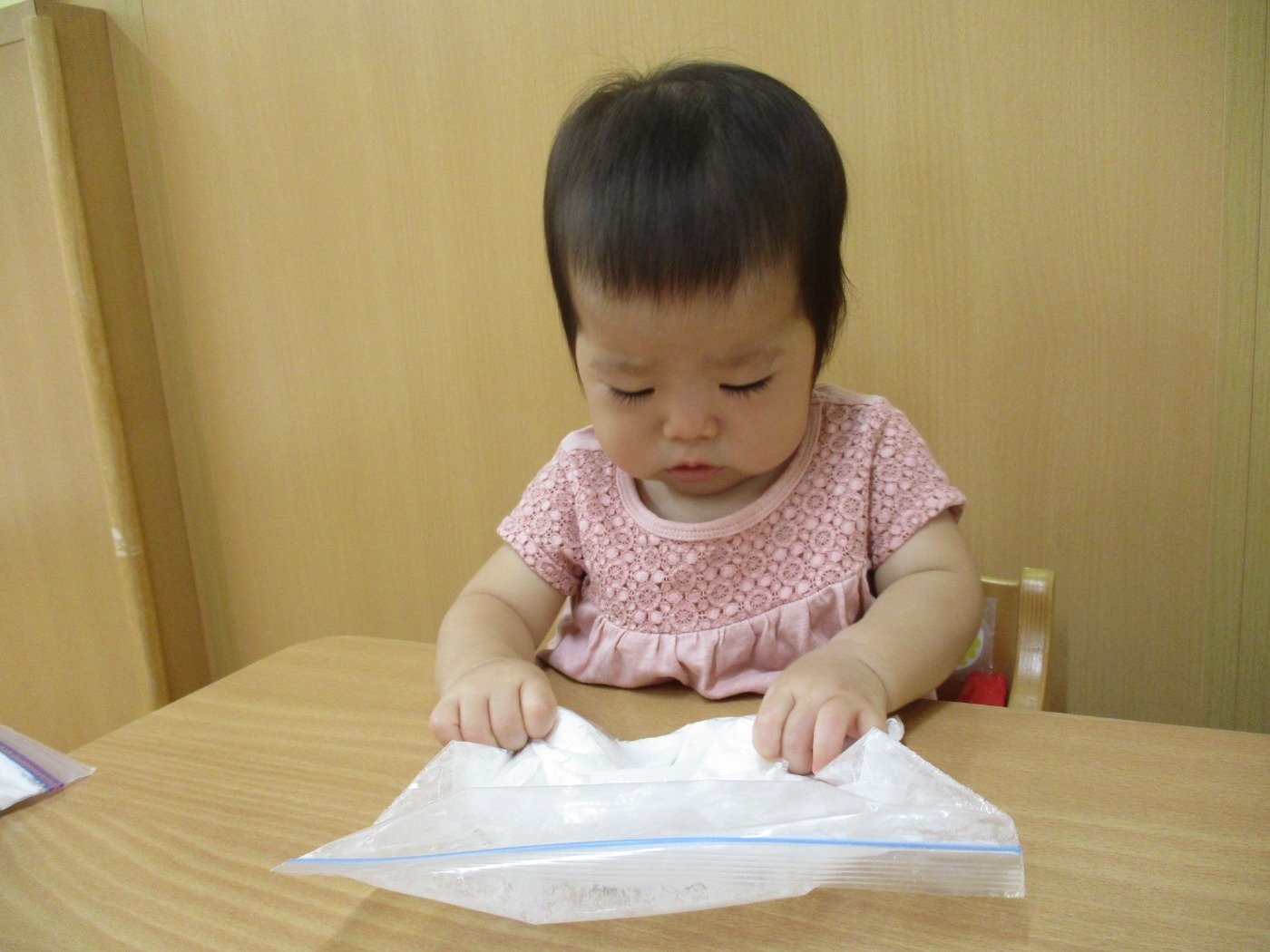 *感触遊び! 片栗粉とお水を風船に入れてたもの、ジップロックに入れたもの 2種類準備されていました。