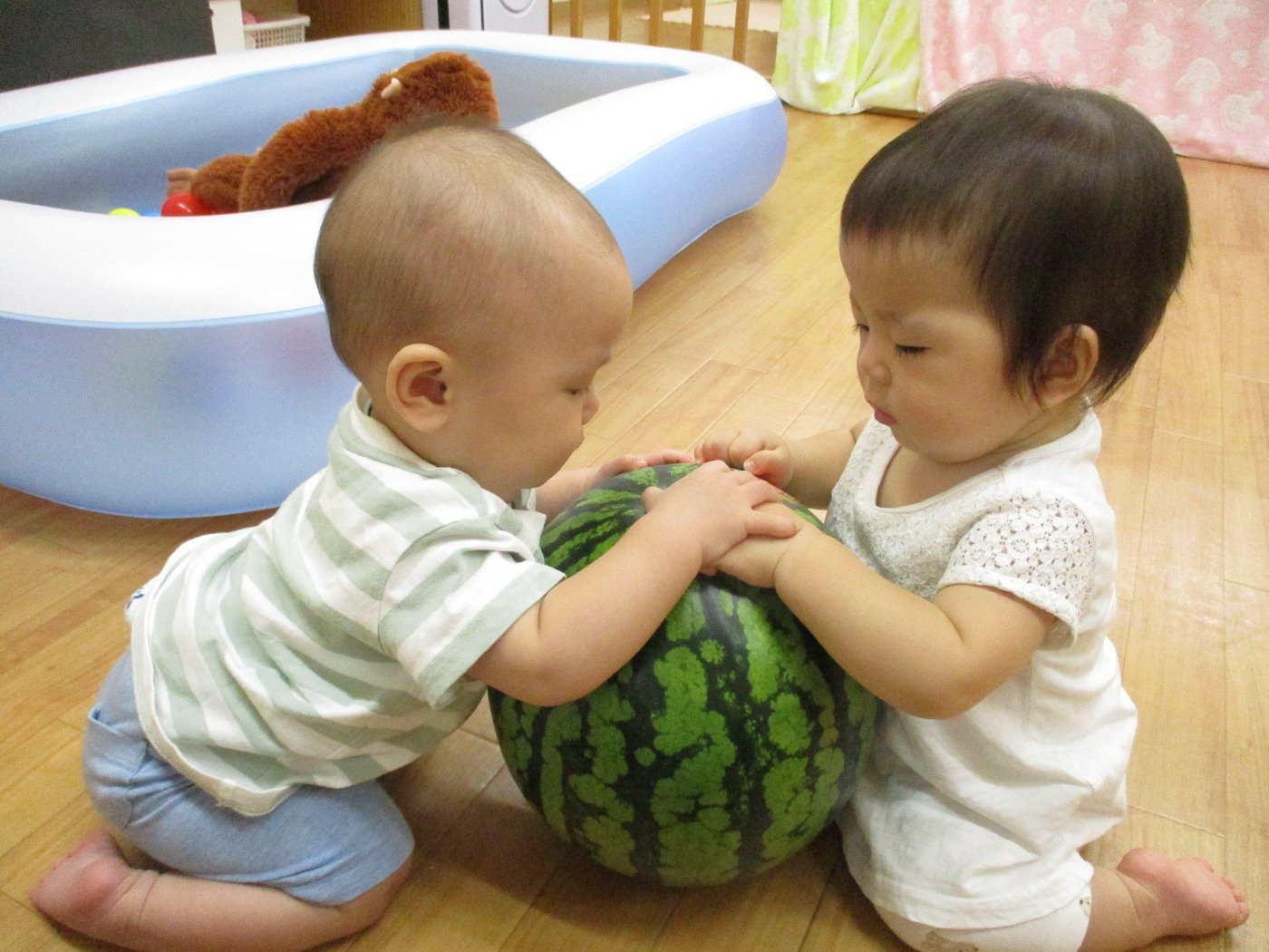お部屋に帰ってから、スイカに触れたり、「トントン」と叩いてみたり。