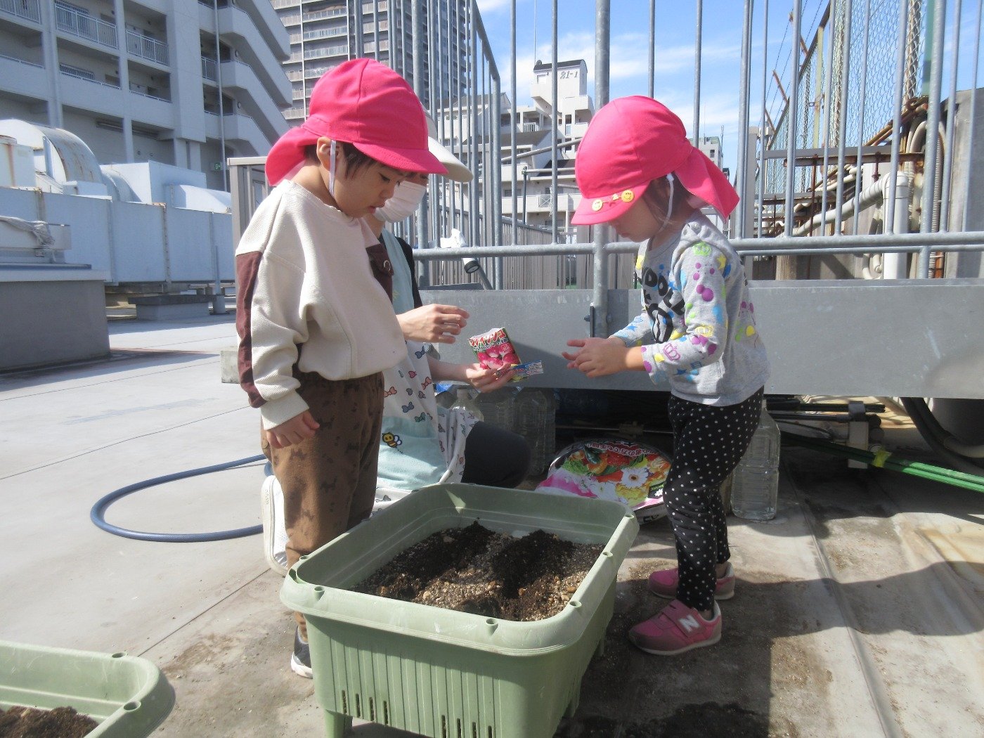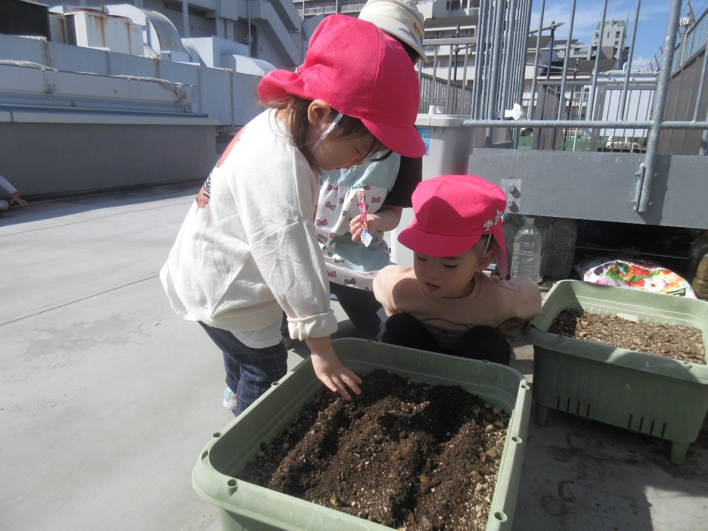 くまぐみさん ホームブログ 2023.10.11 今日は広場にある、プランターに、 野菜の種まきをしました。 こかぶ ラディッシュ サラダほうれんそう の三種類の種。 「おおきくなってね」の気持ちを みんなで込めてまきました。 これからお水やりもしていこうね。 成長が楽しみです!