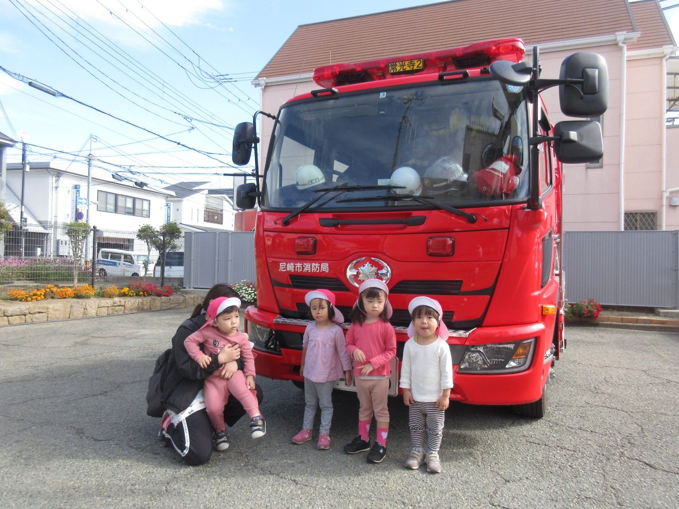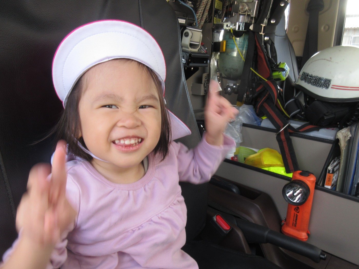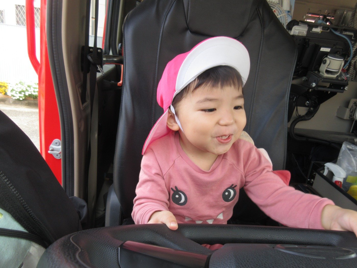 くまぐみさん ホームブログ 2023.10.23 今日は東消防署までお散歩に行きました。 大きな消防車に大喜びの子どもたち♪ 消防車の中にものせてもらいました! いろいろなものがあるな~と、きょろきょろしたり、、 ハンドルをまわしてみたりと、、 興味津々で、とっても楽しんでいましたよ♪ その後、城の後公園へどんぐり拾いに行きました♪