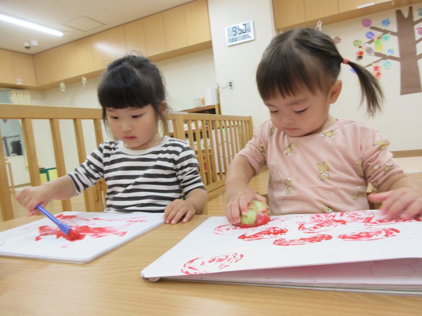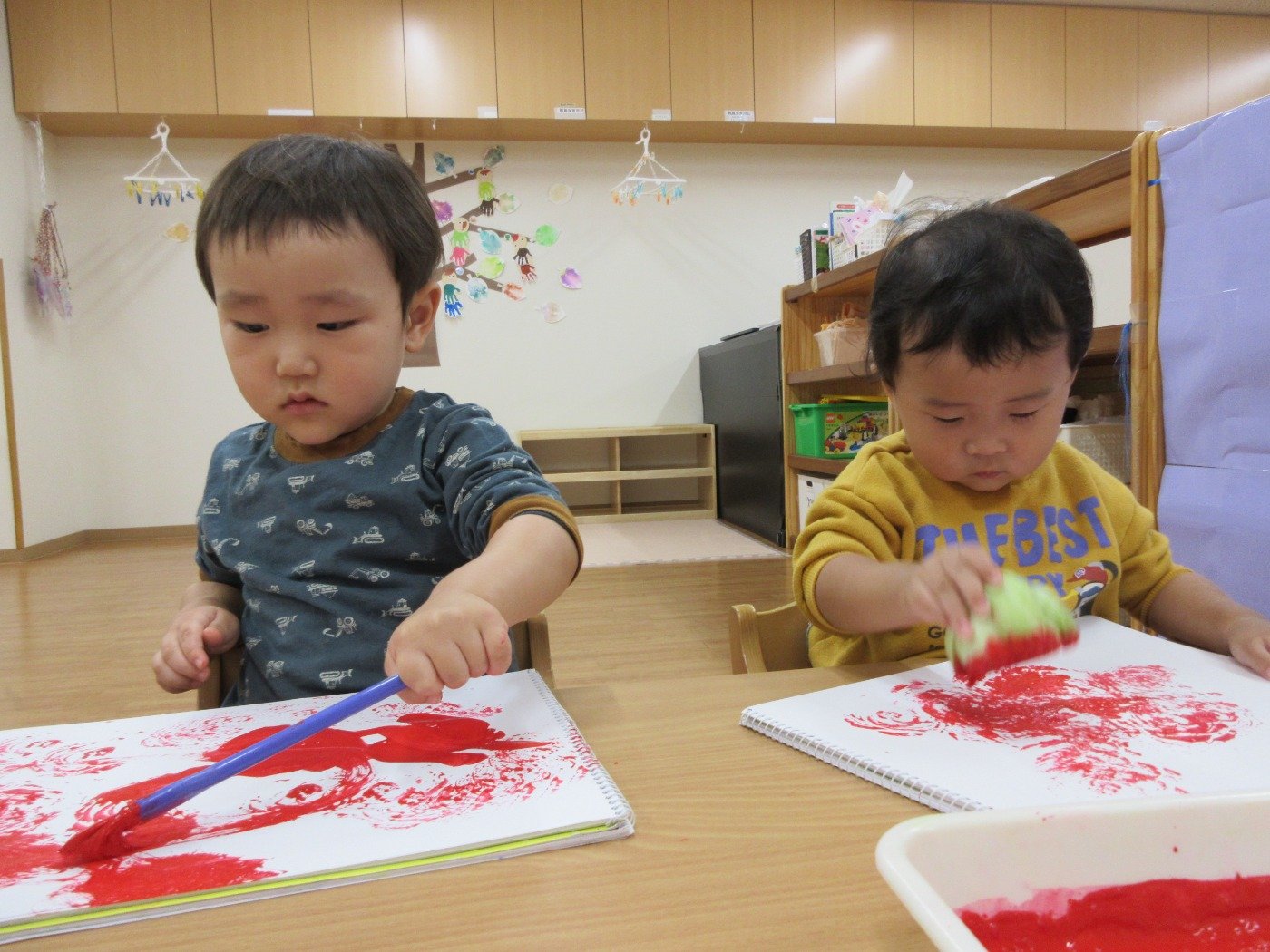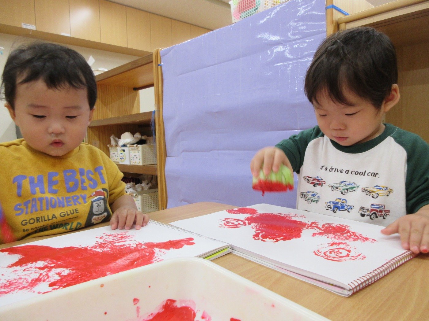 うさぐぐみさん ホームブログ 2023.11.10 今日はチンゲン菜を使って野菜スタンプをしました。 ぎゅっぎゅっとしっかりチンゲン菜を押して 感触や色がつくのを、楽しんでいました! 画用紙いっぱいに色がつくくらい、夢中に なって取り組んでいましたよ♪